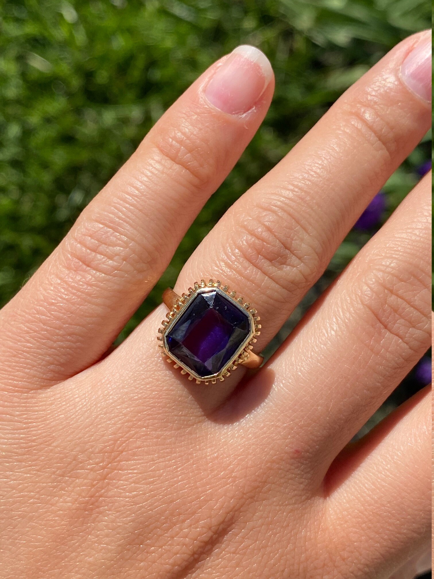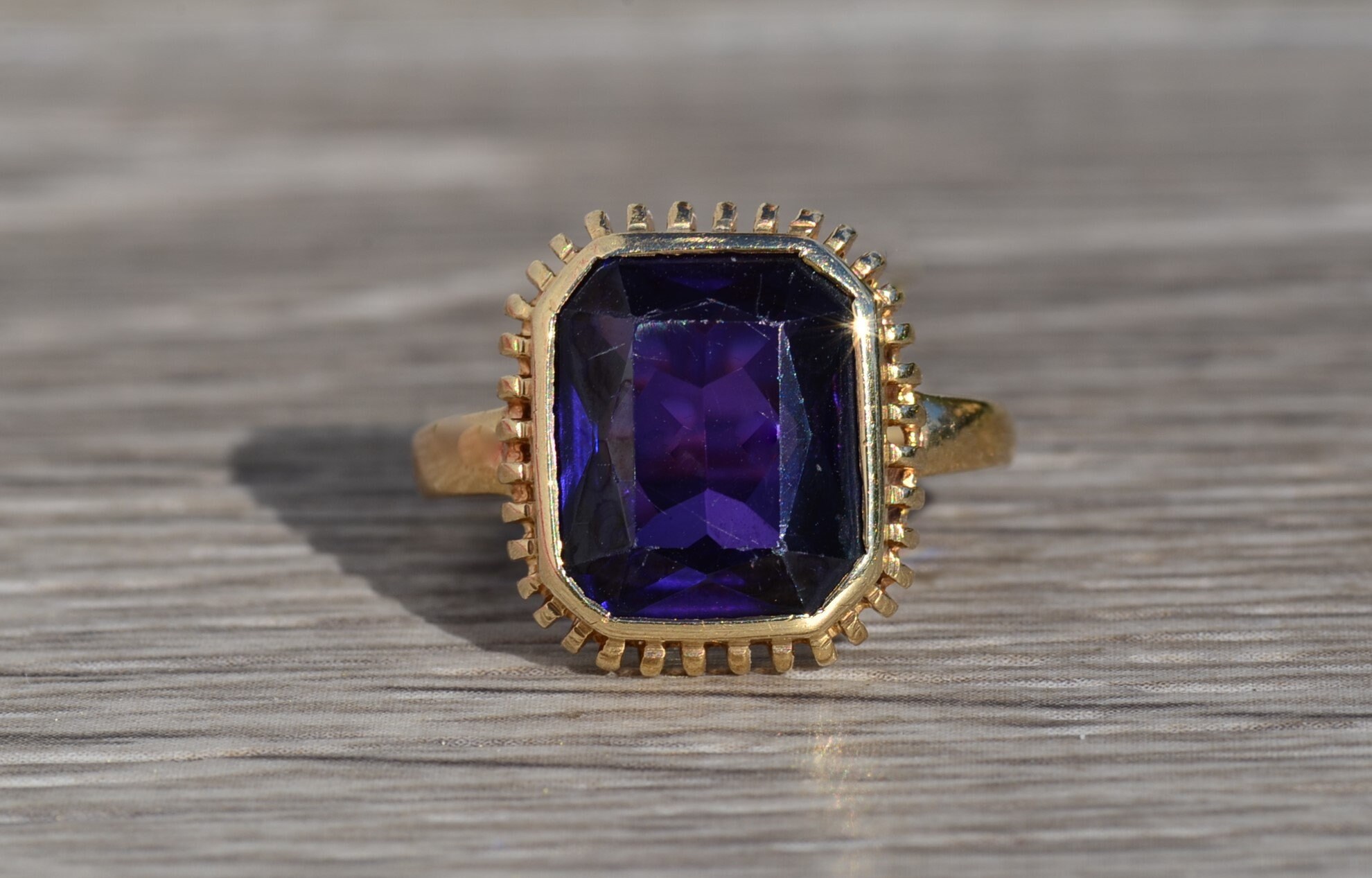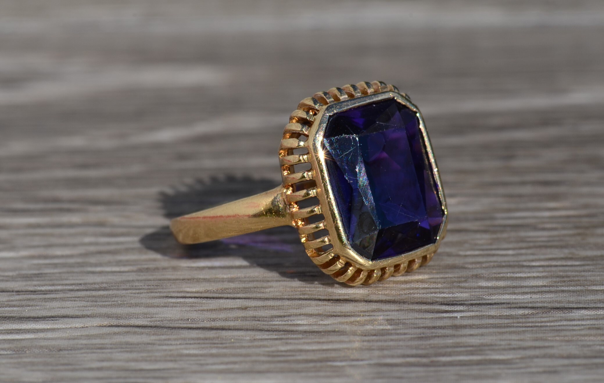 Ladies Yellow Gold Cocktail Ring set with Laboratory Grown Sapphire. Crafted in yellow gold, this ladies ring centers on a bezel set laboratory grown sapphire. Simple, but makes a statement. This ring is currently a finger size 6 and is able to be resized for an additional charge.