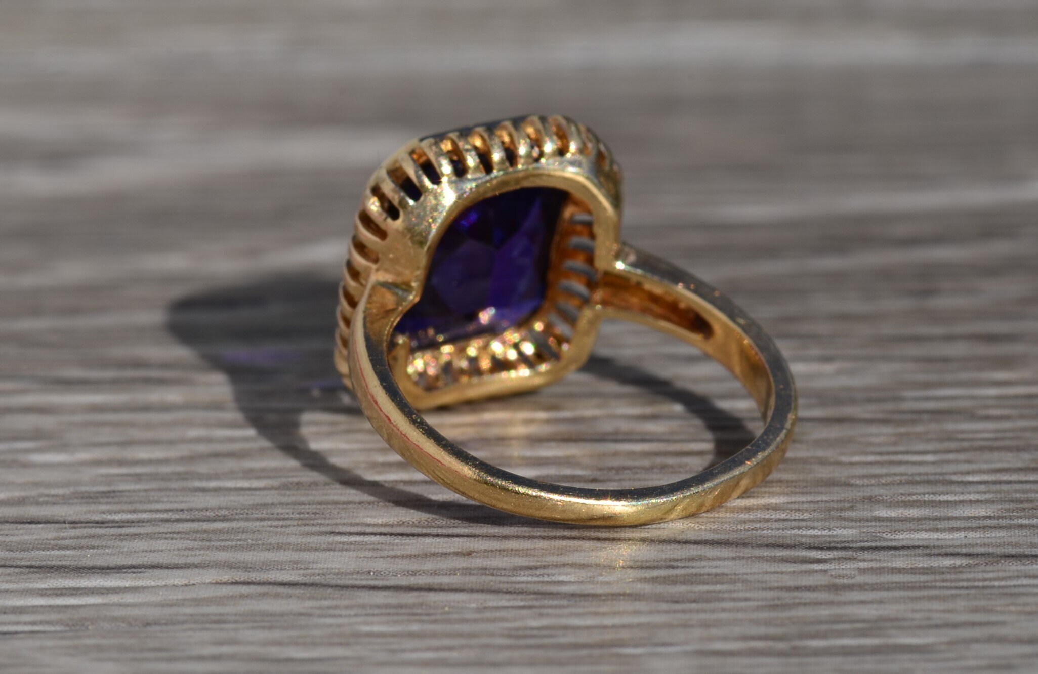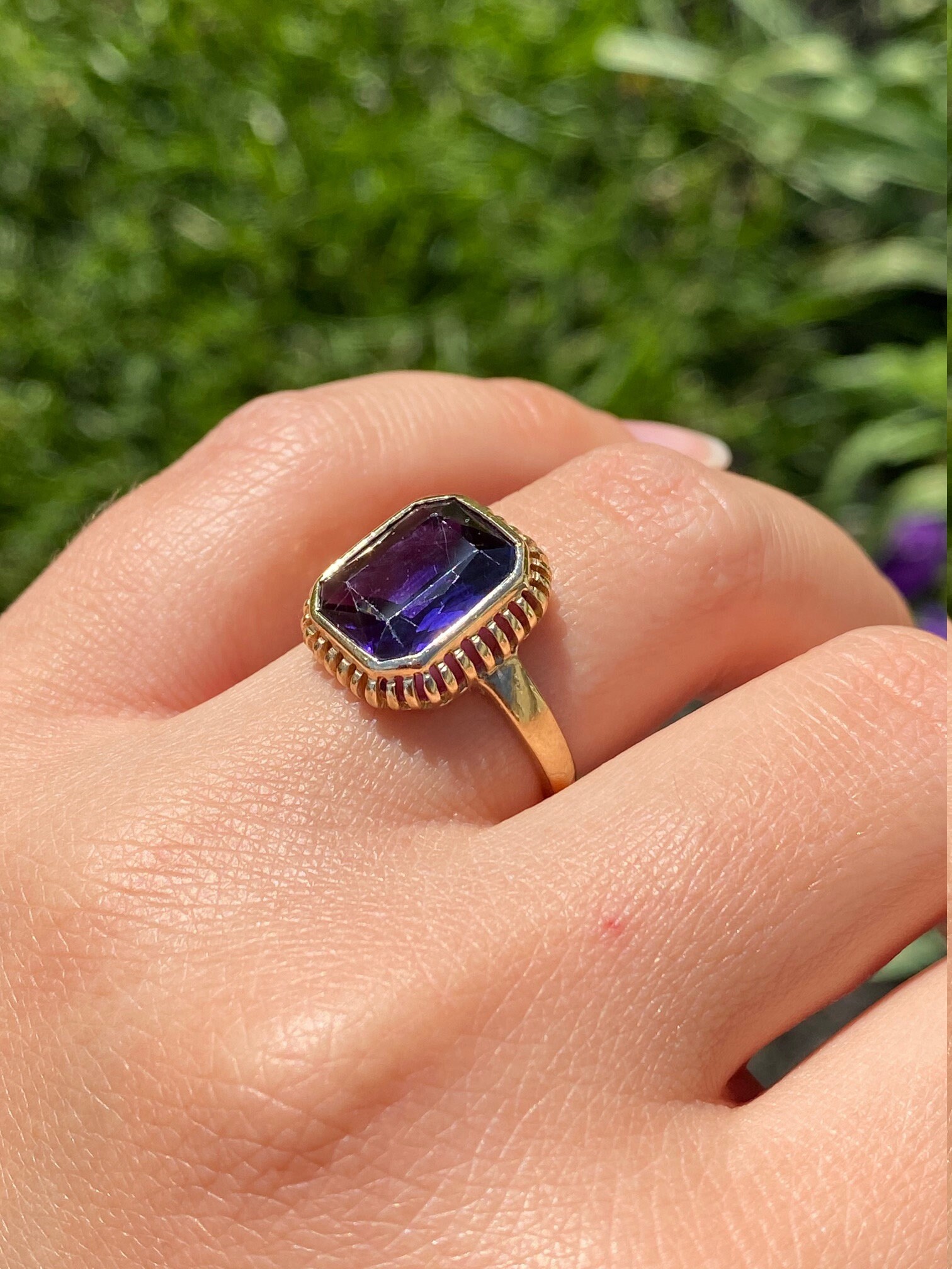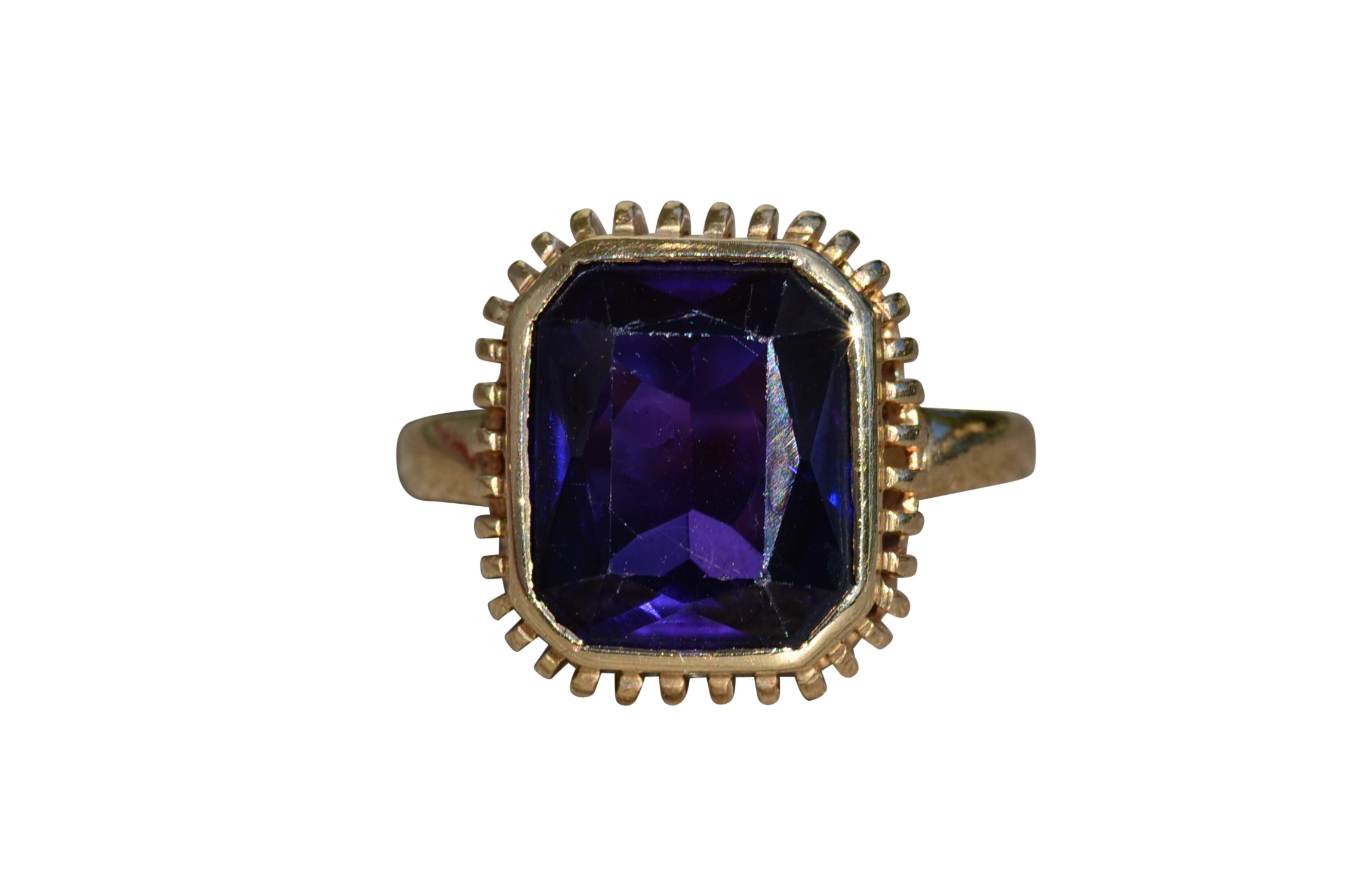 Ladies Yellow Gold Cocktail Ring set with Laboratory Grown Sapphire. Crafted in yellow gold, this ladies ring centers on a bezel set laboratory grown sapphire. Simple, but makes a statement. This ring is currently a finger size 6 and is able to be resized for an additional charge.