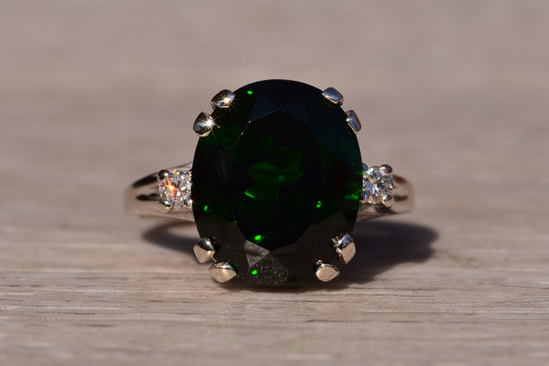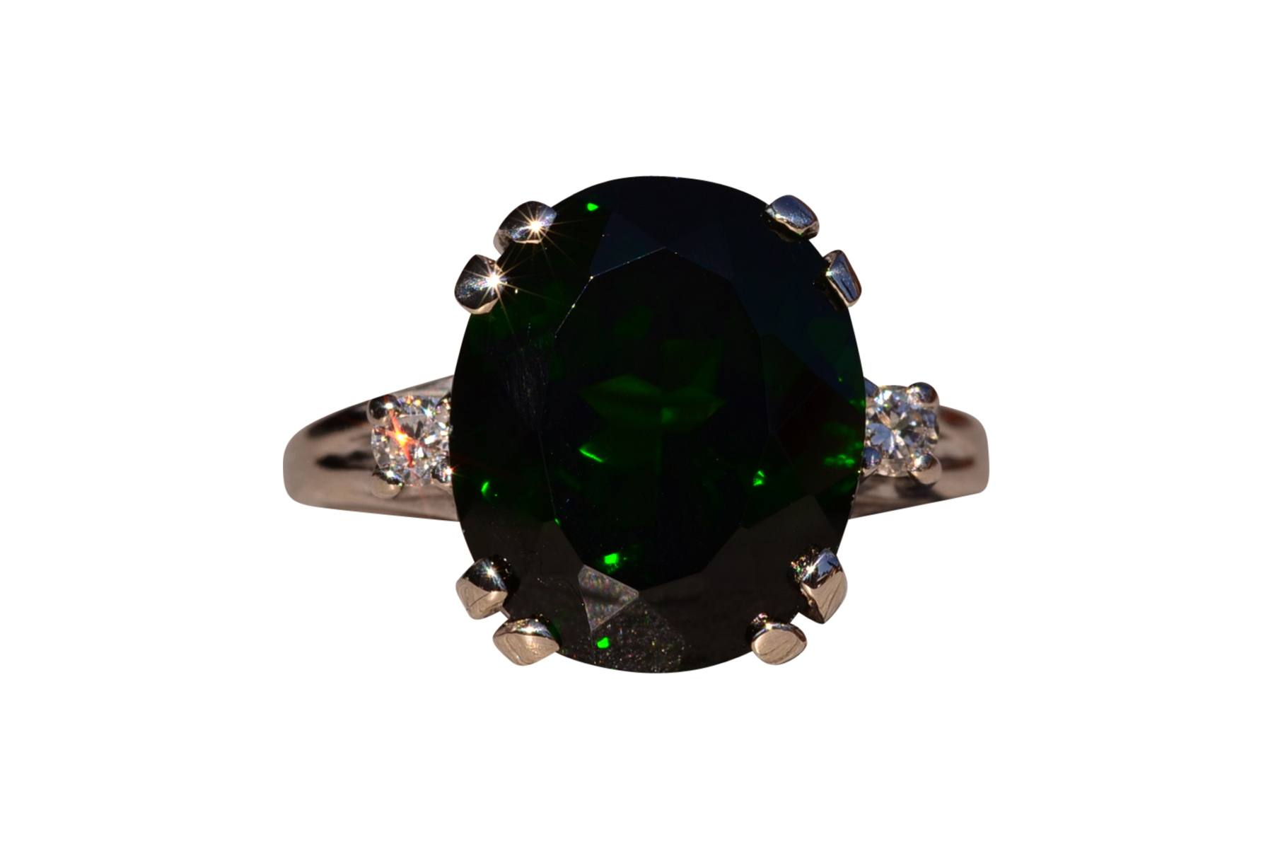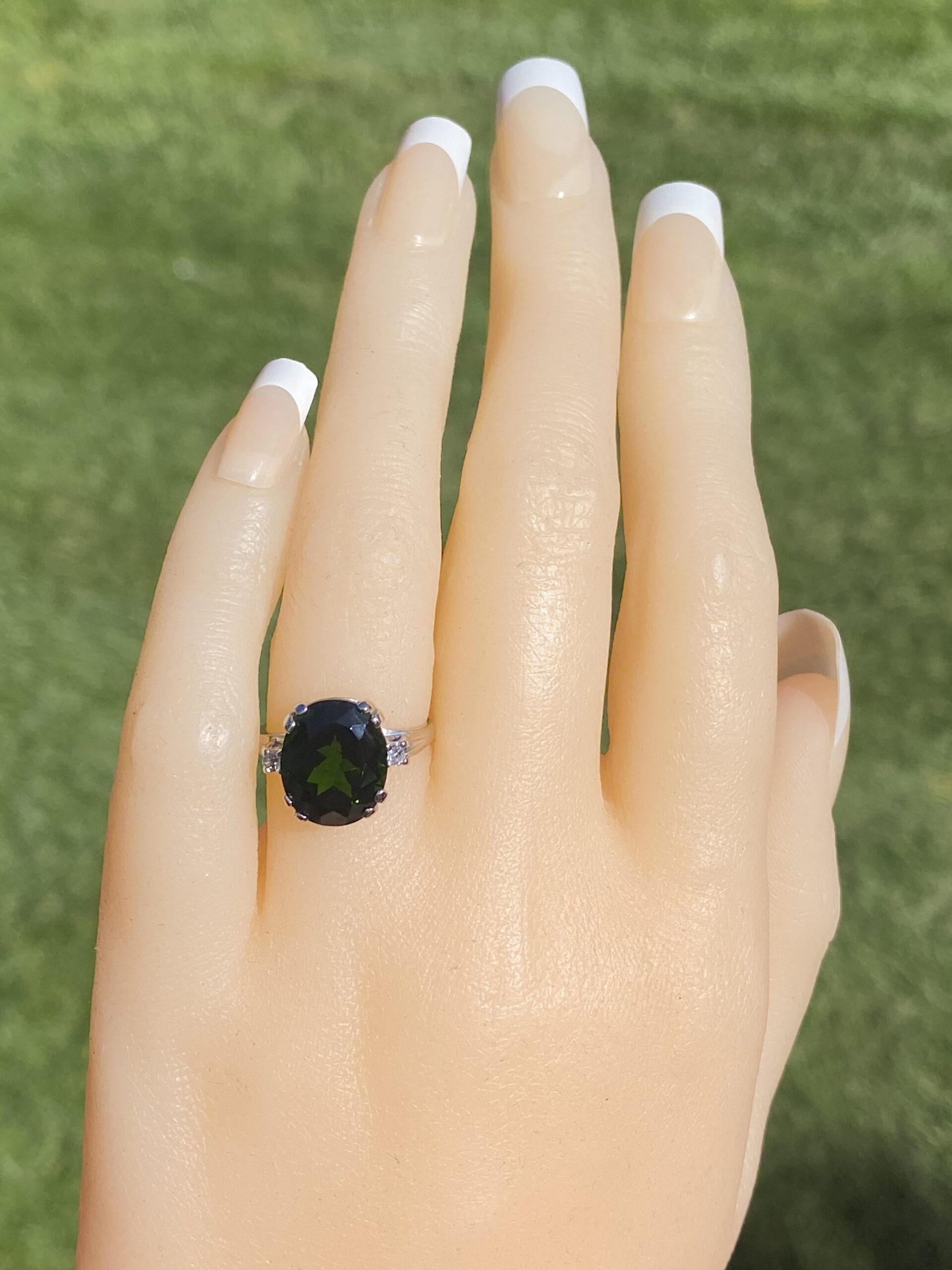 The Dip: Ladies 14K Chrome Diopside and Diamond Ring. Crafted in 14 karat white gold, this classic ring centers on a 12 x 10mm natural oval chrome diopside with a weight by measurement of 5.62 carats. A natural round brilliant cut diamond flanks either side of the center for a total diamond weight of 0.10 carats. The ring is currently a finger size 5 and is able to be resized for an additional charge upon request.