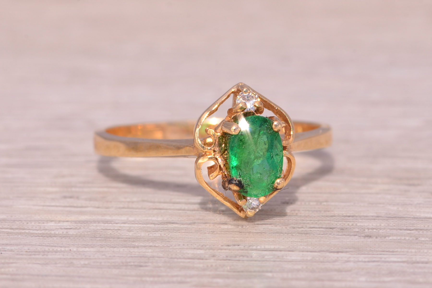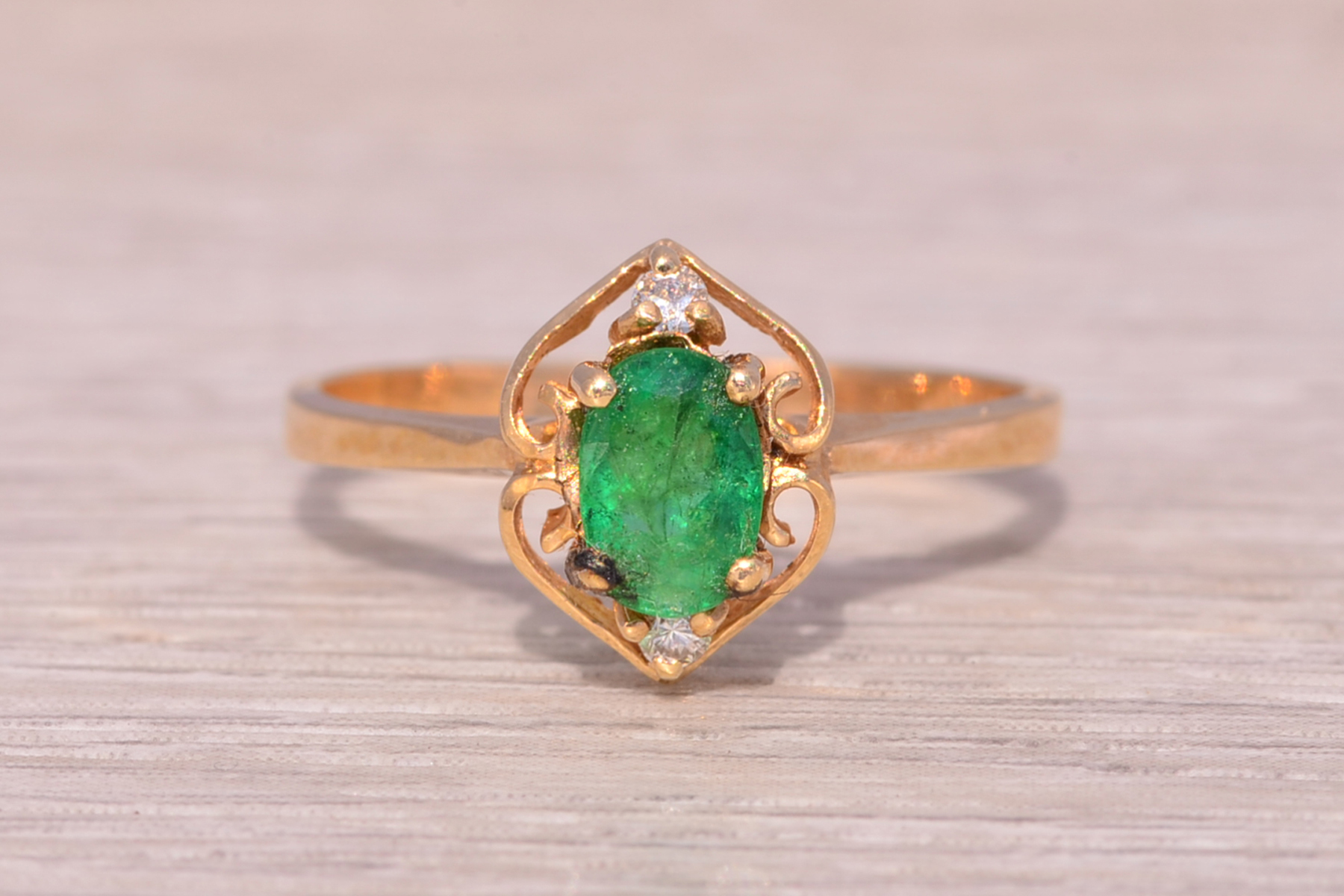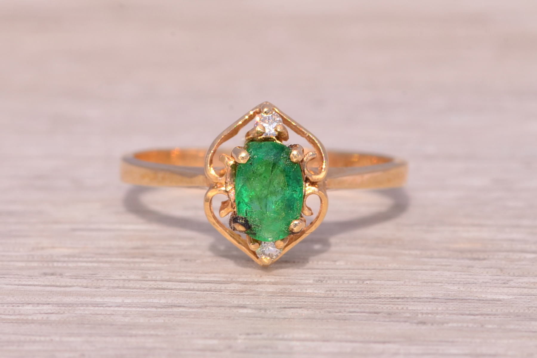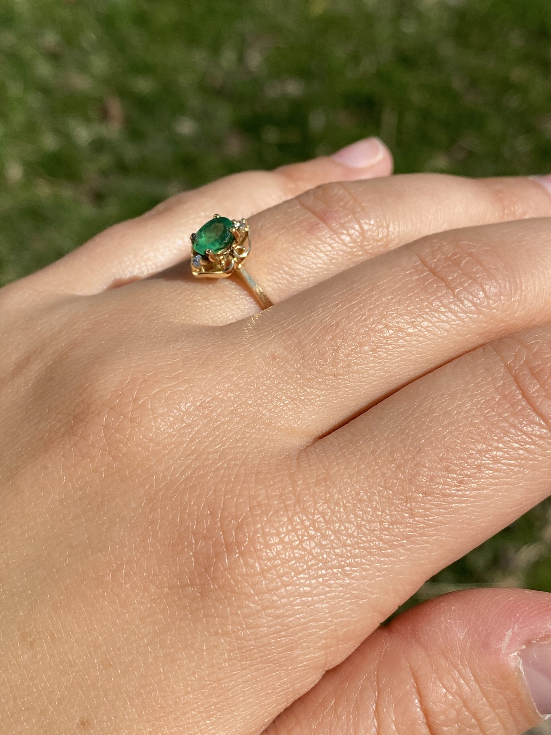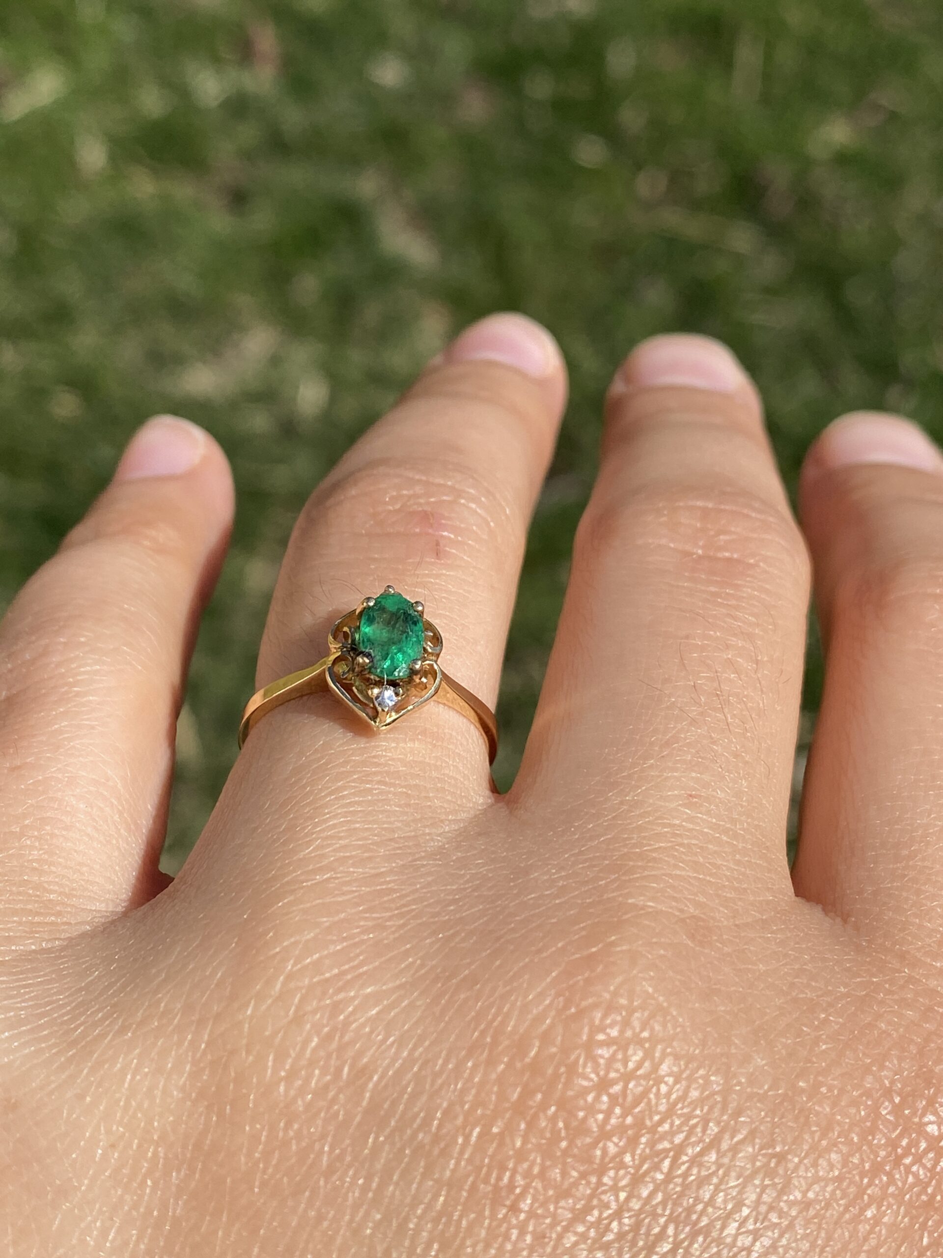 This stunning piece, known as The Emerald Enchantress, features a captivating oval cut emerald at its center. The emerald is set in 14 karat yellow gold and exudes a deep, rich green hue that draws the eye. Elegantly framing the emerald are natural diamonds that add a touch of brilliance to the ring’s intricate design. The openwork on the band creates a delicate yet ornate frame, enhancing the ring’s overall beauty. The ring is crafted in 14 karat yellow gold and is currently a finger size 6.5 yet can be adjusted to any finger size for an additional charge upon request, ensuring a perfect fit.