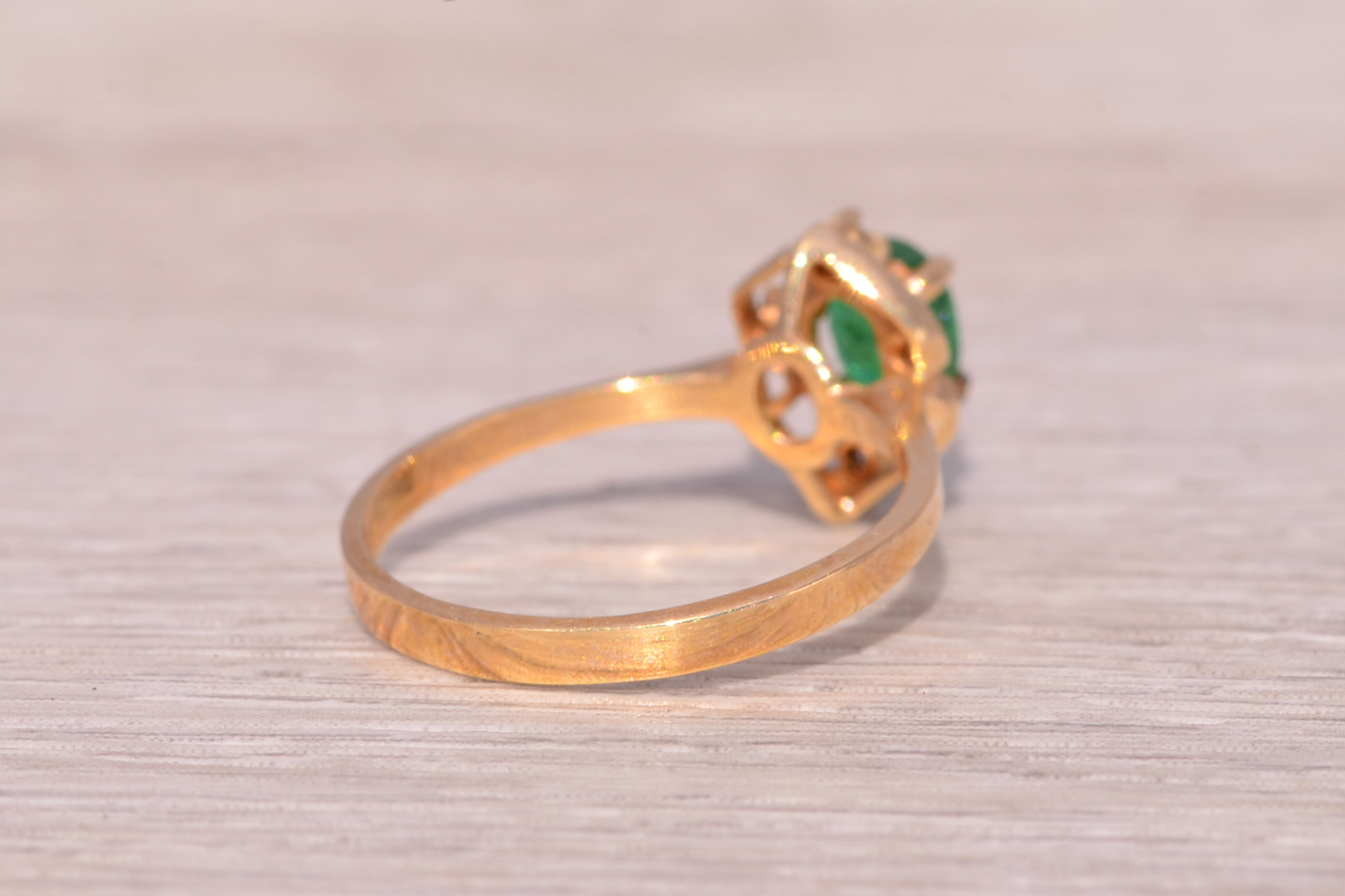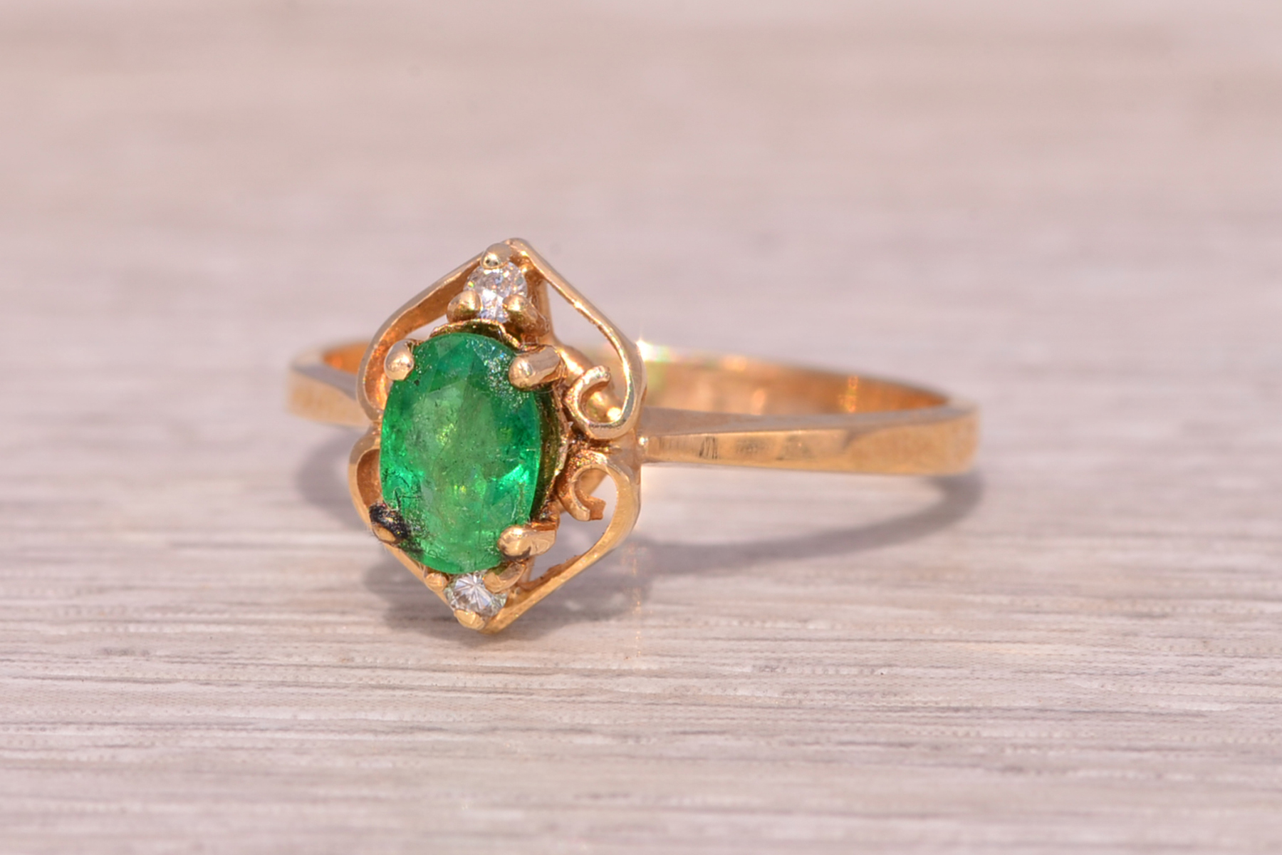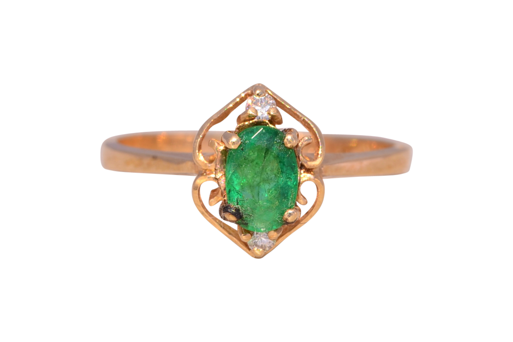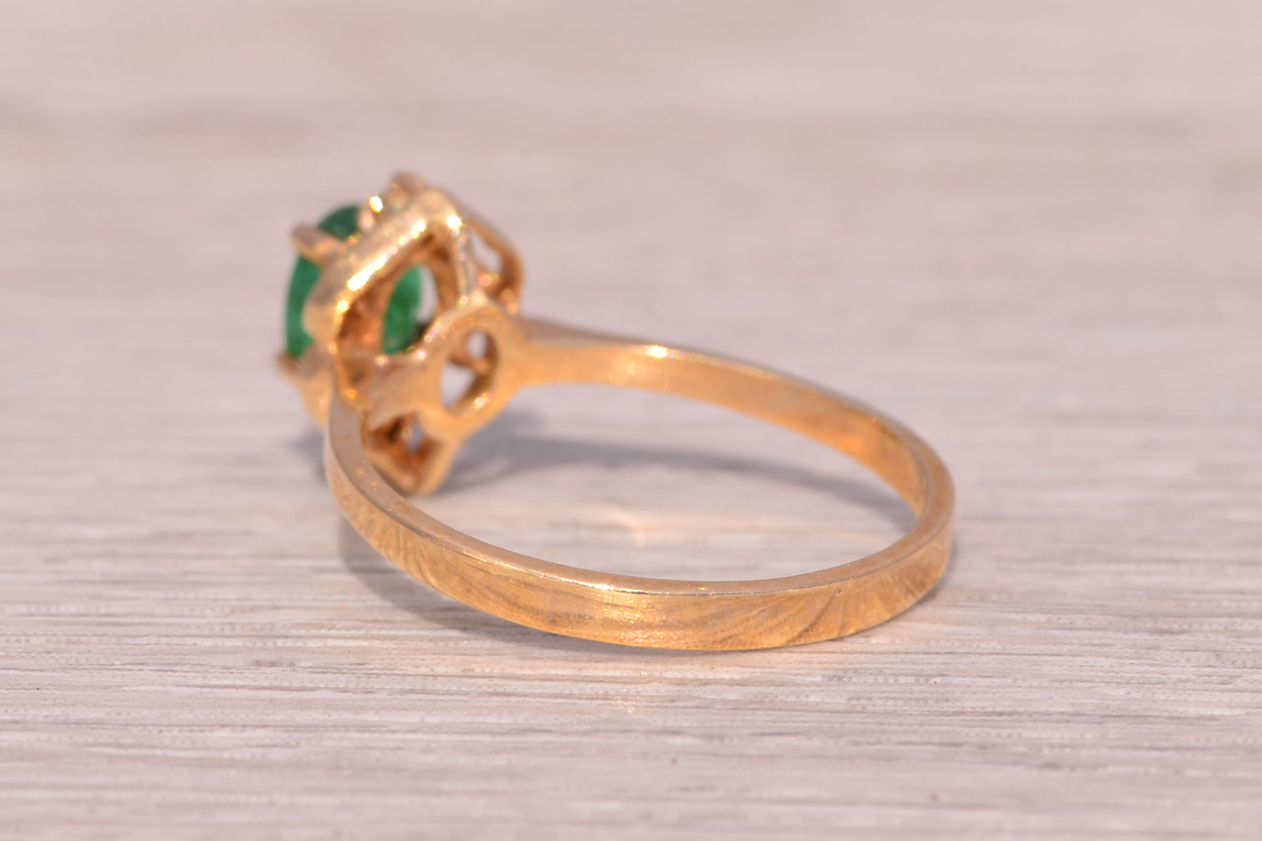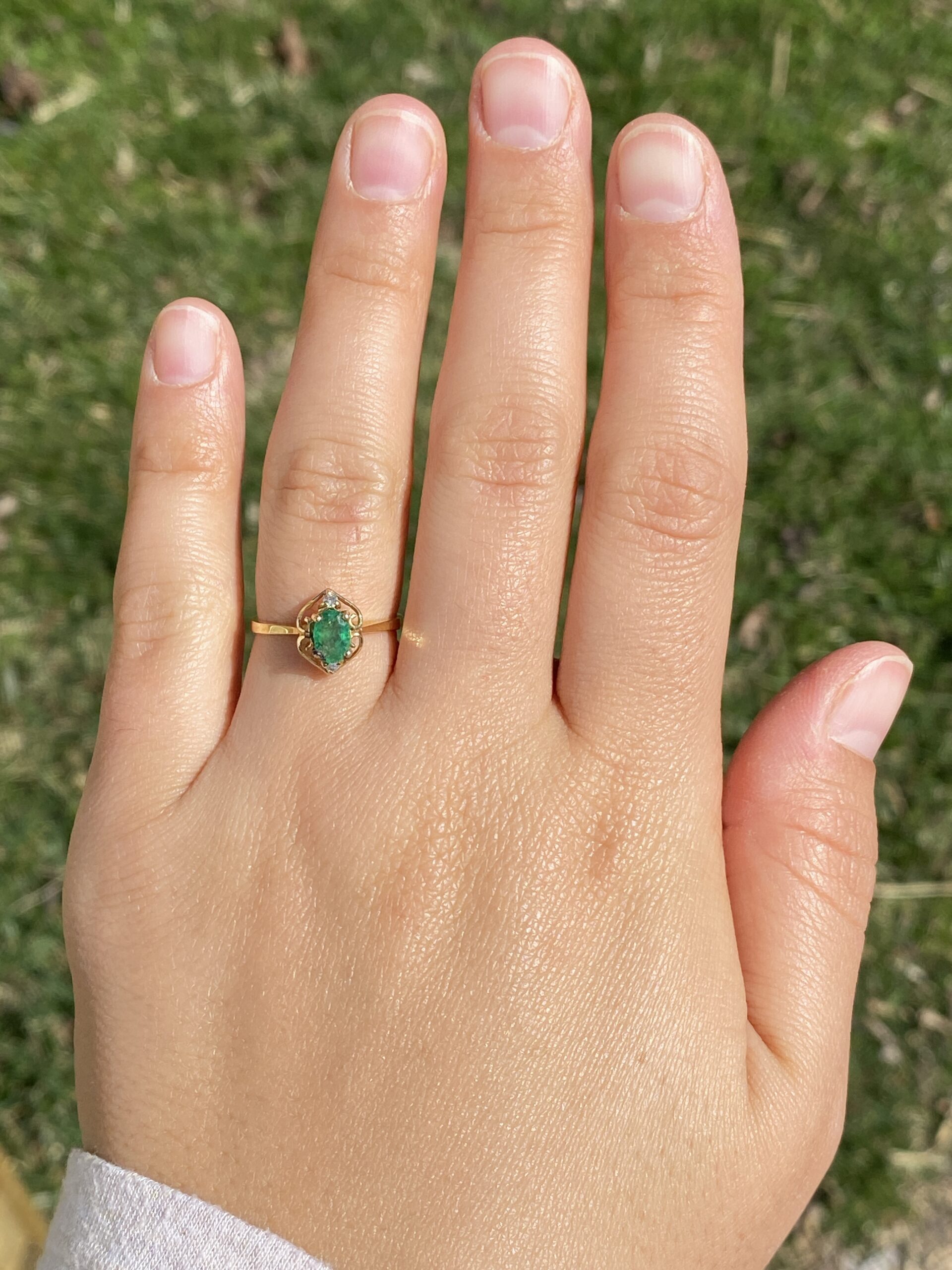 This stunning piece, known as The Emerald Enchantress, features a captivating oval cut emerald at its center. The emerald is set in 14 karat yellow gold and exudes a deep, rich green hue that draws the eye. Elegantly framing the emerald are natural diamonds that add a touch of brilliance to the ring’s intricate design. The openwork on the band creates a delicate yet ornate frame, enhancing the ring’s overall beauty. The ring is crafted in 14 karat yellow gold and is currently a finger size 6.5 yet can be adjusted to any finger size for an additional charge upon request, ensuring a perfect fit.