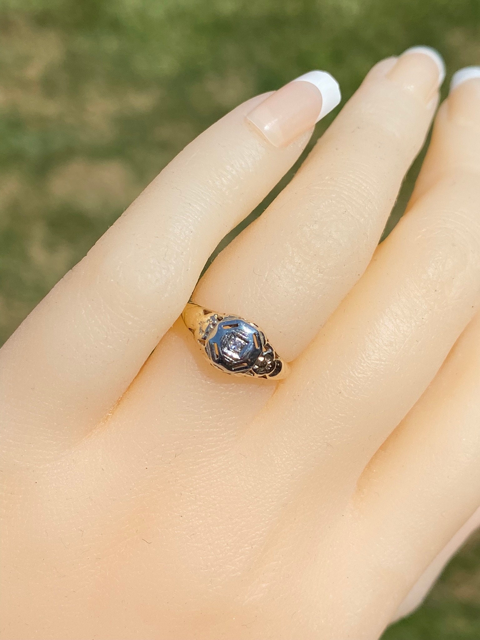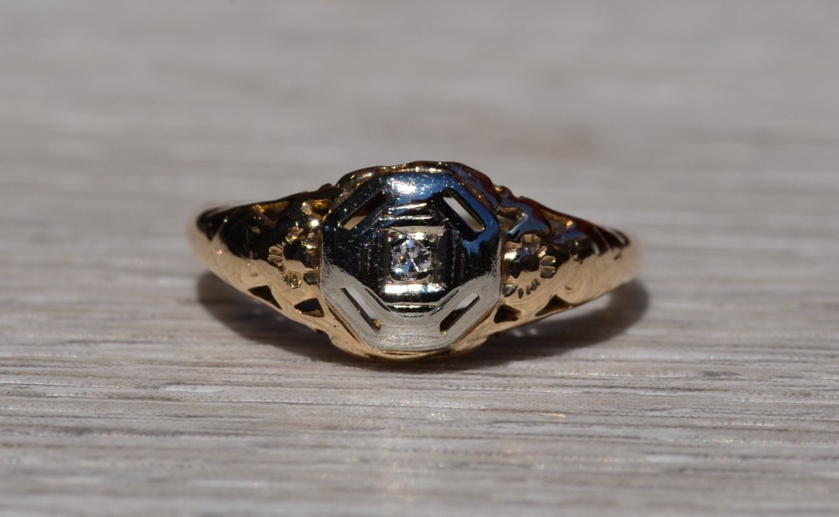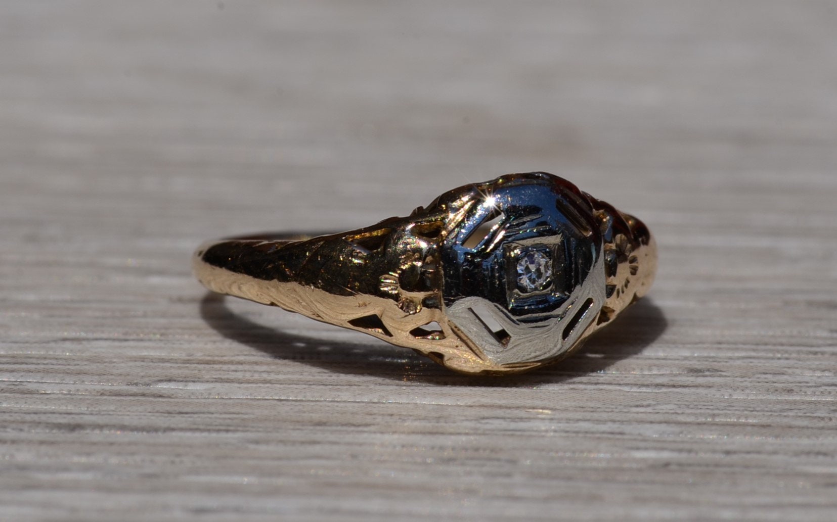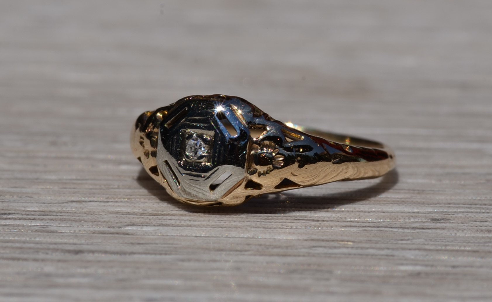 The Escambra: Antique Yellow Gold Filigree Engagement Ring. The ring centers on an old cut round diamond in custom built white gold plate. Attached to the white gold plate is the rest of the filigree ring. The ring is crafted in 14 karat white and yellow gold and is currently a finger size 4 yet can be adjusted to any finger size for an additional charge on request.