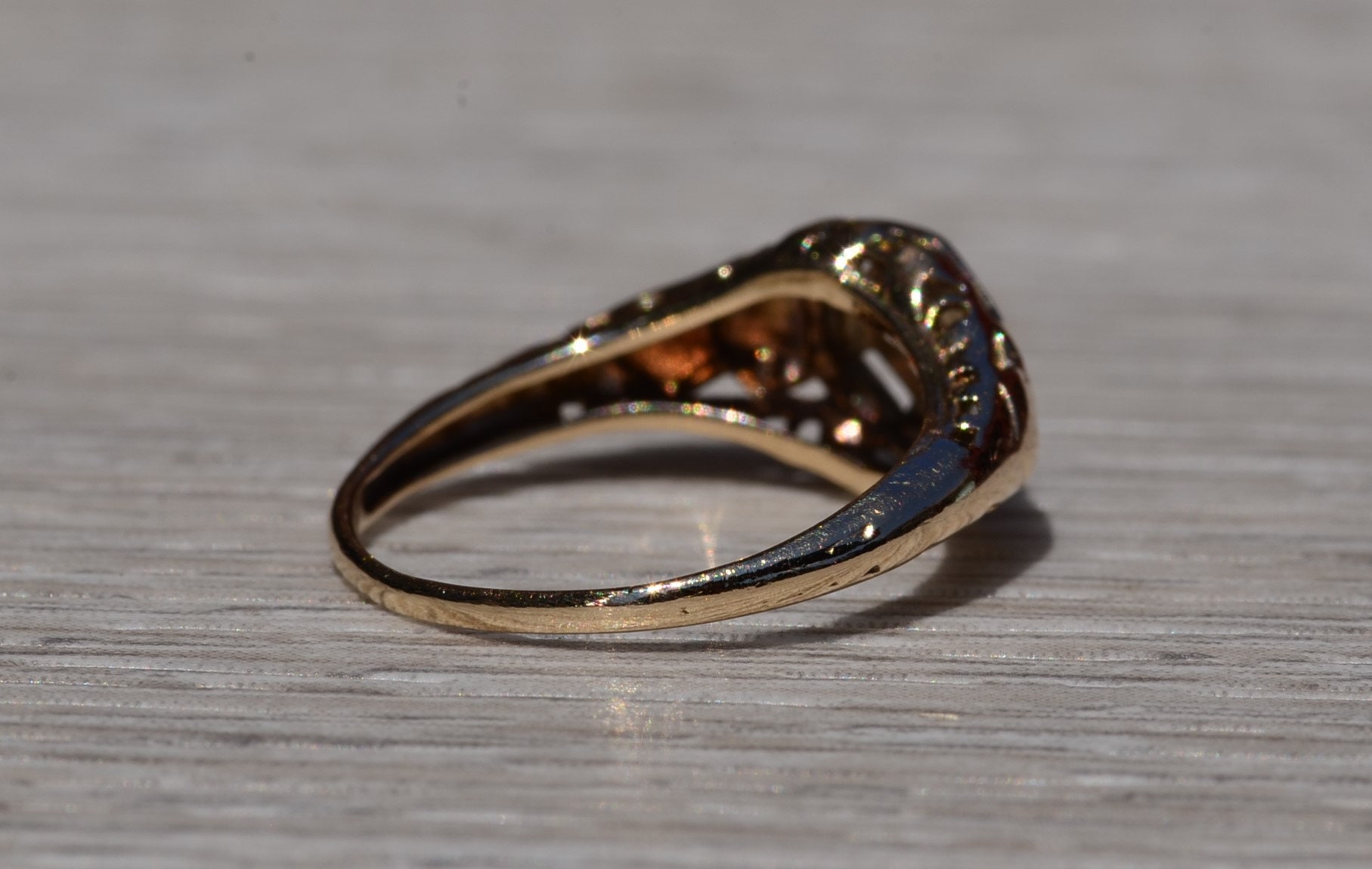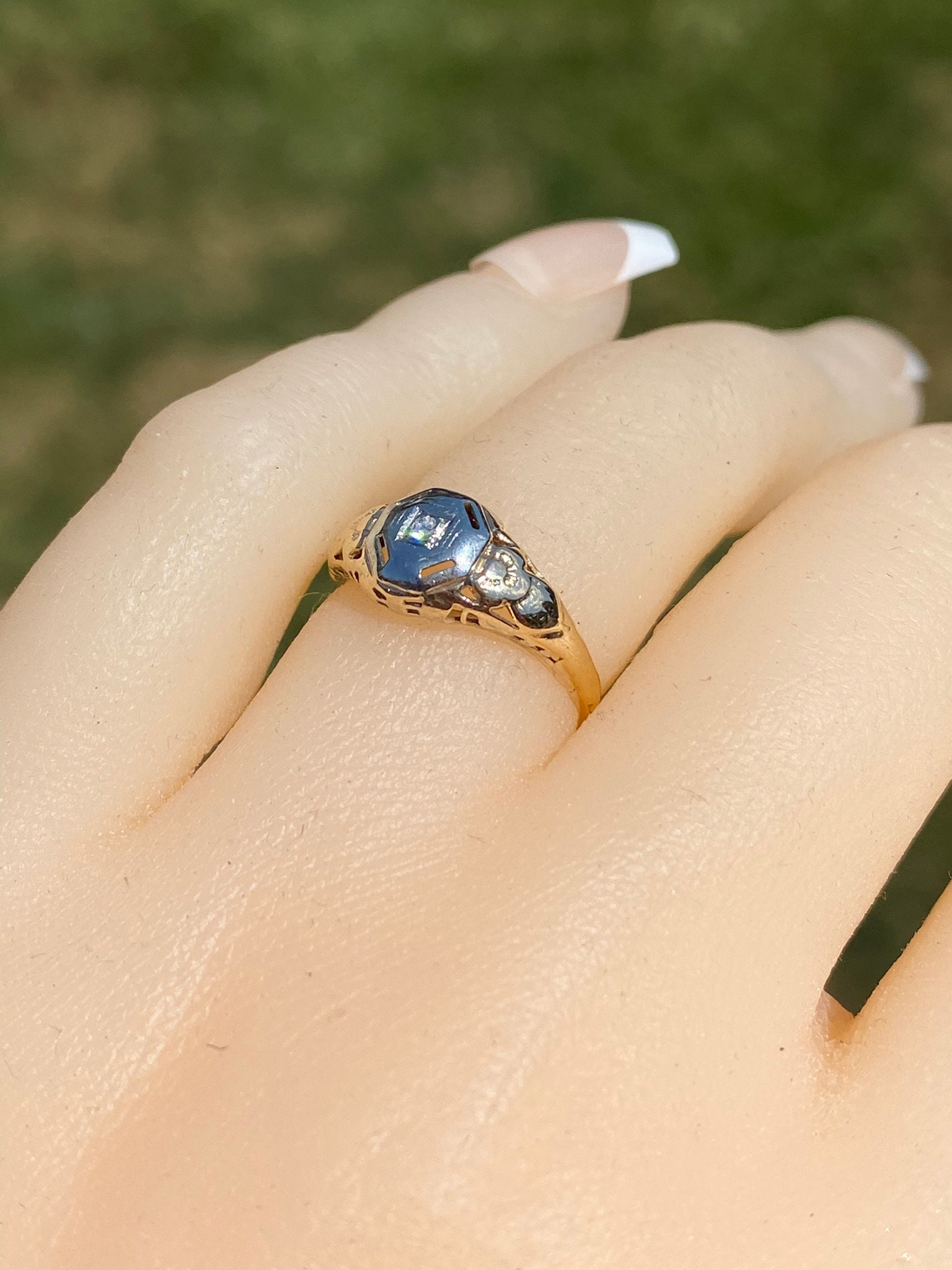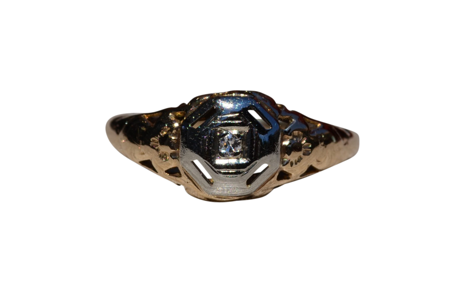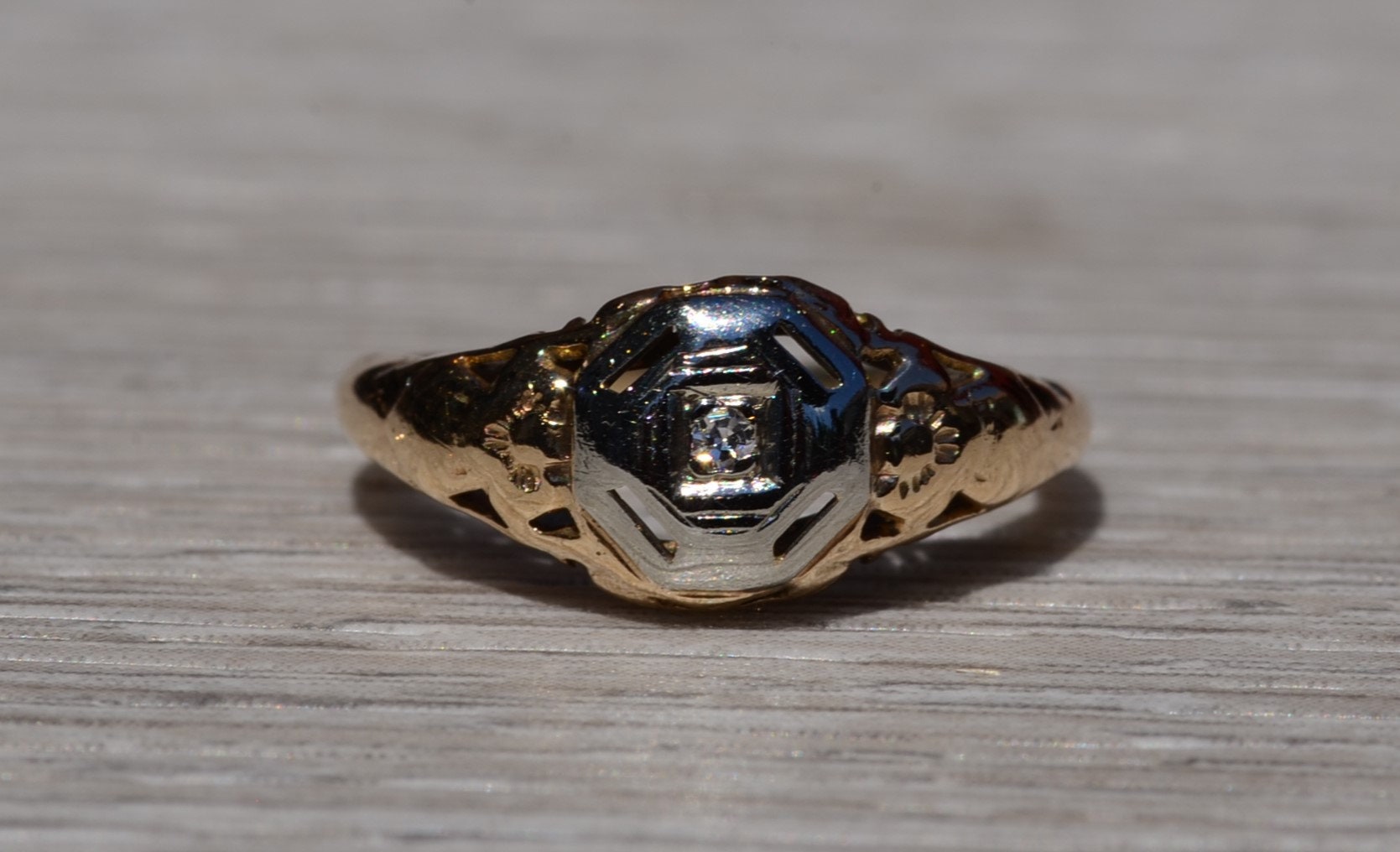 The Escambra: Antique Yellow Gold Filigree Engagement Ring. The ring centers on an old cut round diamond in custom built white gold plate. Attached to the white gold plate is the rest of the filigree ring. The ring is crafted in 14 karat white and yellow gold and is currently a finger size 4 yet can be adjusted to any finger size for an additional charge on request.