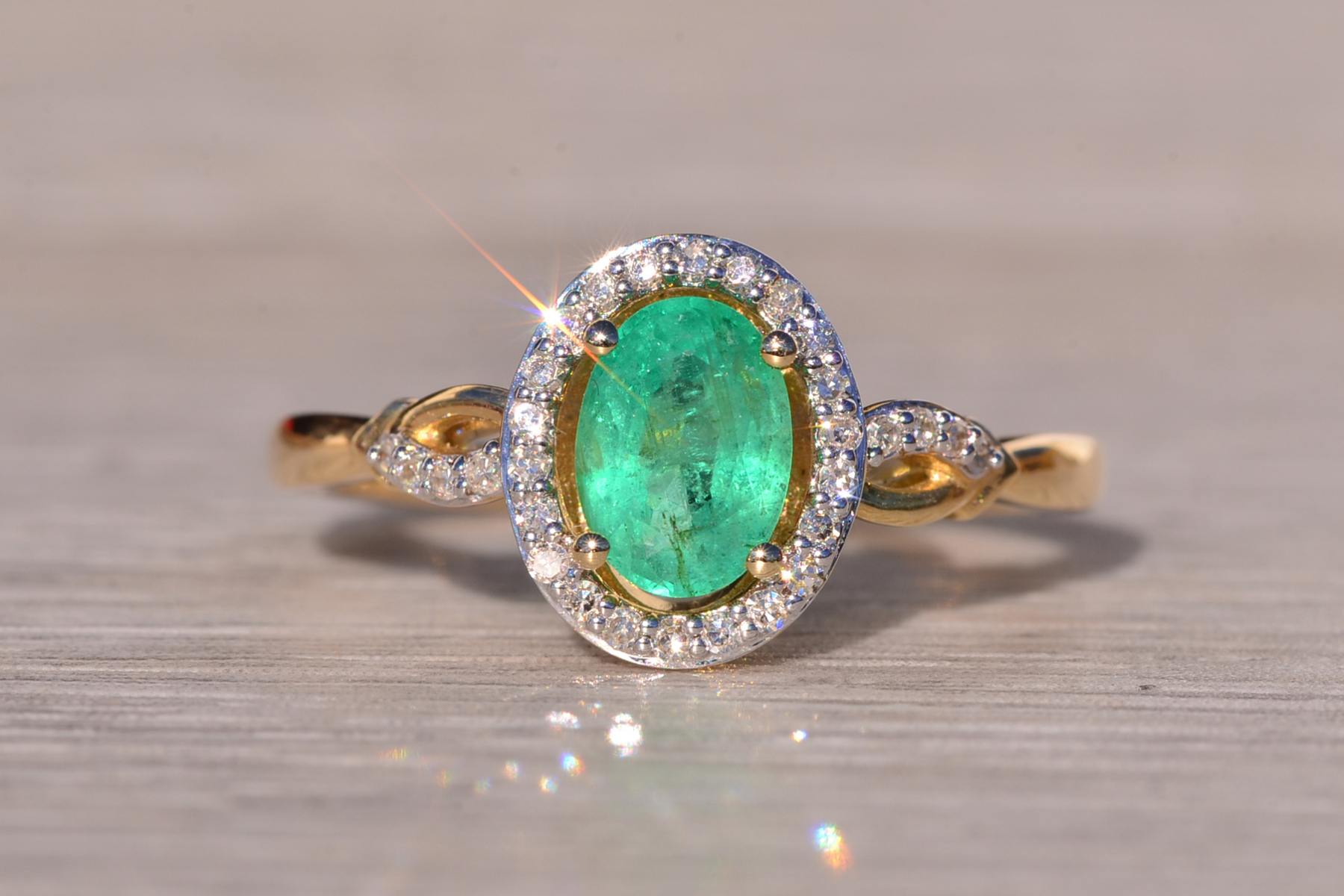 The Esmeralda: Emerald and Natural Diamond Halo Ring in Yellow Gold. Immerse yourself in the captivating allure of our ring, featuring a vibrant 7x5mm oval brilliant-cut natural emerald at its center, radiating vivid bluish-green hues. Surrounding the center gem and gracefully extending into the single twist shank are round-cut natural diamonds, adding a touch of brilliance and completing the enchanting look. Crafted with precision in 14 karat gold, this piece exudes timeless elegance. Currently sized at 7, with the option for personalized adjustments available upon request for an additional charge.
