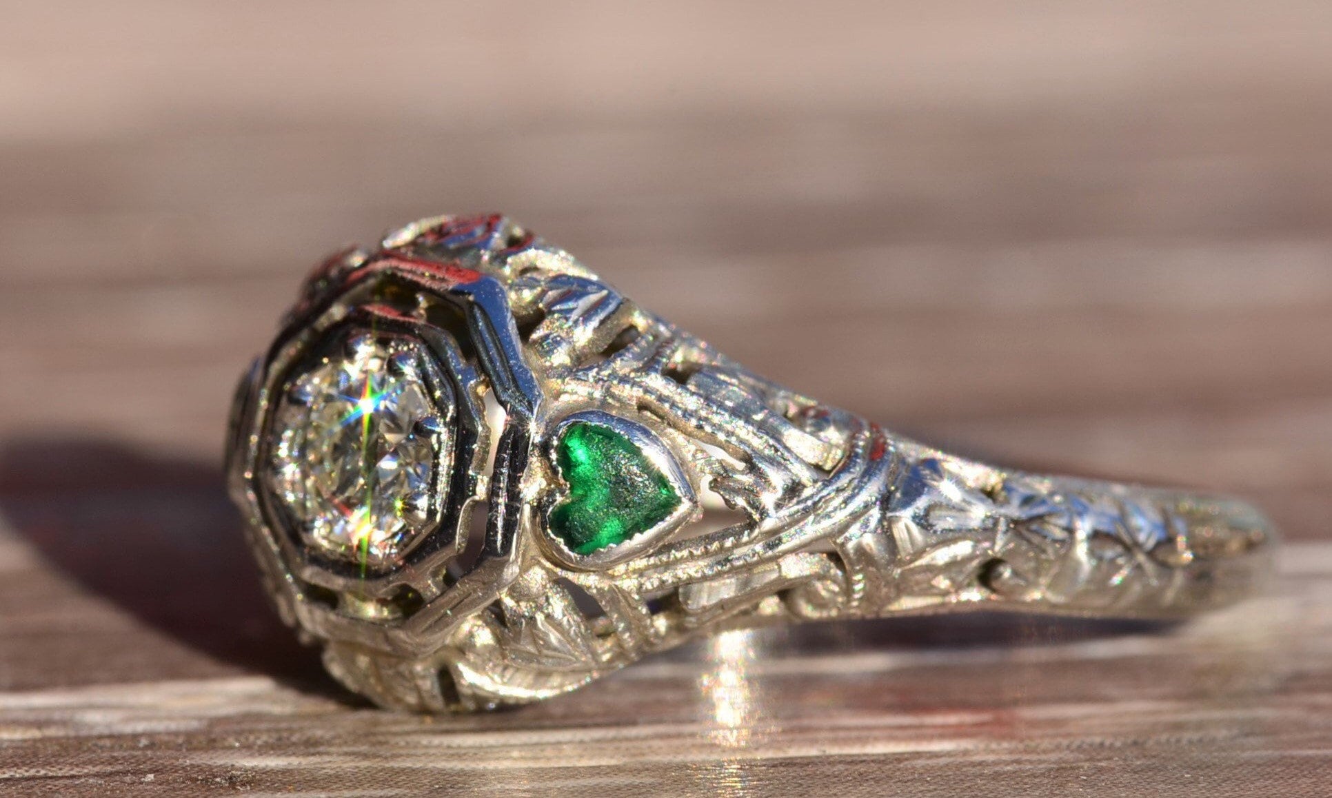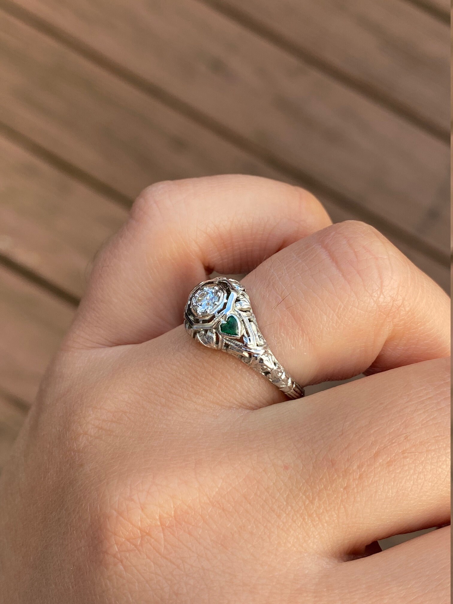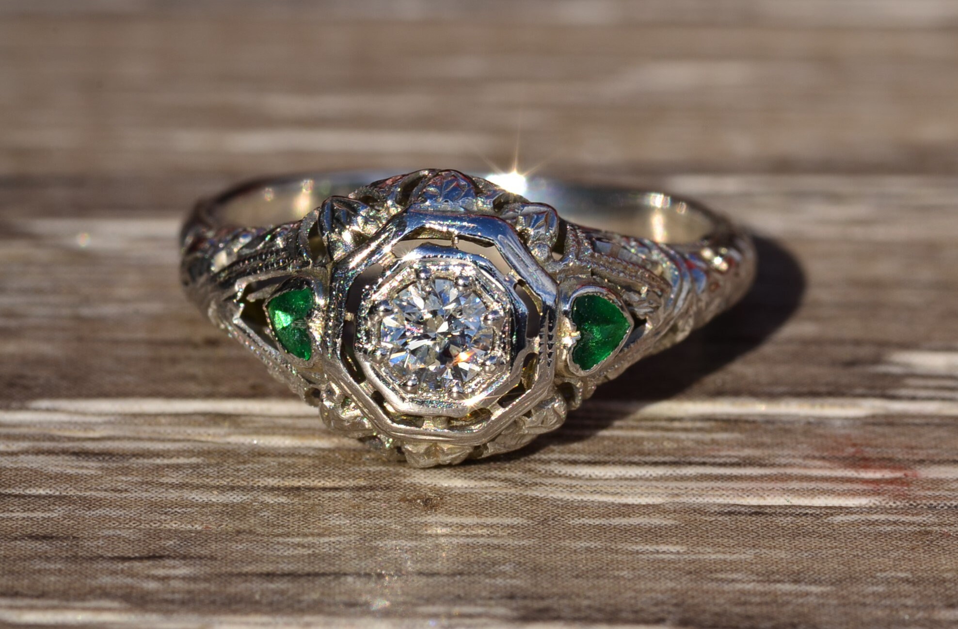 Antique 18 Karat White Gold Diamond Engagement Ring with Emeralds. This ring centers on a bead set 0.20 carat diamond. On either side of the center stone is a bezel set emerald heart. The ring features stunning filigree and milgrain that continue down the shank. This ring is a finger size 6 1/4, yet can be adjusted in size.