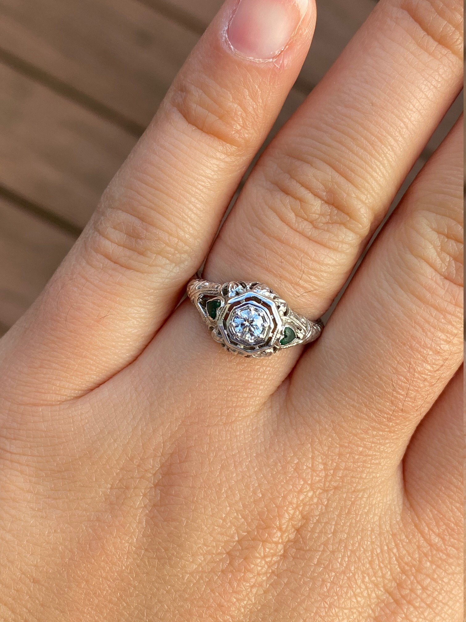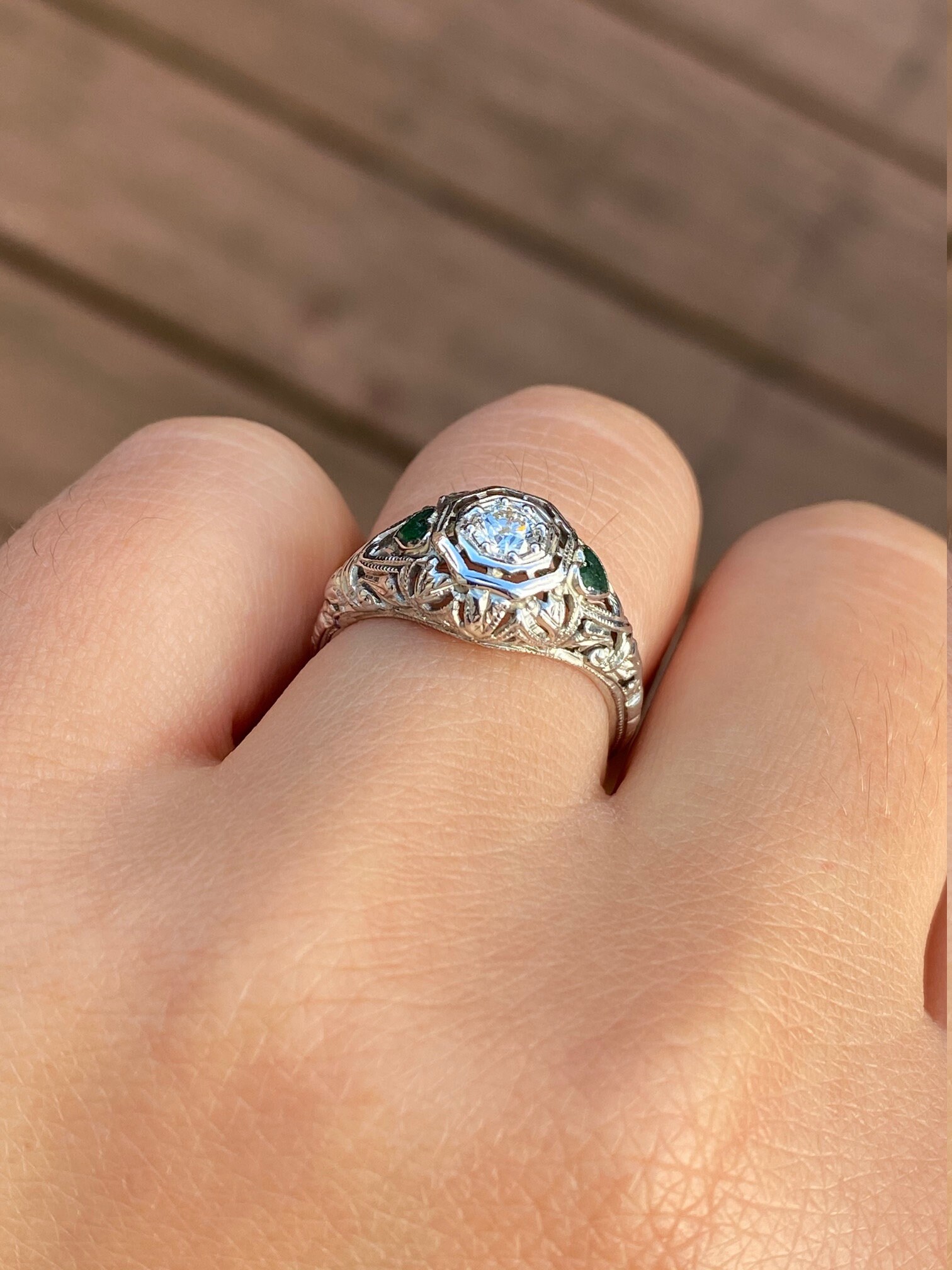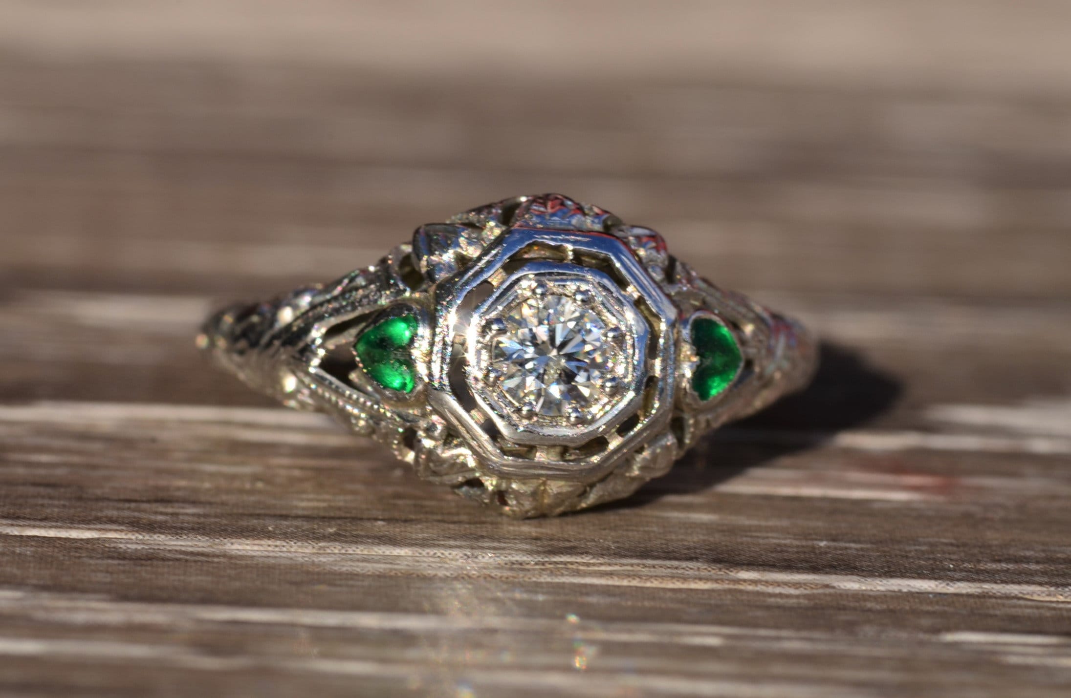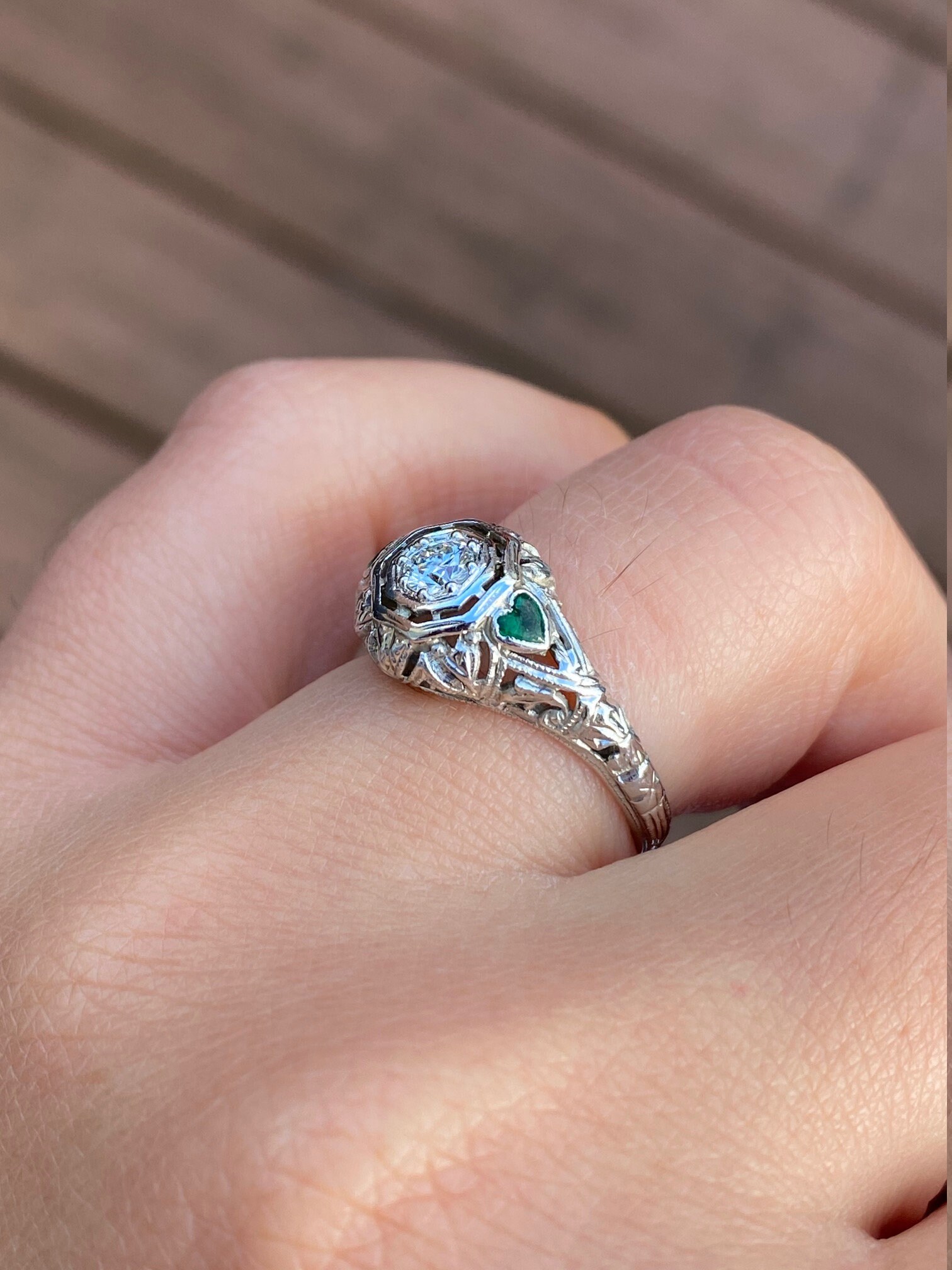 Antique 18 Karat White Gold Diamond Engagement Ring with Emeralds. This ring centers on a bead set 0.20 carat diamond. On either side of the center stone is a bezel set emerald heart. The ring features stunning filigree and milgrain that continue down the shank. This ring is a finger size 6 1/4, yet can be adjusted in size.