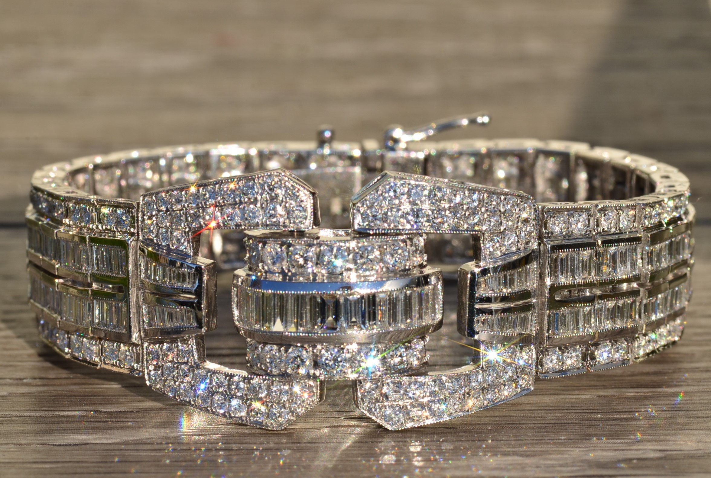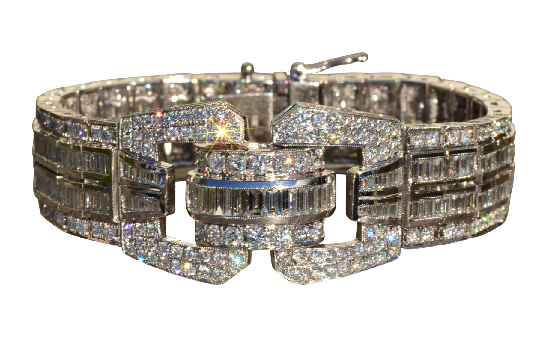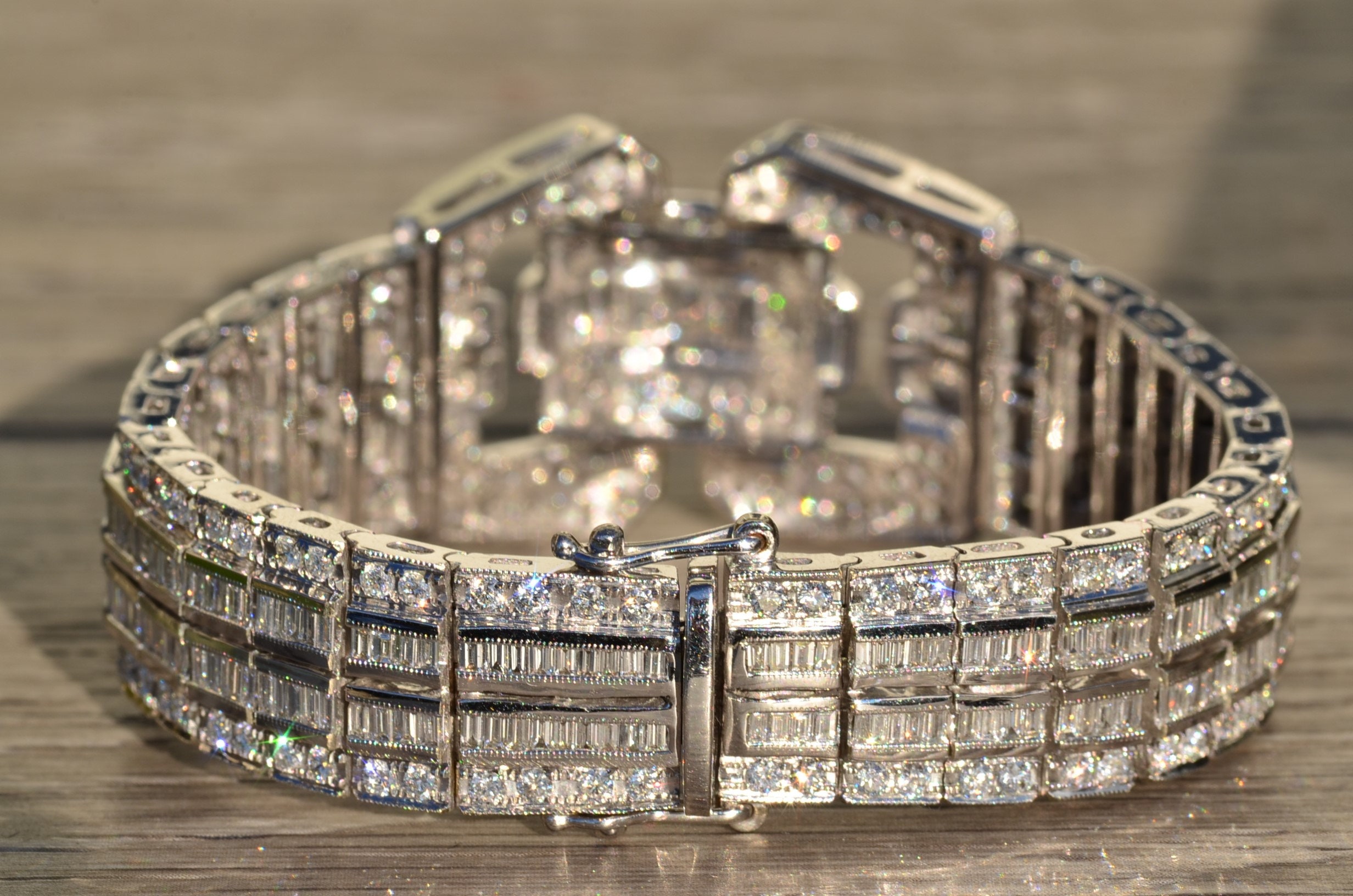 The Esplanade: Exquisite Art Deco Style Bracelet in 14K Gold Featuring 15.8 CTW Diamonds. This truly phenomenal bracelet is crafted in 14 karat white gold and measures 7 inches in length and 1 inch in width. This one of a kind bracelet features 15.8 carats total weight of round and baguette cut diamonds. The diamonds have a Gemological Institute of America clarity grade of VS1 – SI1 and color grades ranging from F – G. This bracelet is extremely well made and is silky smooth to wear featuring a push style clasp with two added safety catches. Wear this red carpet worthy bracelet to your next formal outing and be the talk of the party.
