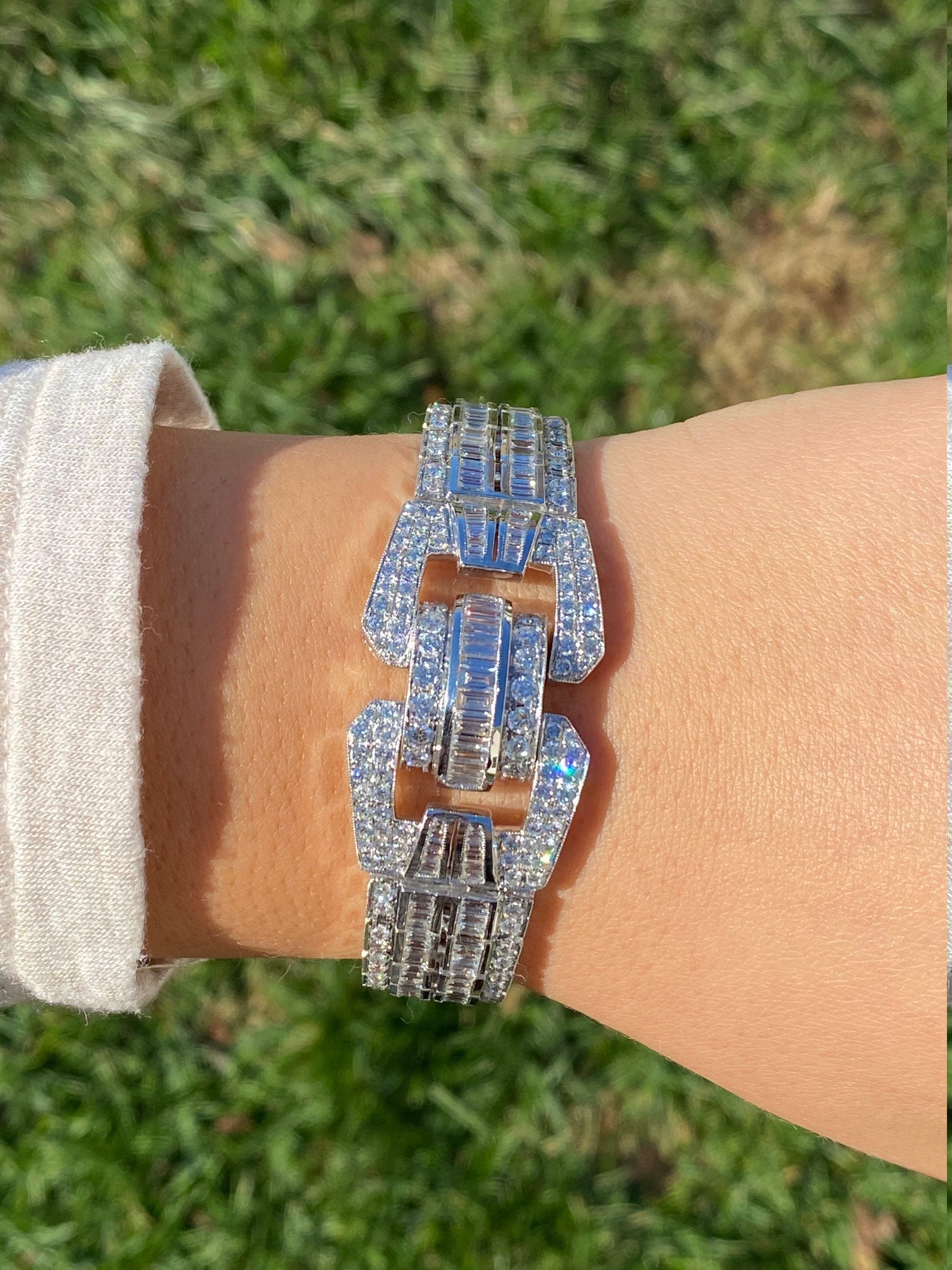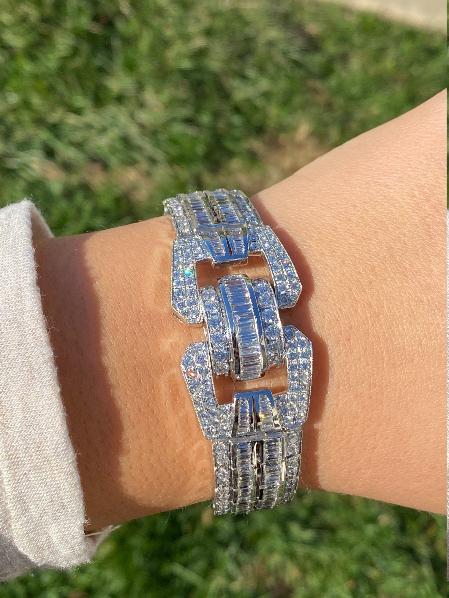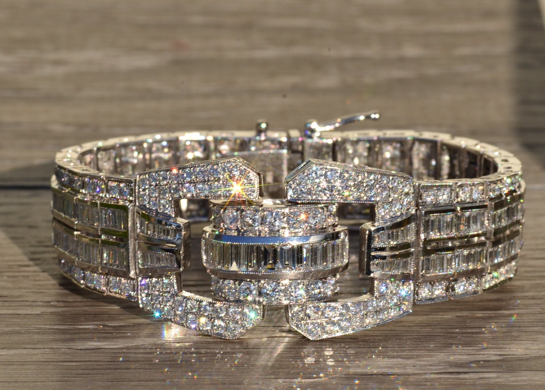 The Esplanade: Exquisite Art Deco Style Bracelet in 14K Gold Featuring 15.8 CTW Diamonds. This truly phenomenal bracelet is crafted in 14 karat white gold and measures 7 inches in length and 1 inch in width. This one of a kind bracelet features 15.8 carats total weight of round and baguette cut diamonds. The diamonds have a Gemological Institute of America clarity grade of VS1 – SI1 and color grades ranging from F – G. This bracelet is extremely well made and is silky smooth to wear featuring a push style clasp with two added safety catches. Wear this red carpet worthy bracelet to your next formal outing and be the talk of the party.