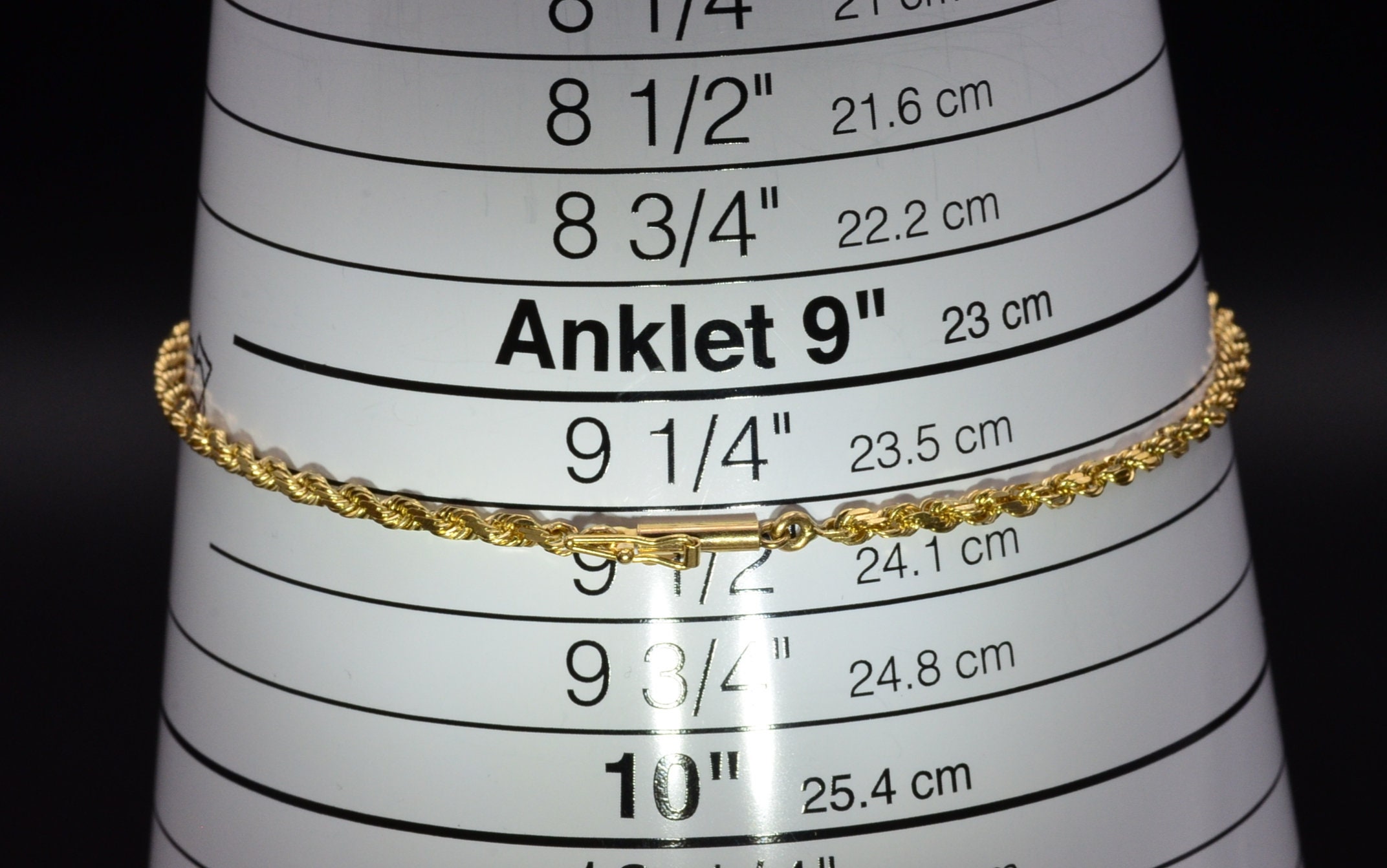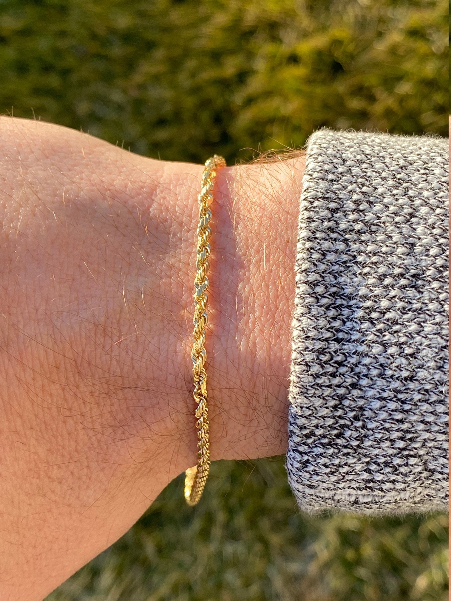 The Estacada: Men’s 14K Yellow Gold 9 Inch Rope Bracelet. Crafted in 14 karat yellow gold, this men’s bracelet measures 9.25 inches and features a barrel style clasp with added safety clip.