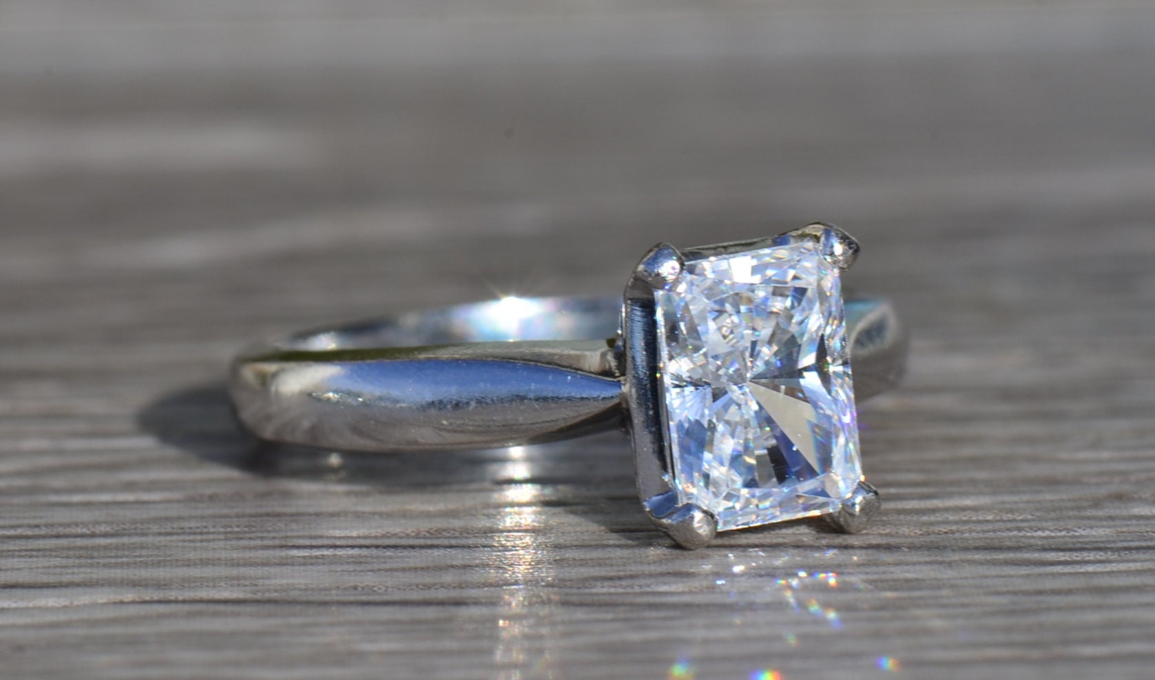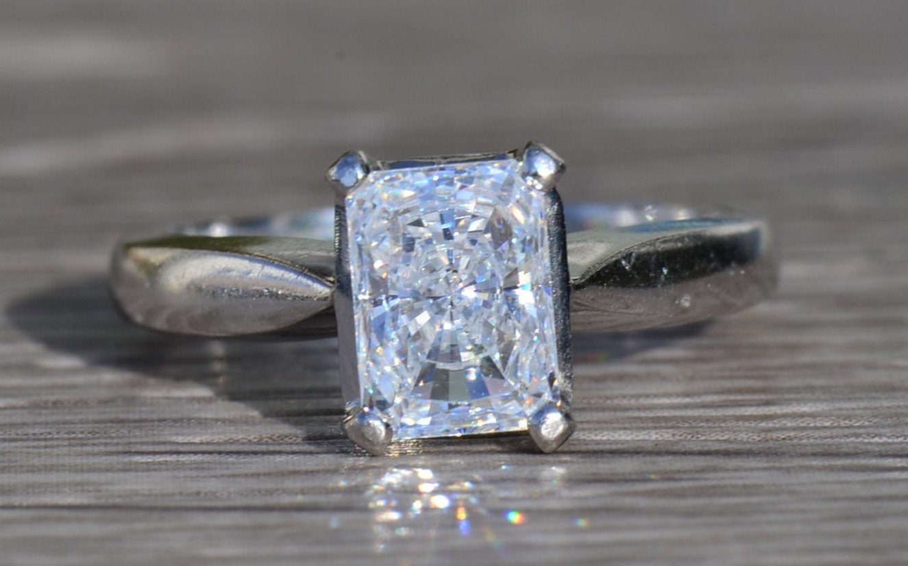 The Estill Springs: Ladies Platinum Engagement Ring set with Cubic Zirconia. Crafted in durable platinum, this classically styled engagement ring features an elongated radiant cut cubic zirconia center stone. The slight taper in this classic band draws more attention to the center stone, making it pop. Currently a finger size 6.25, this ring can be resized for an additional charge.