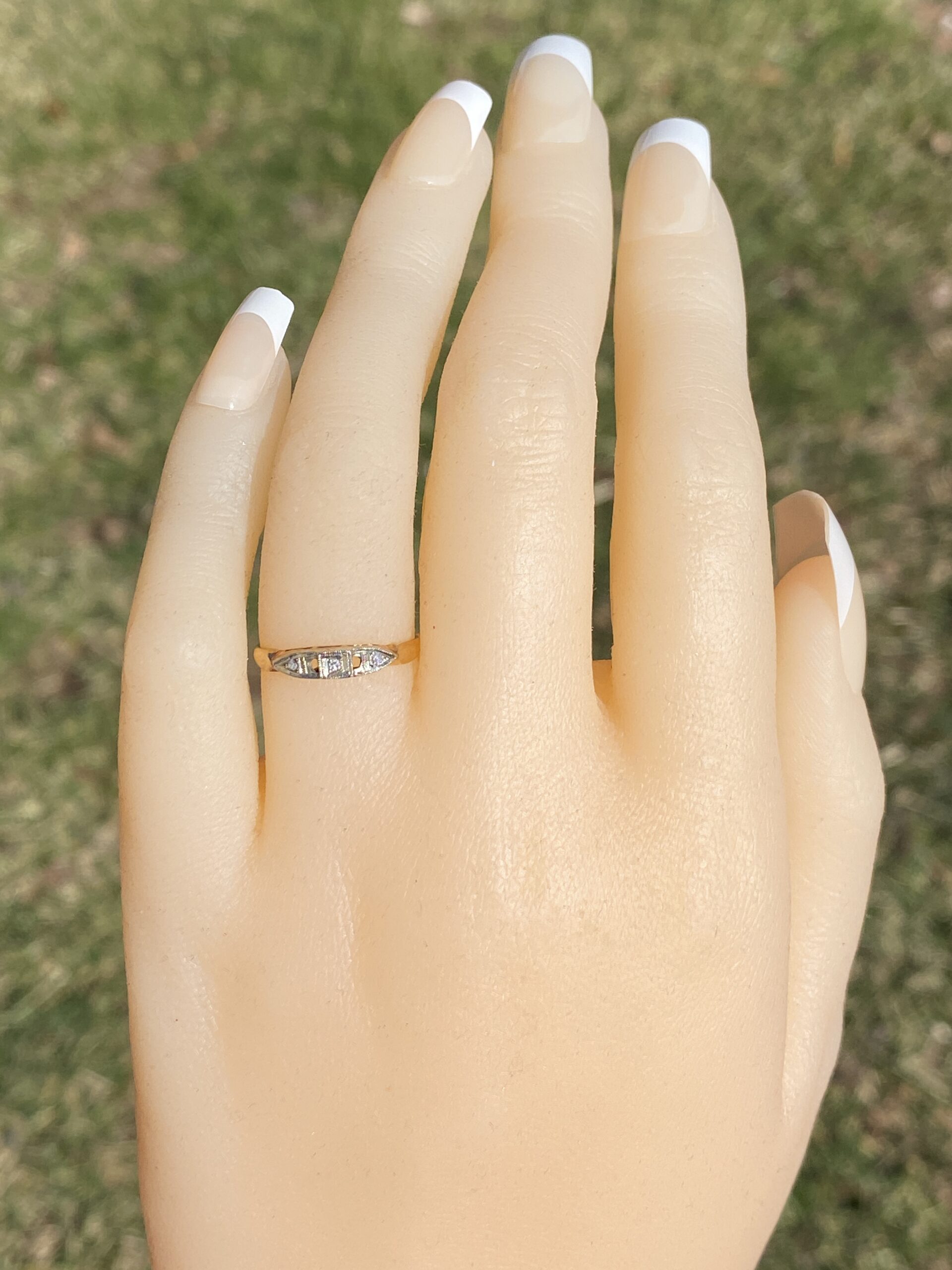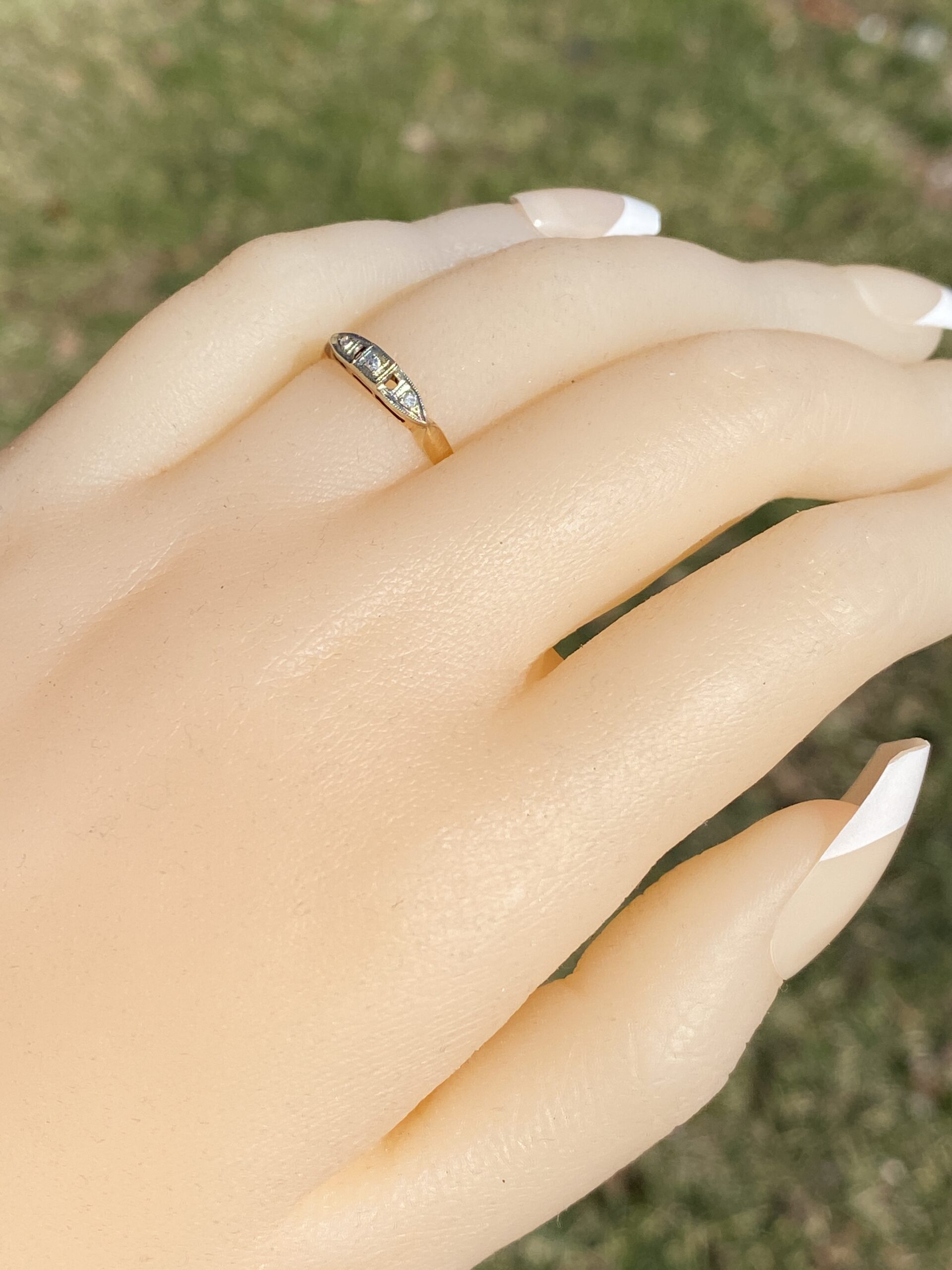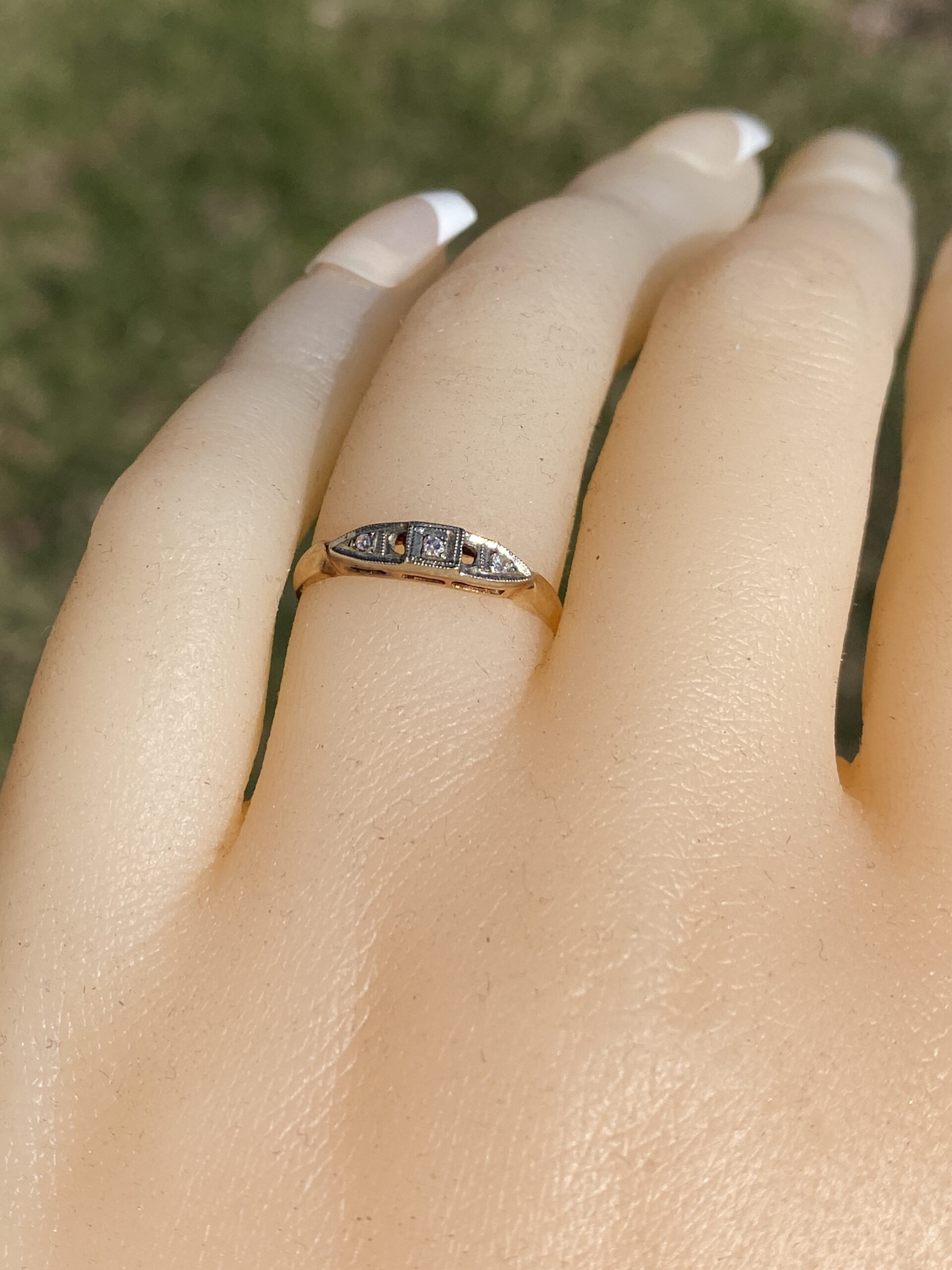 The Ever: Antique Retro Era Band in Yellow Gold with Natural Diamonds. This band showcases a central square box set with an old cut round natural diamond, flanked by bullet-shaped sections adorned with additional old-cut round natural diamonds. The platinum-topped sections are elegantly finished with milgrain detailing, adding a touch of refinement to the design. Crafted in lustrous 14 karat yellow gold, the ring is currently sized at 4.5 but can be adjusted to any desired finger size for an additional fee upon request, ensuring a perfect fit for its wearer.