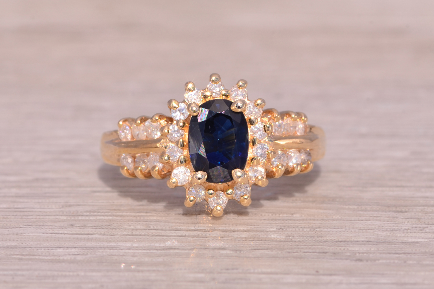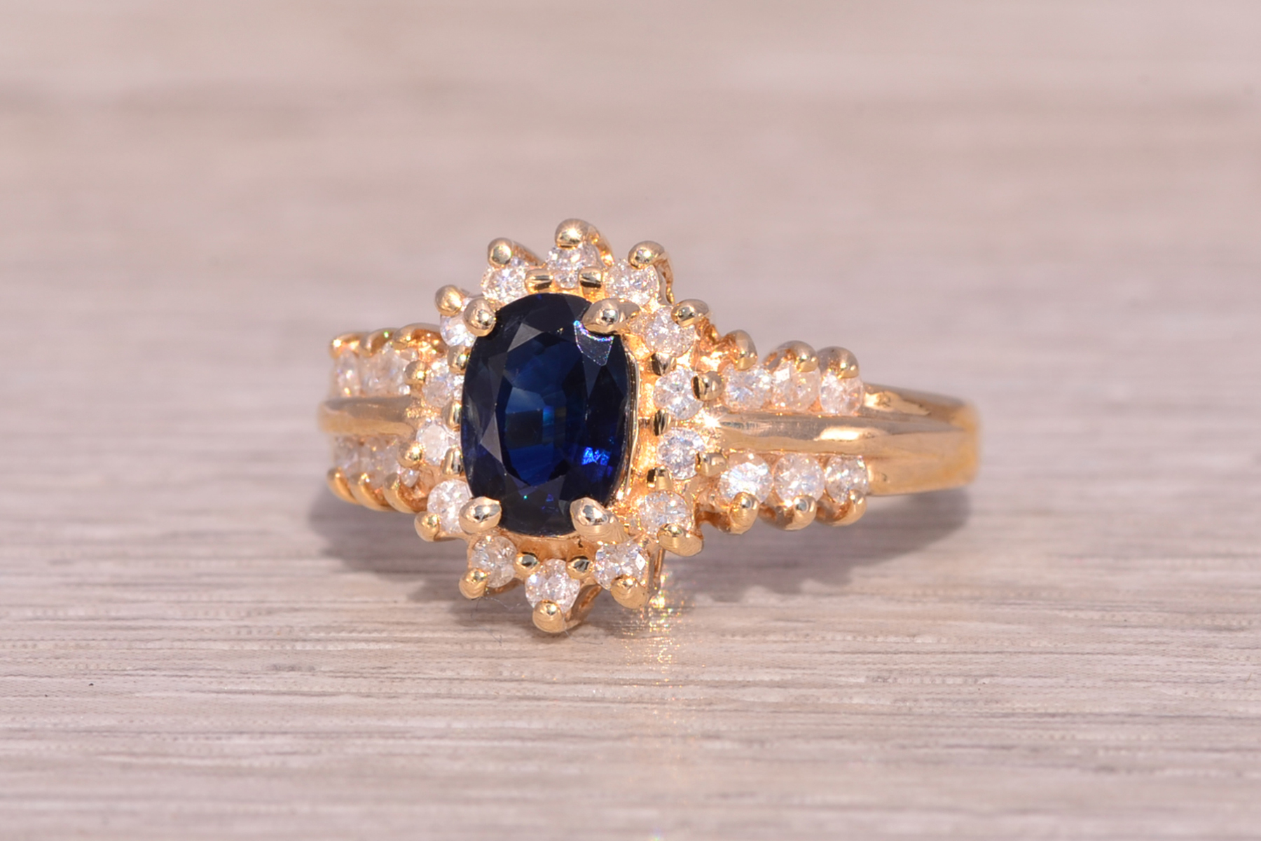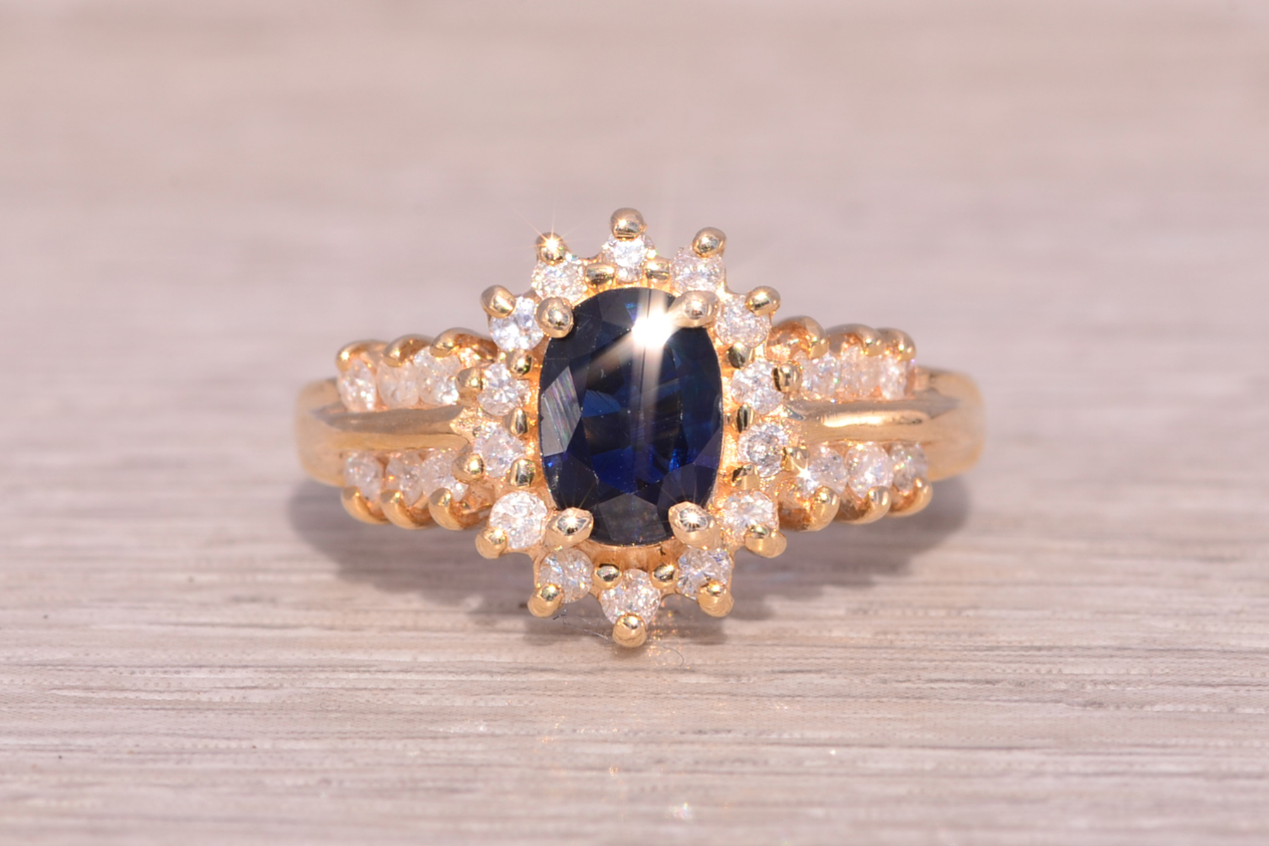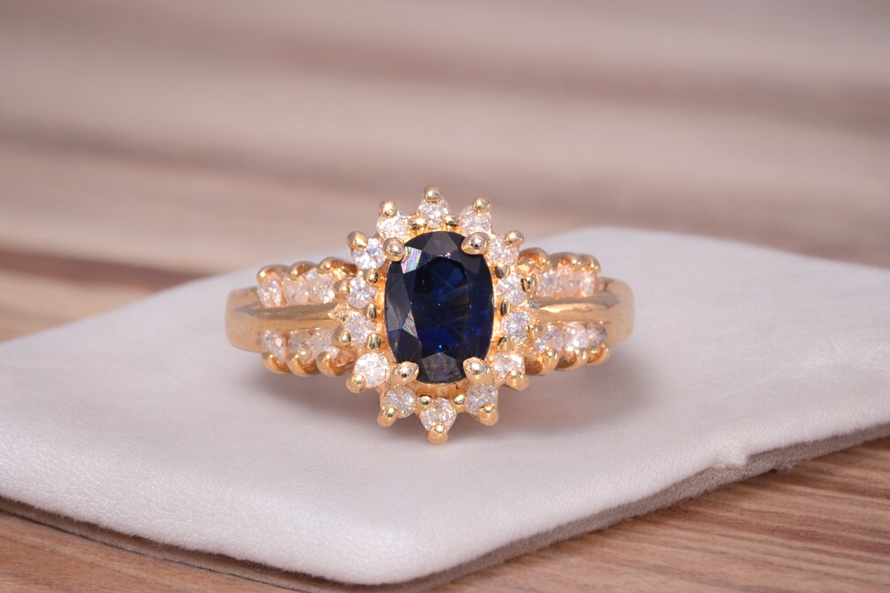 This stunning piece, known as The Exquisite Sapphire Elegance, features a captivating 1.00 carat oval cut natural sapphire at its center. The deep blue sapphire is elegantly framed by a halo of round natural diamonds, totaling approximately 0.24 carats, adding sparkle and sophistication to the design. The diamonds continue down the split shank, enhancing the luxurious appearance. The ring is crafted in 14 karat yellow gold and is signed by the designer, Exquisite, making it a truly unique piece. The ring is currently a finger size 5.5 but can be adjusted to any finger size for an additional charge upon request, ensuring a perfect fit.