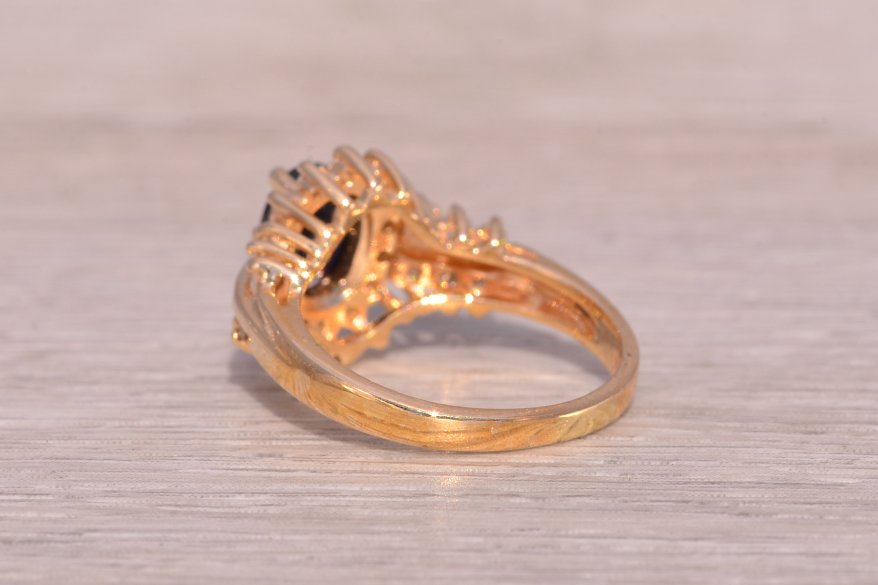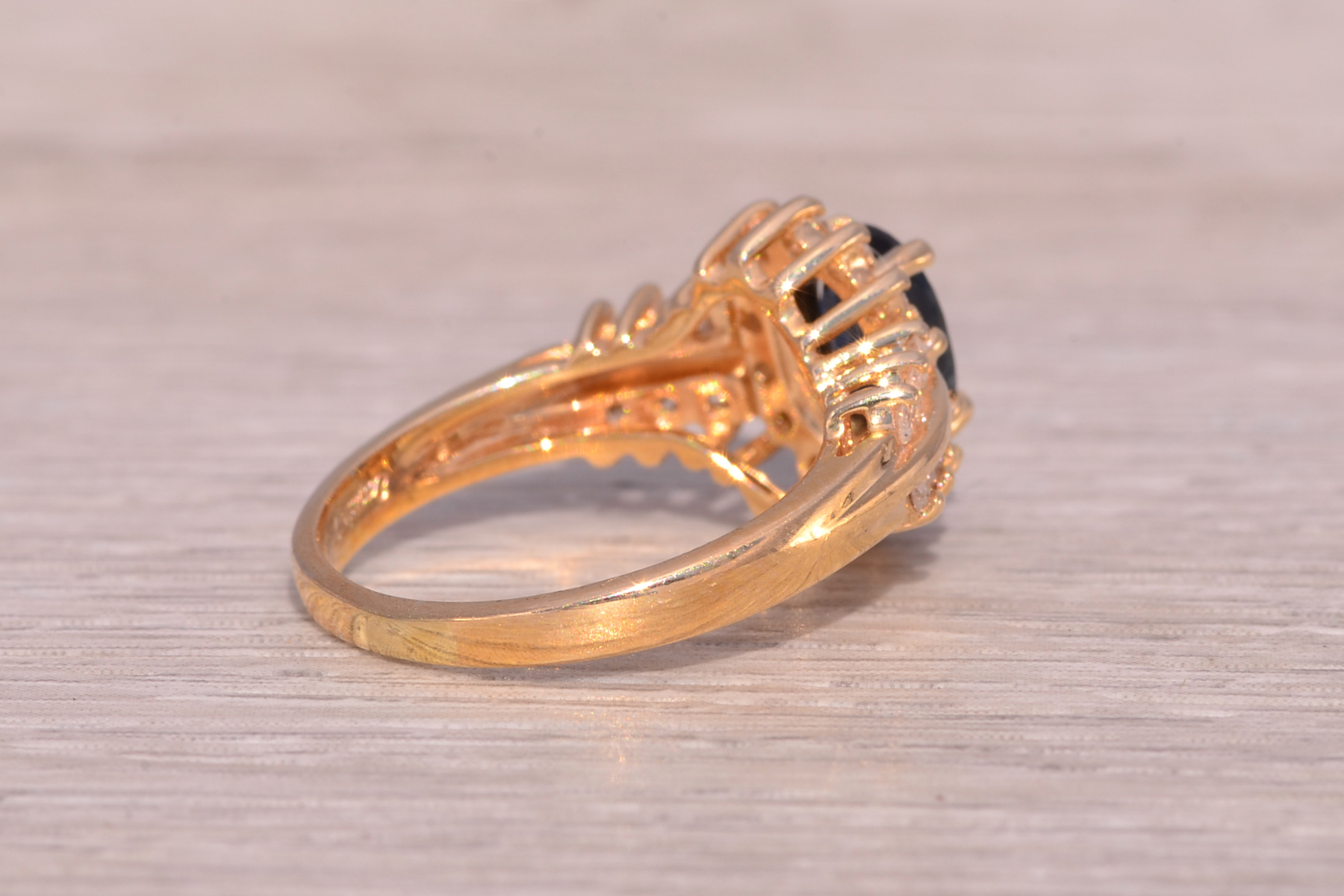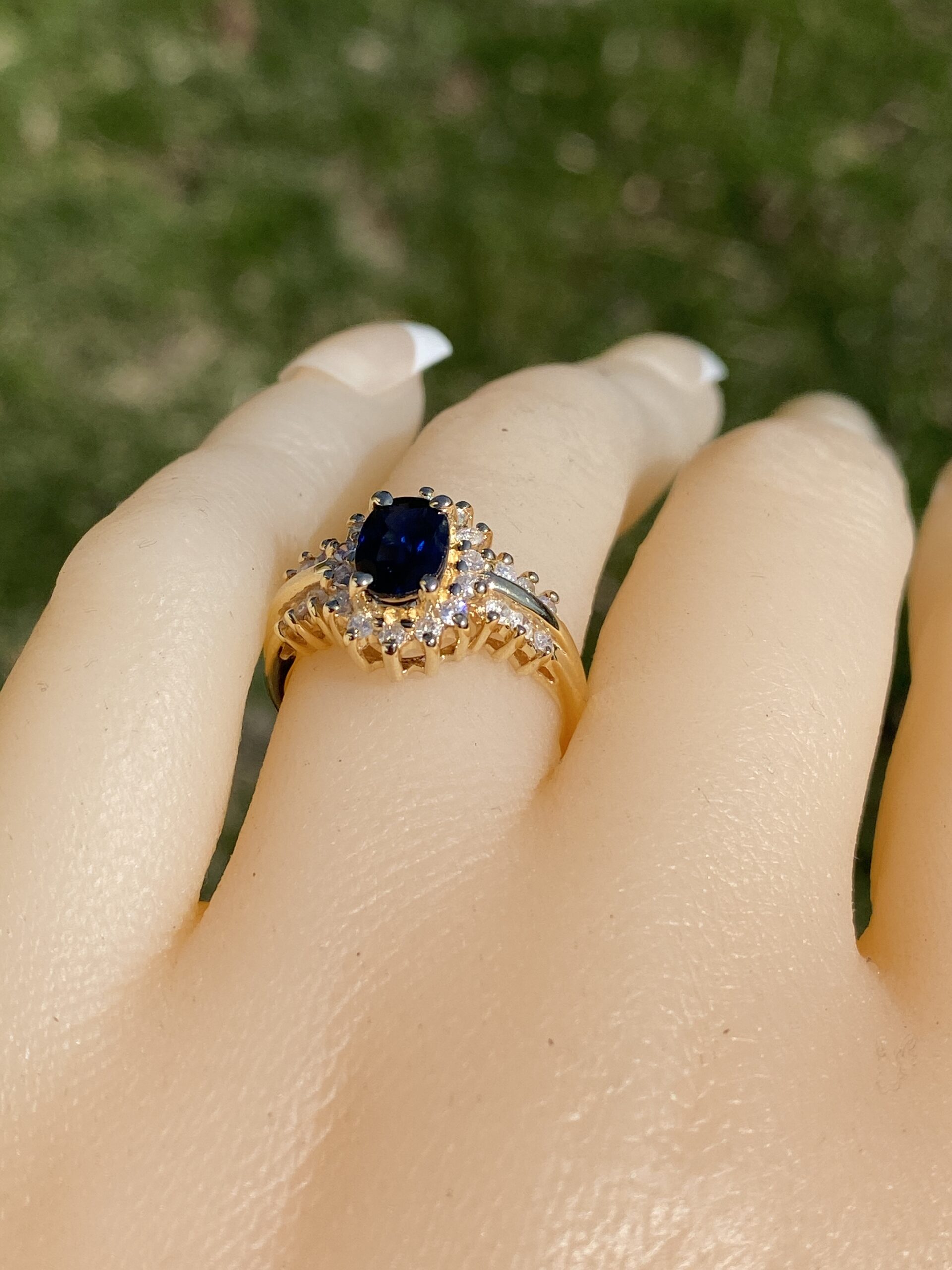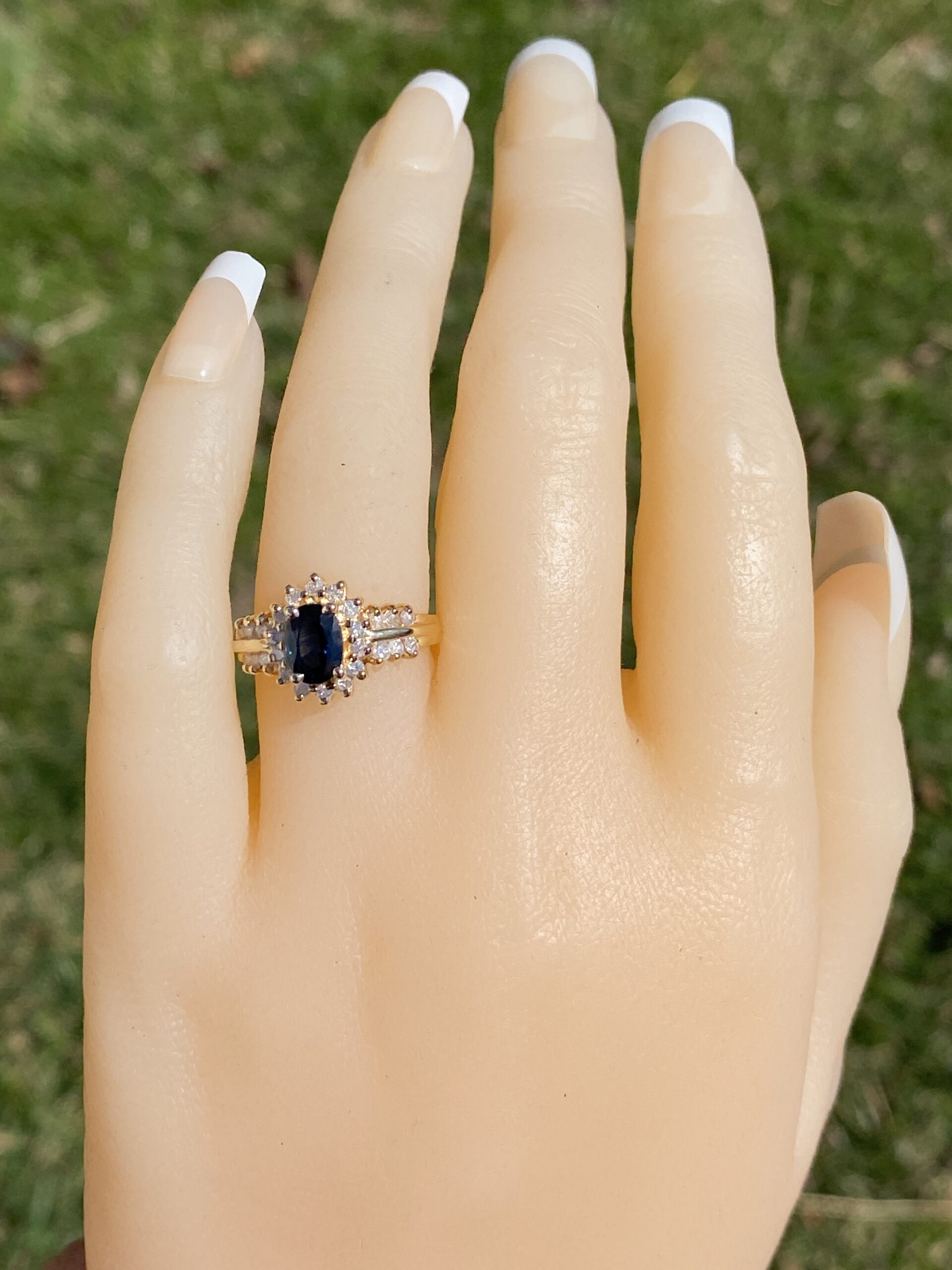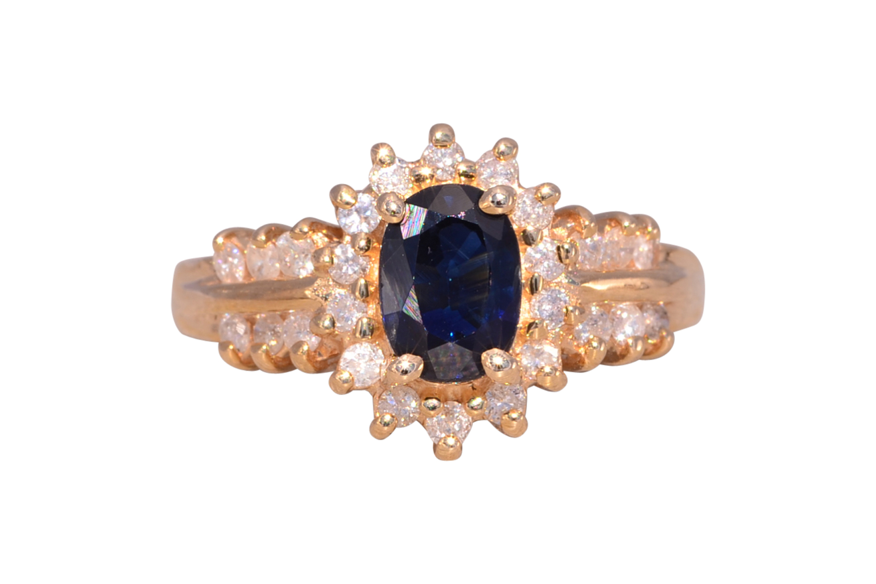 This stunning piece, known as The Exquisite Sapphire Elegance, features a captivating 1.00 carat oval cut natural sapphire at its center. The deep blue sapphire is elegantly framed by a halo of round natural diamonds, totaling approximately 0.24 carats, adding sparkle and sophistication to the design. The diamonds continue down the split shank, enhancing the luxurious appearance. The ring is crafted in 14 karat yellow gold and is signed by the designer, Exquisite, making it a truly unique piece. The ring is currently a finger size 5.5 but can be adjusted to any finger size for an additional charge upon request, ensuring a perfect fit.