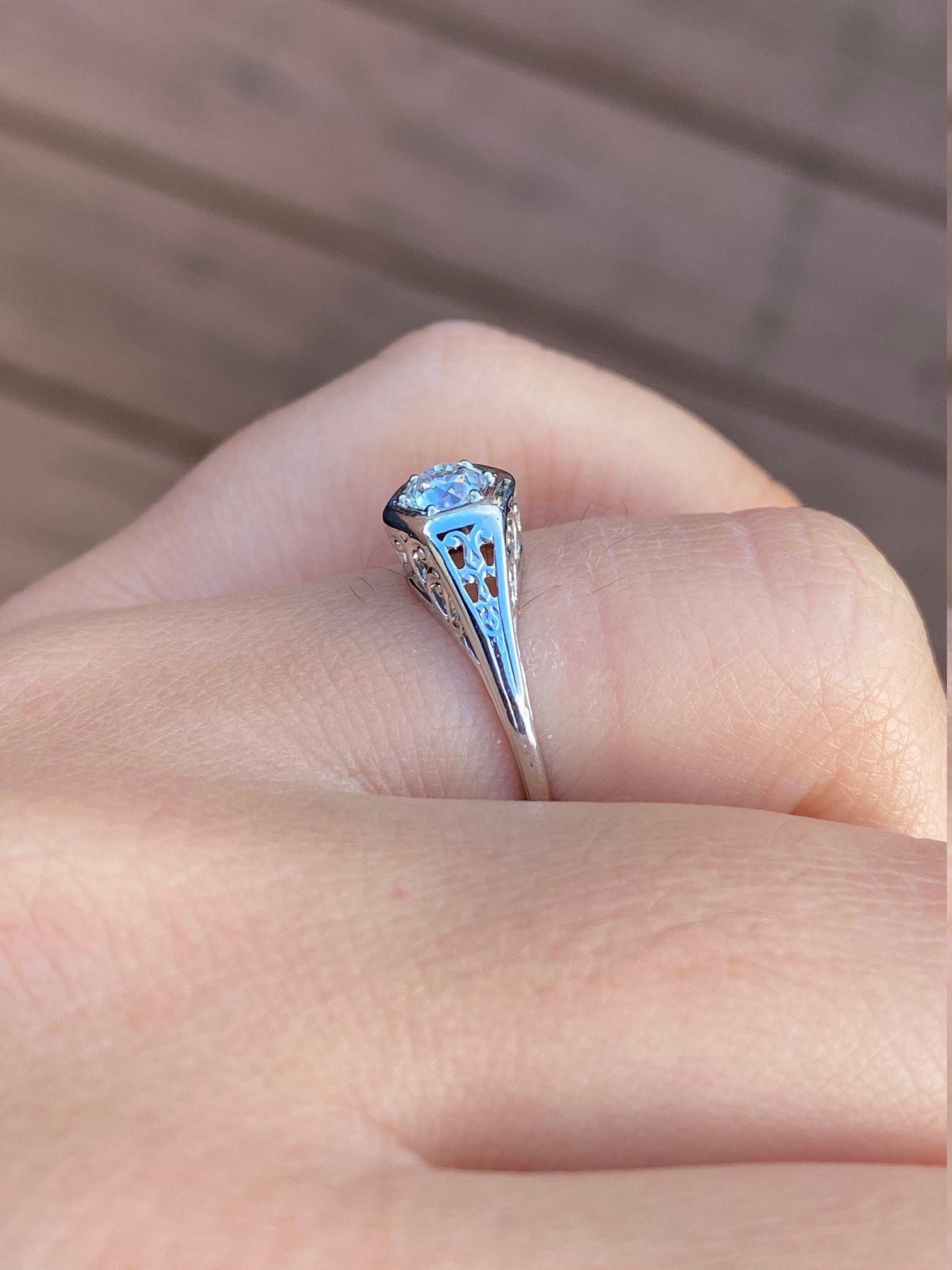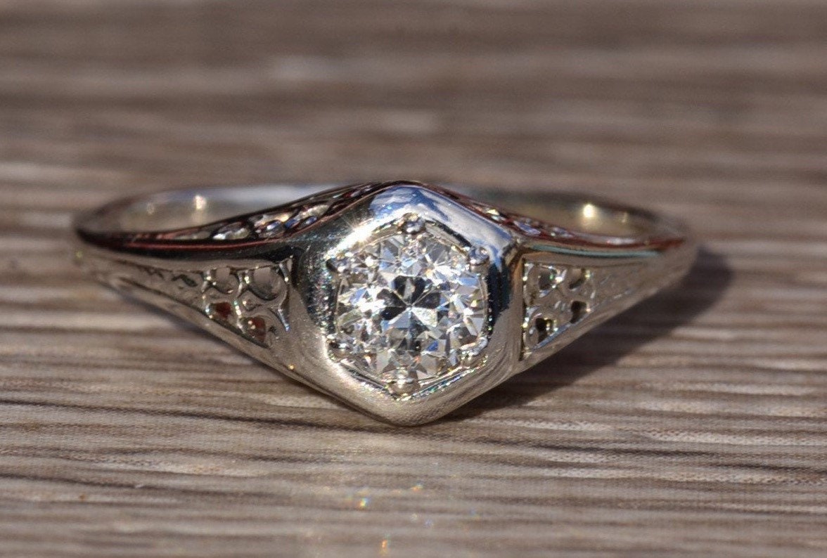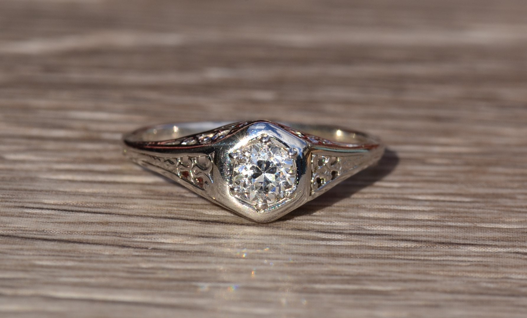 18 Karat White Gold Filigree Engagement Ring set with 0.35 Carat Diamond. This antique ring is crafted in 18 karat white gold and centers on a 0.35 carat bead set old mine cut center stone. The diamond has an approximate Gemological Institute of America clarity grade of Vvs1 and a color grade of F. The stone is surrounding by scroll work that can be seen in the through finger view. The ring is a finger size 5 3/4, yet can be adjusted in size.