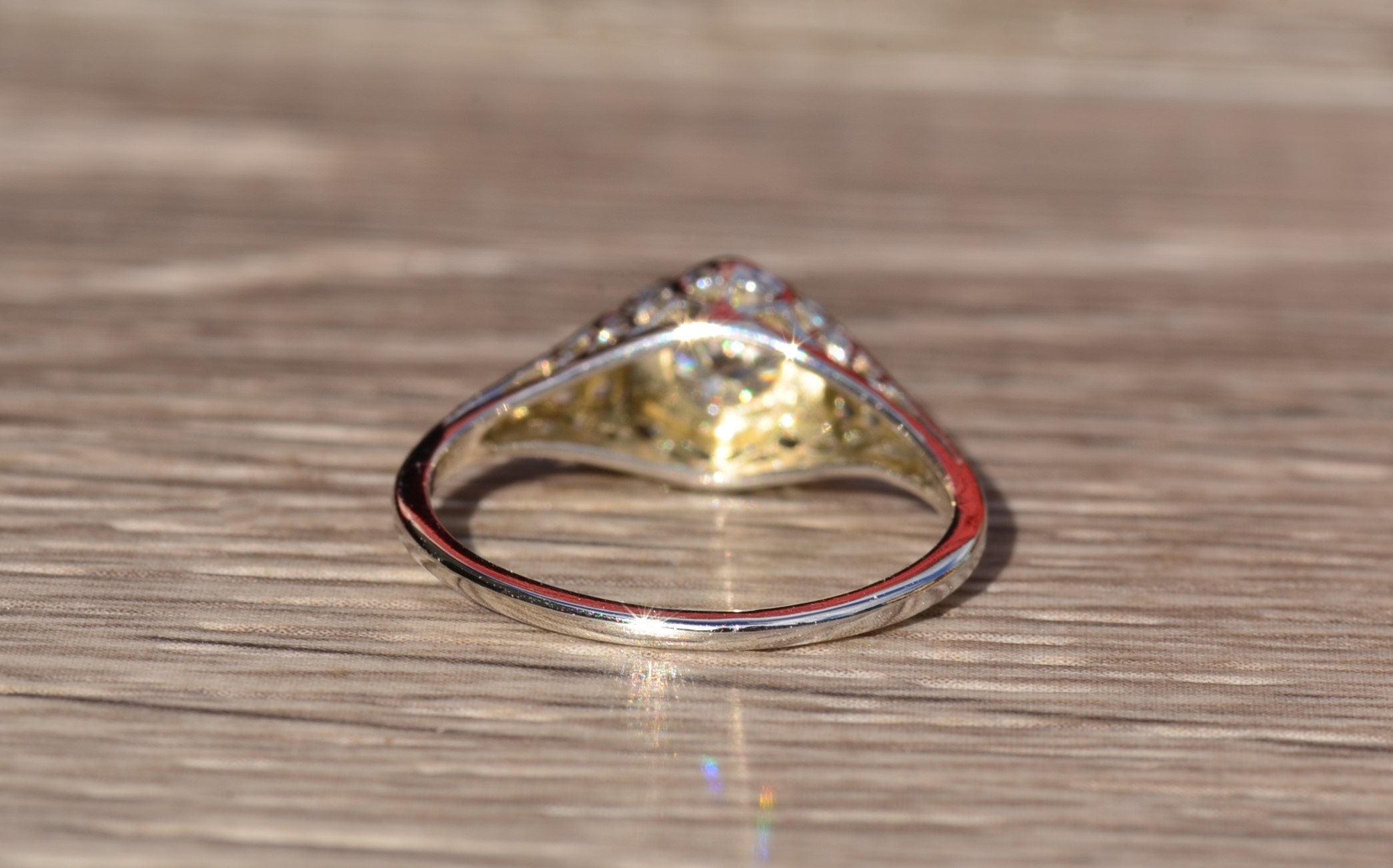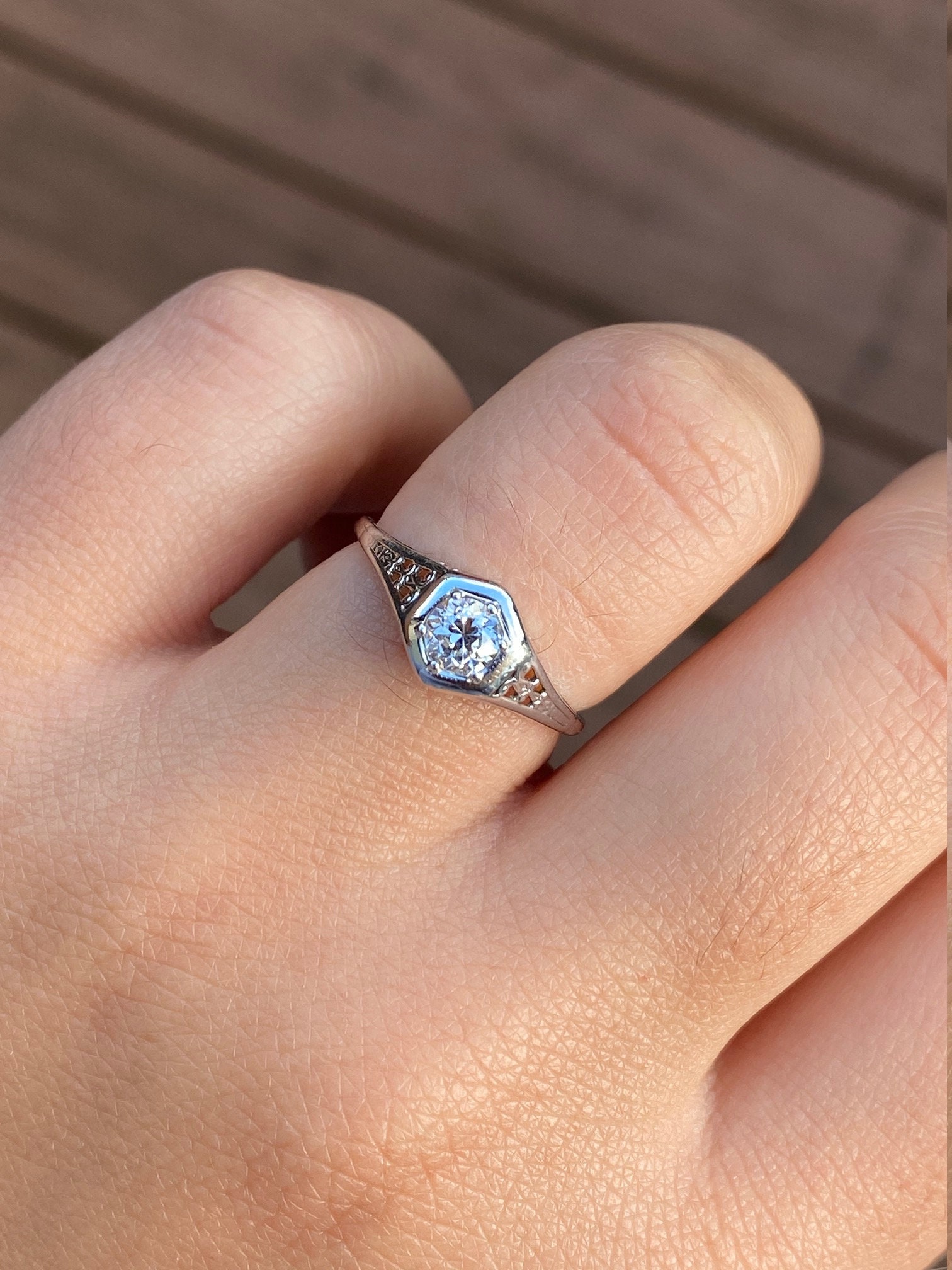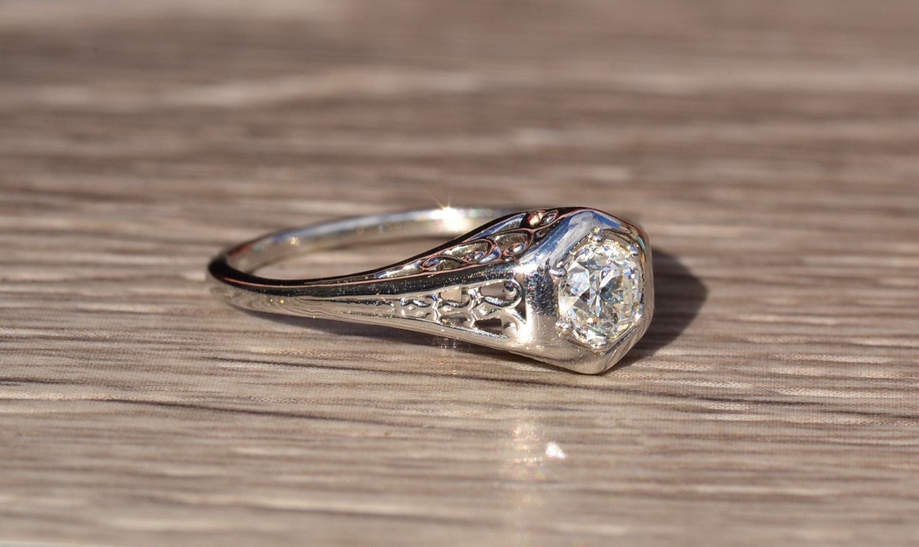 18 Karat White Gold Filigree Engagement Ring set with 0.35 Carat Diamond. This antique ring is crafted in 18 karat white gold and centers on a 0.35 carat bead set old mine cut center stone. The diamond has an approximate Gemological Institute of America clarity grade of Vvs1 and a color grade of F. The stone is surrounding by scroll work that can be seen in the through finger view. The ring is a finger size 5 3/4, yet can be adjusted in size.
