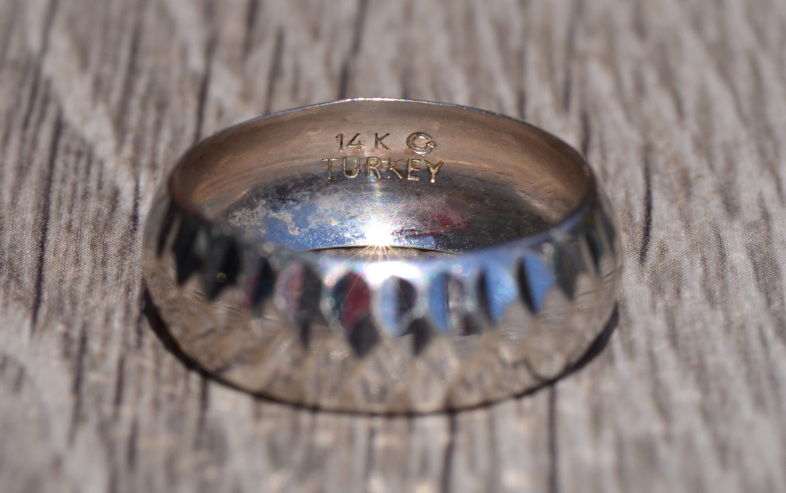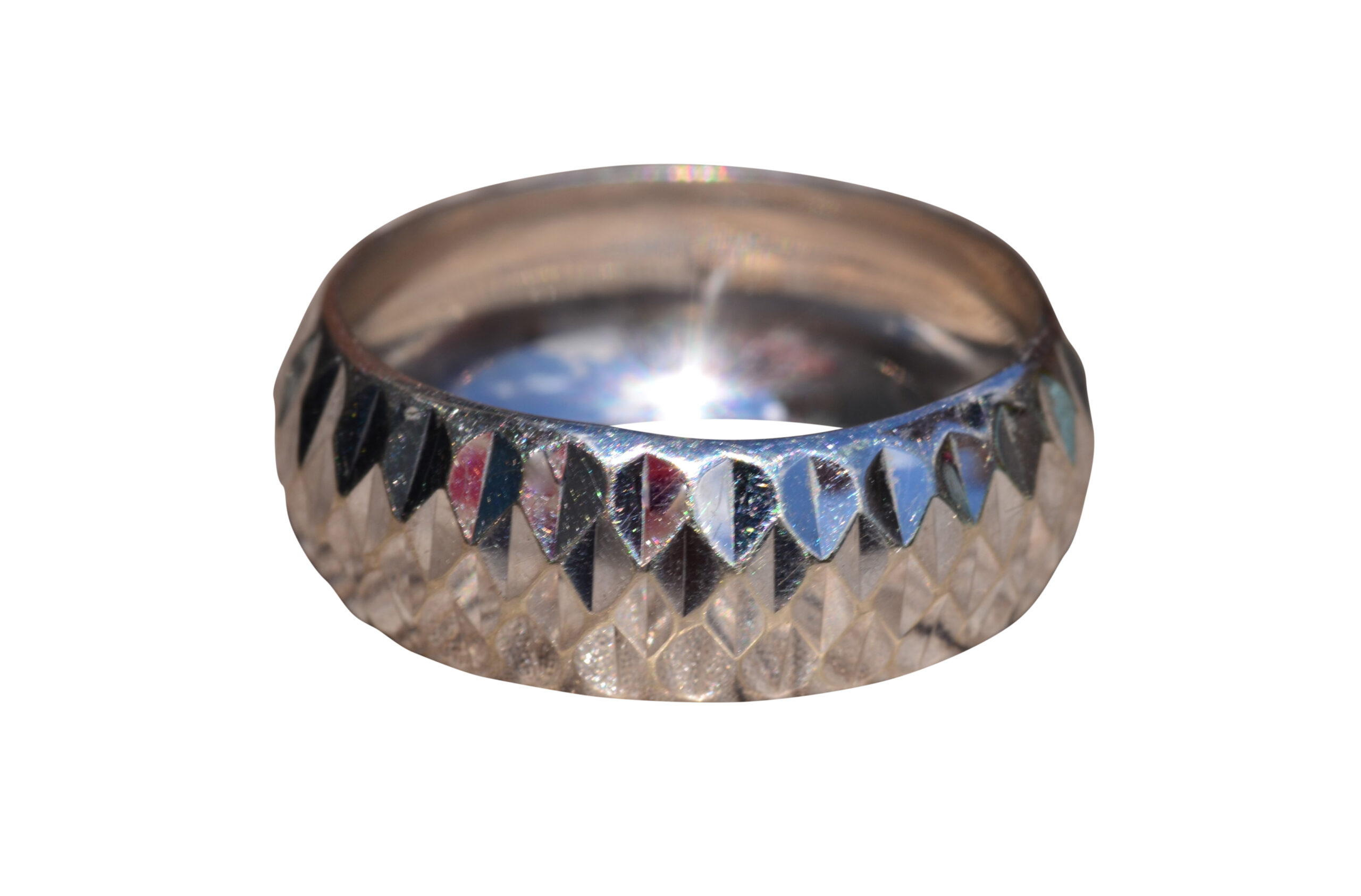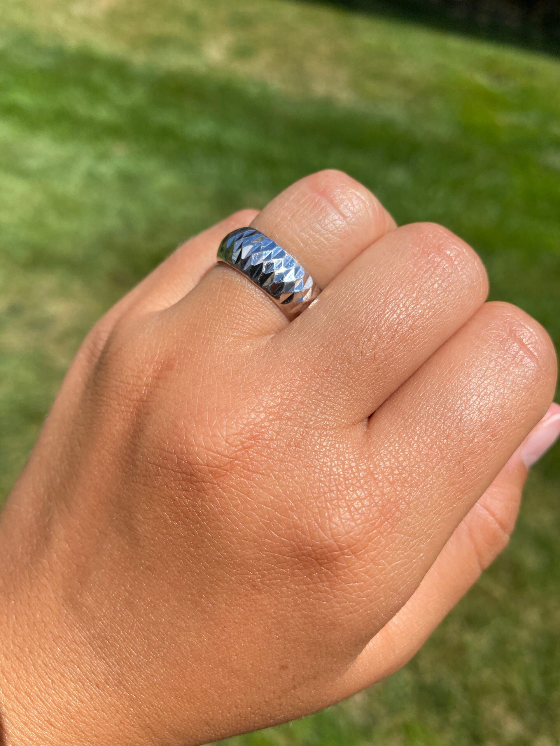 Faceted White Gold Band Style Ring. The ring features a wide appearance with multi facets across the top. Smooth, low, and comfortable to wear this ring crafted in 14 karat white gold is a finger size 8.