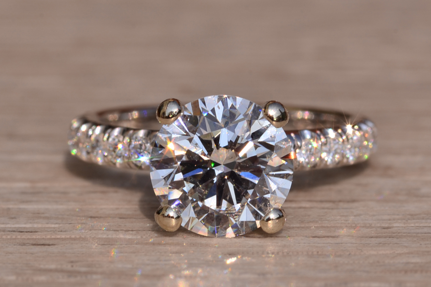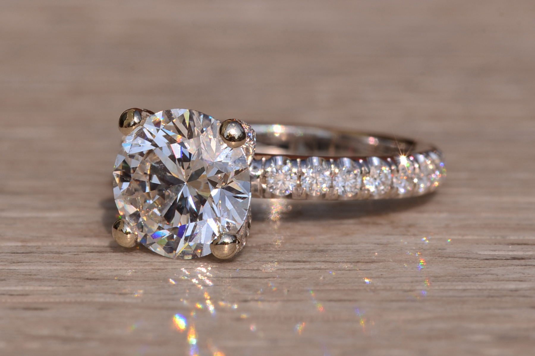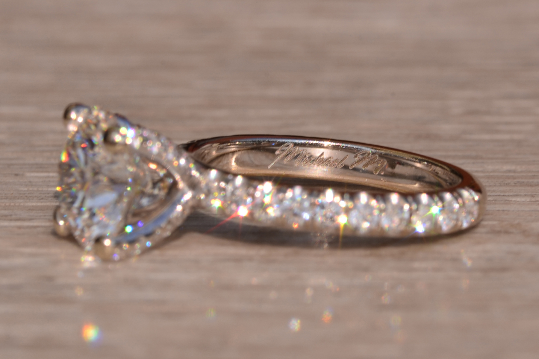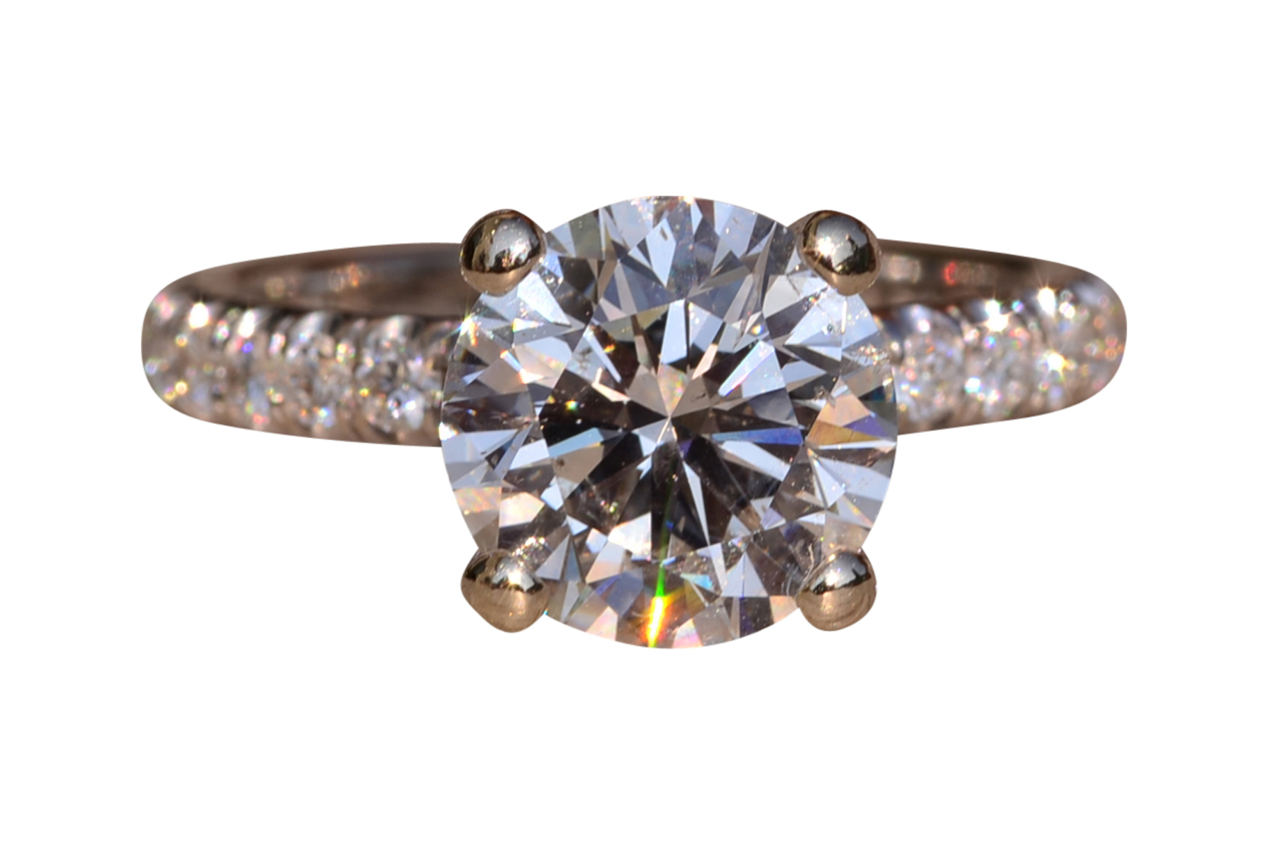 The Fort Pond Bay: 2.50 Carat Round Brilliant Cut Natural Diamond Engagement Ring. The ring features a central four (4) prong set 2.50 carat round brilliant cut natural diamond with a clarity grade of Si2 and a color grade of I. The diamond has an American Gem Society Laboratory Report AGS#104046931004. Diamonds continue down the prongs and on either side of the center in a French set style setting. The total weight of diamonds in the mounting is 0.50 carats. The ring is crafted in 18 karat white gold and the ring is currently a finger size 5 1/2 yet can be adjusted to any finger size for an additional charge on request. The ring is signed by its designer Michael M.