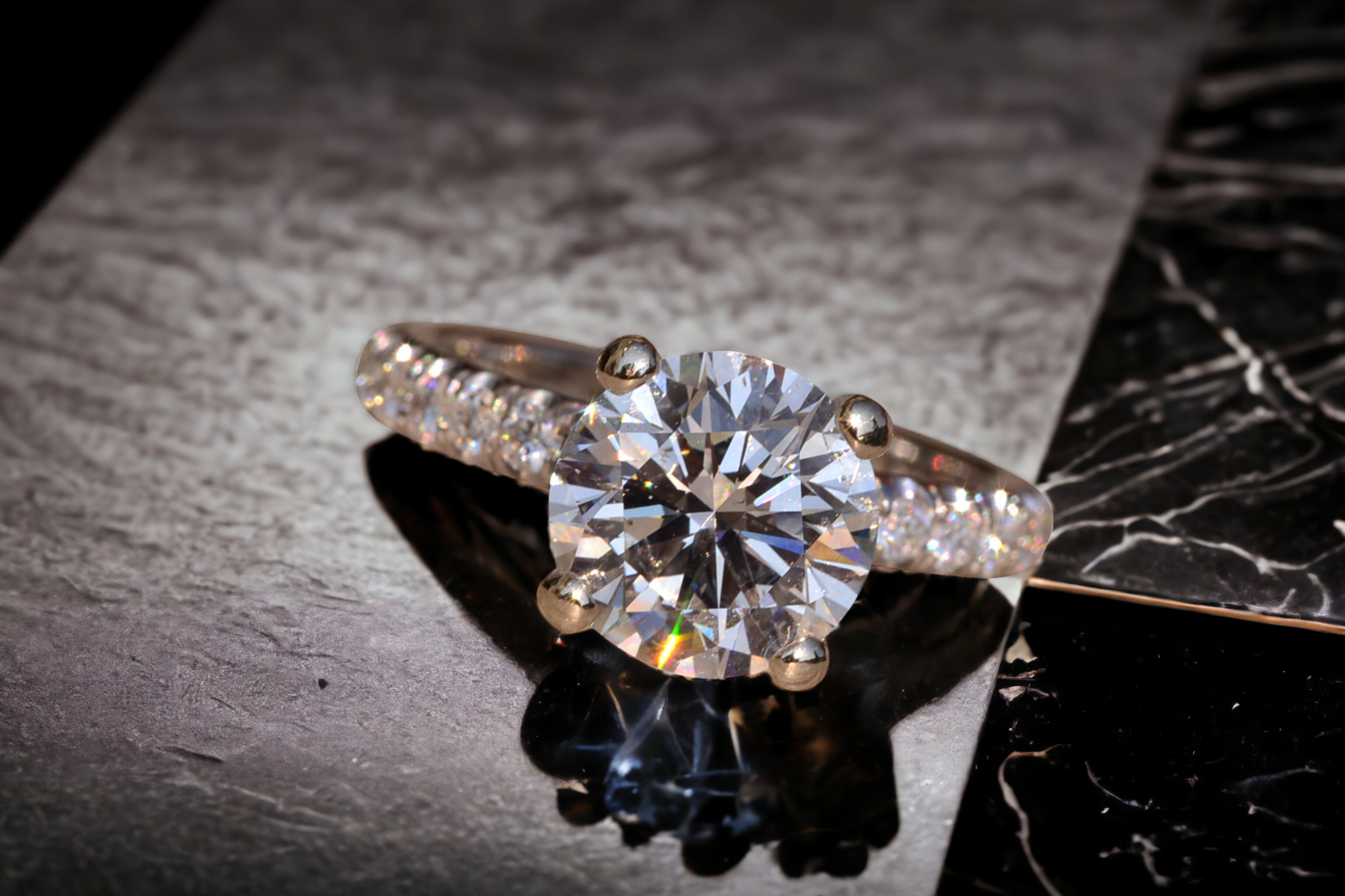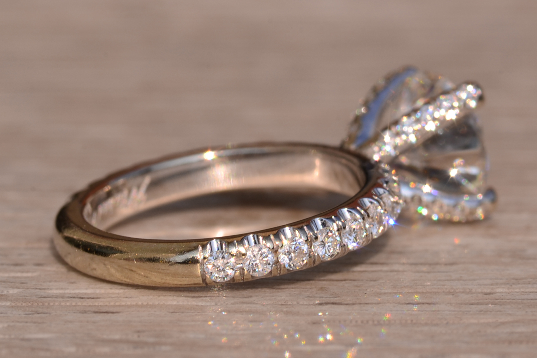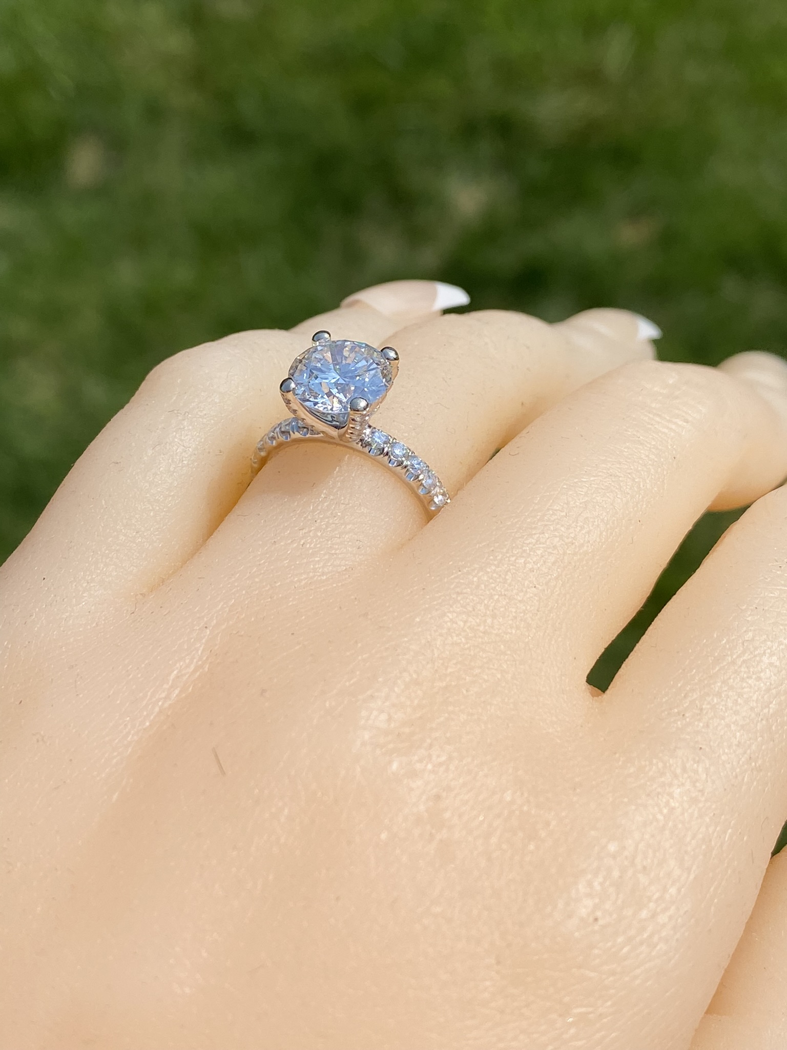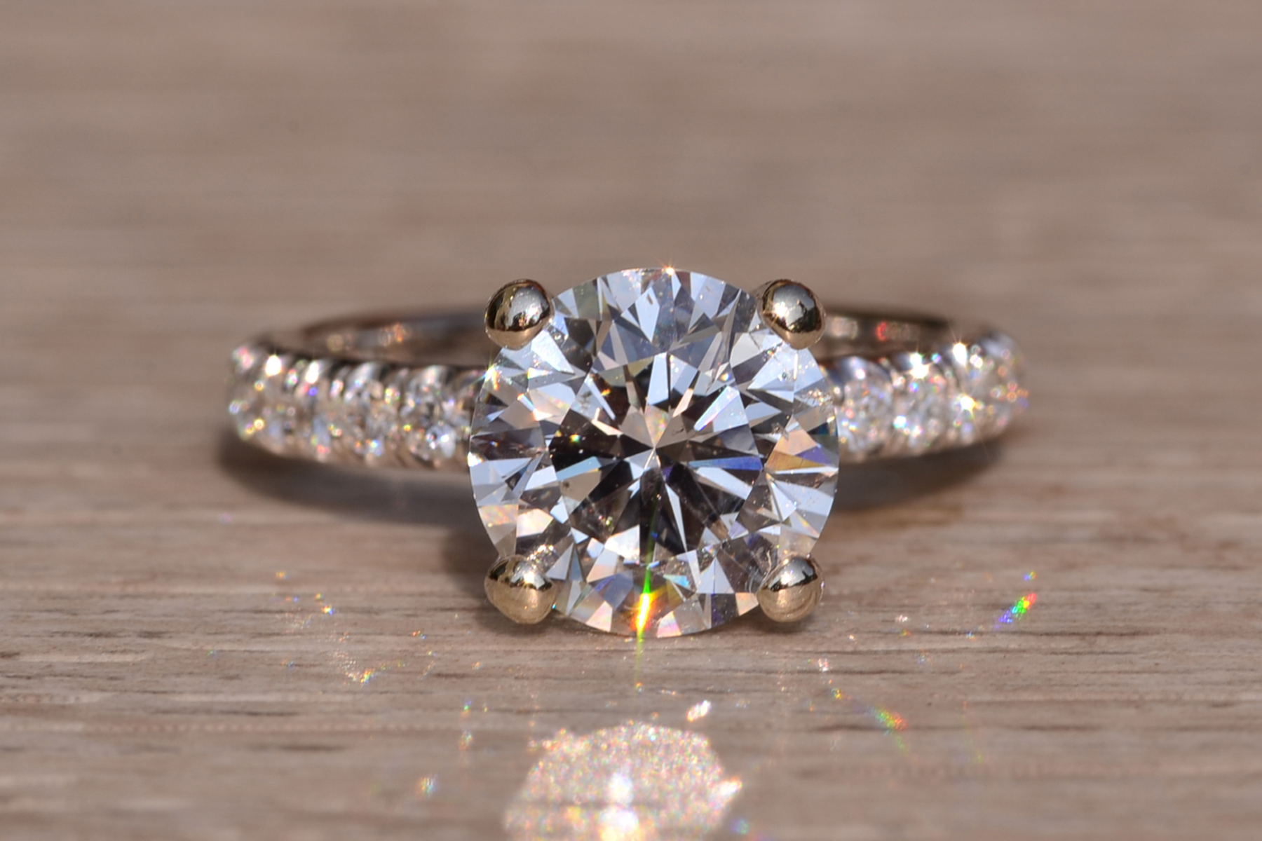 The Fort Pond Bay: 2.50 Carat Round Brilliant Cut Natural Diamond Engagement Ring. The ring features a central four (4) prong set 2.50 carat round brilliant cut natural diamond with a clarity grade of Si2 and a color grade of I. The diamond has an American Gem Society Laboratory Report AGS#104046931004. Diamonds continue down the prongs and on either side of the center in a French set style setting. The total weight of diamonds in the mounting is 0.50 carats. The ring is crafted in 18 karat white gold and the ring is currently a finger size 5 1/2 yet can be adjusted to any finger size for an additional charge on request. The ring is signed by its designer Michael M.