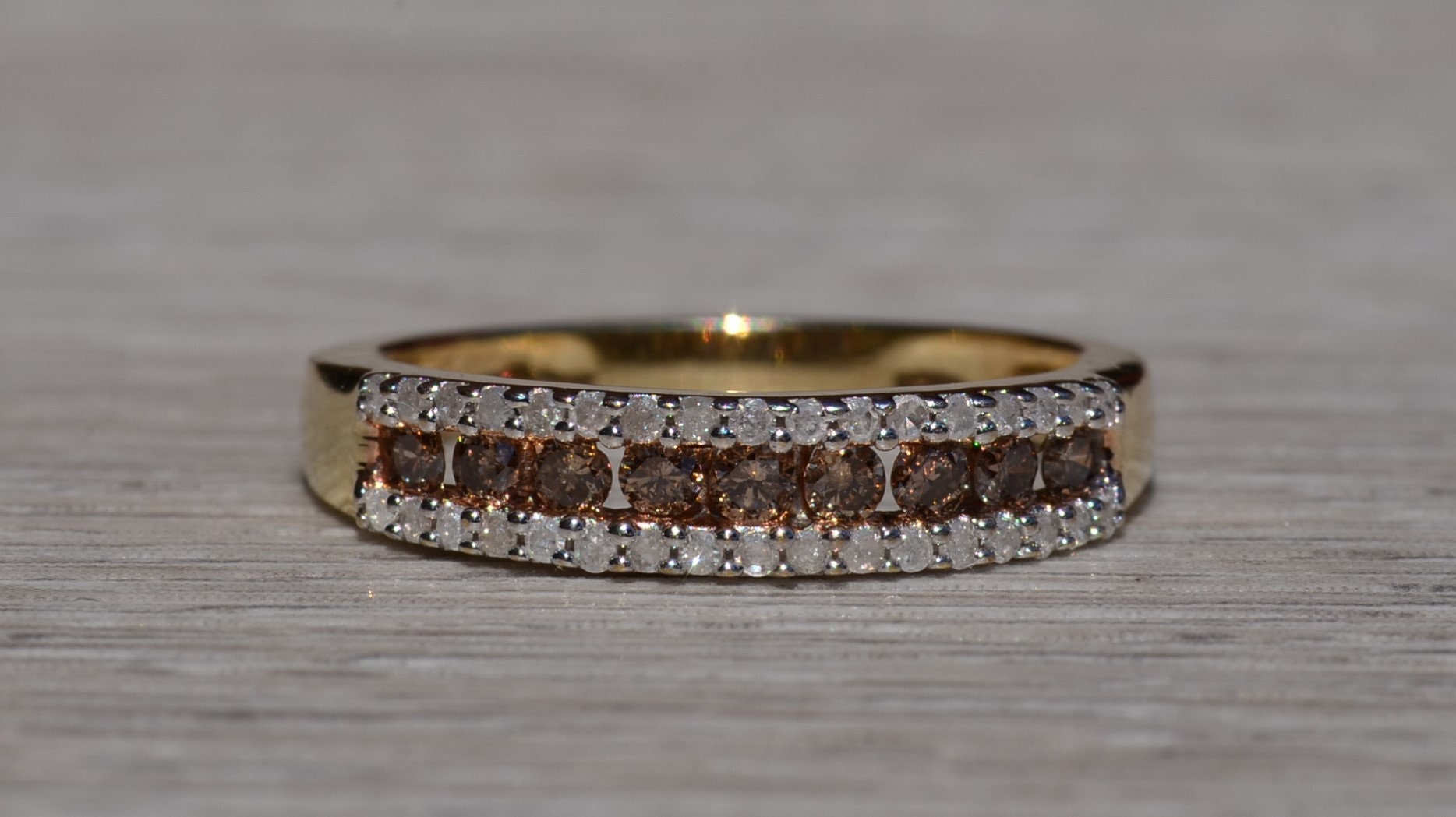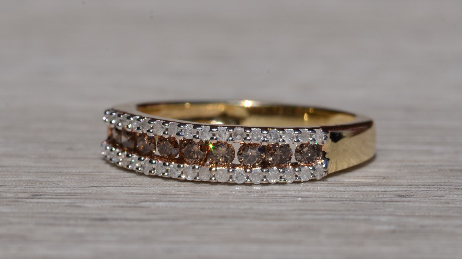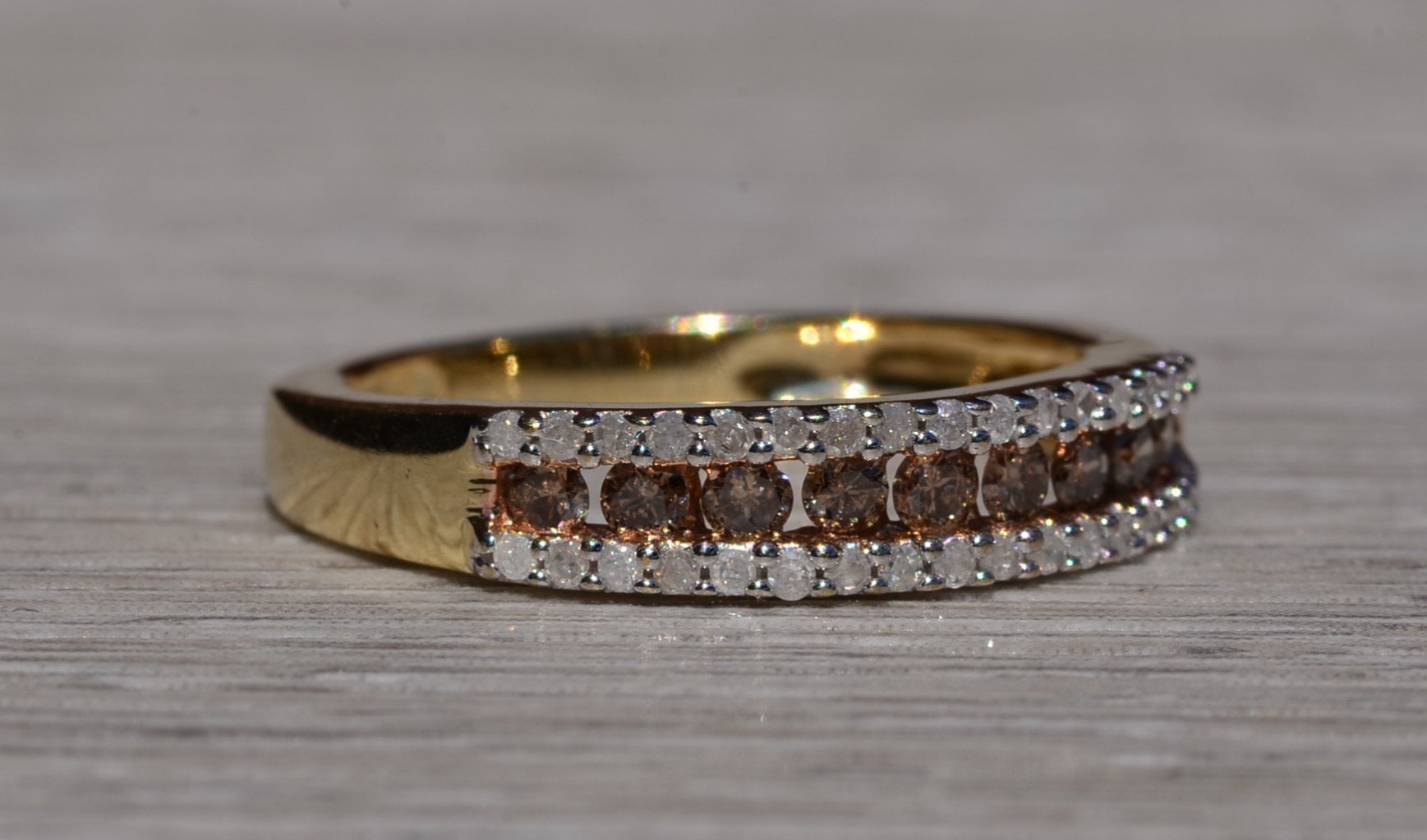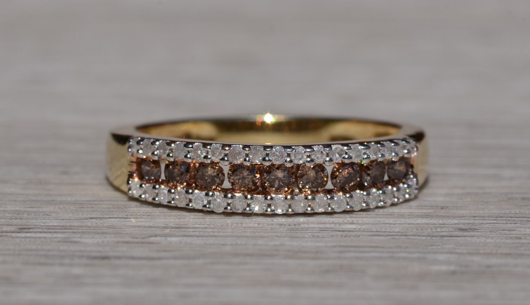 The Frink: Brown and White Diamond Stackable Band in Yellow Gold. The band features a center channel set row of browne diamonds with a single row of white diamonds on either side. The ring is crafted in yellow gold and is currently a finger size 7 yet can be adjusted to any finger size for an additional charge on request.