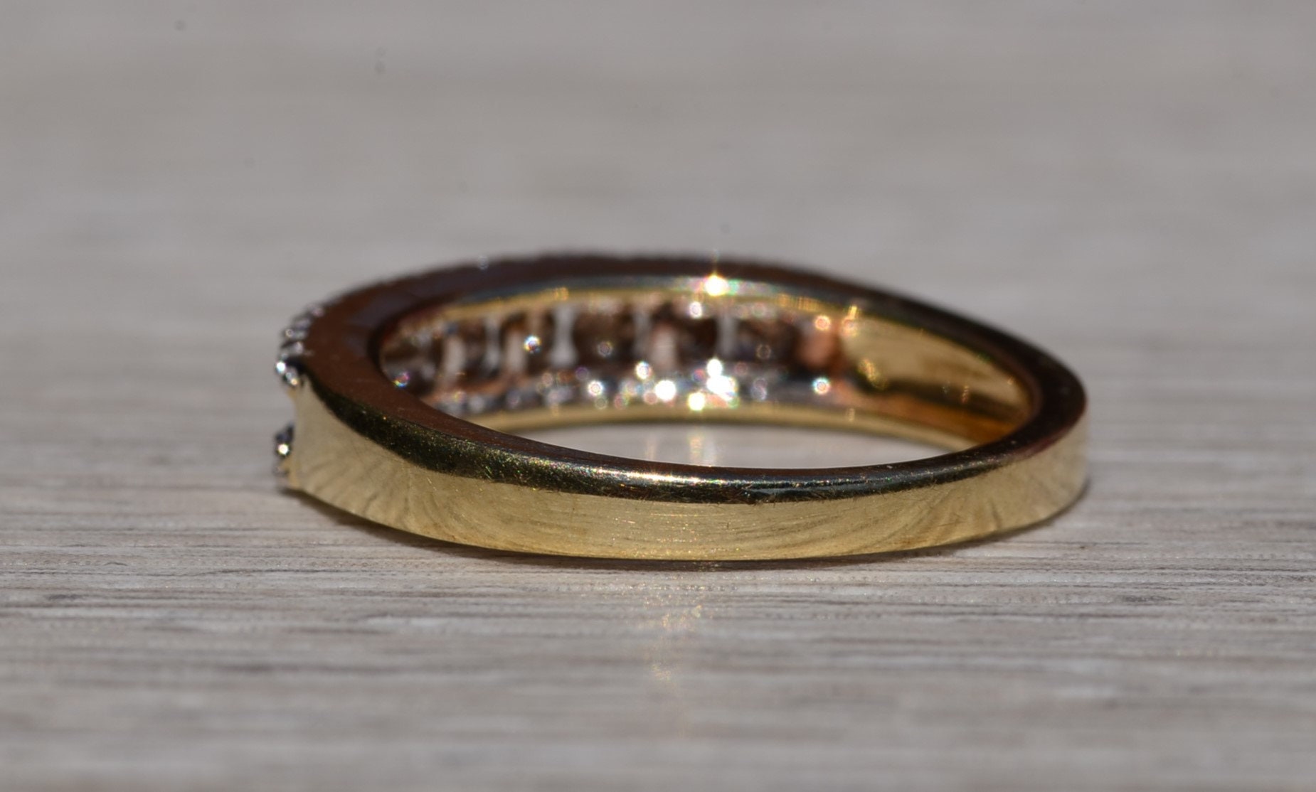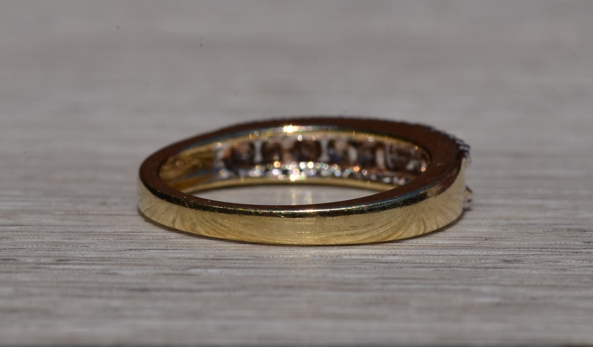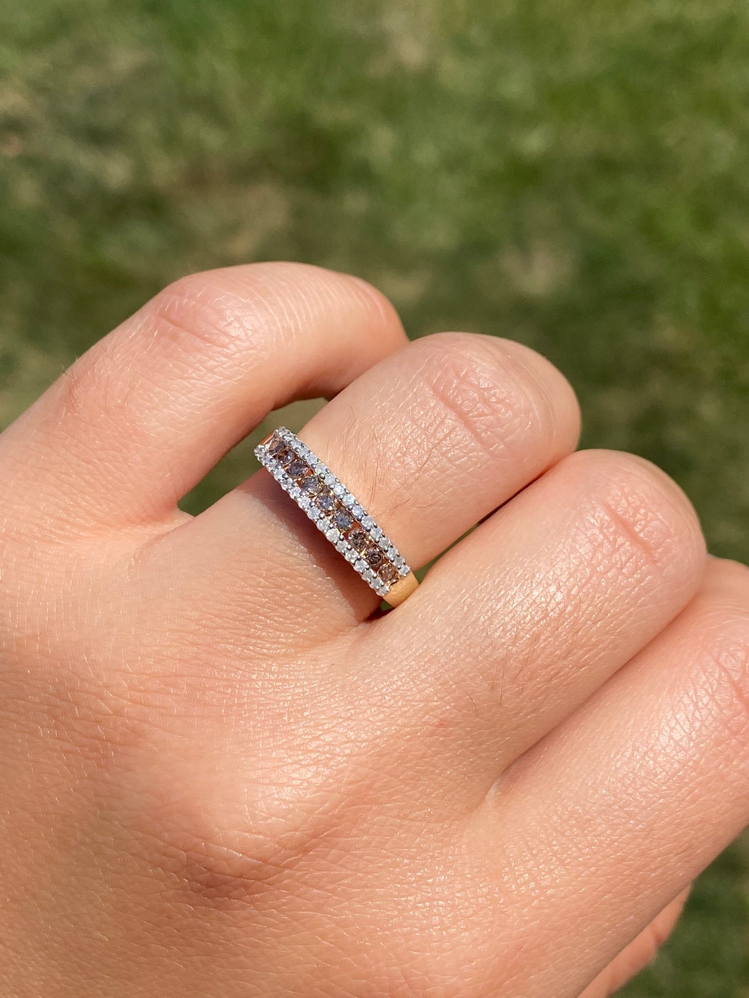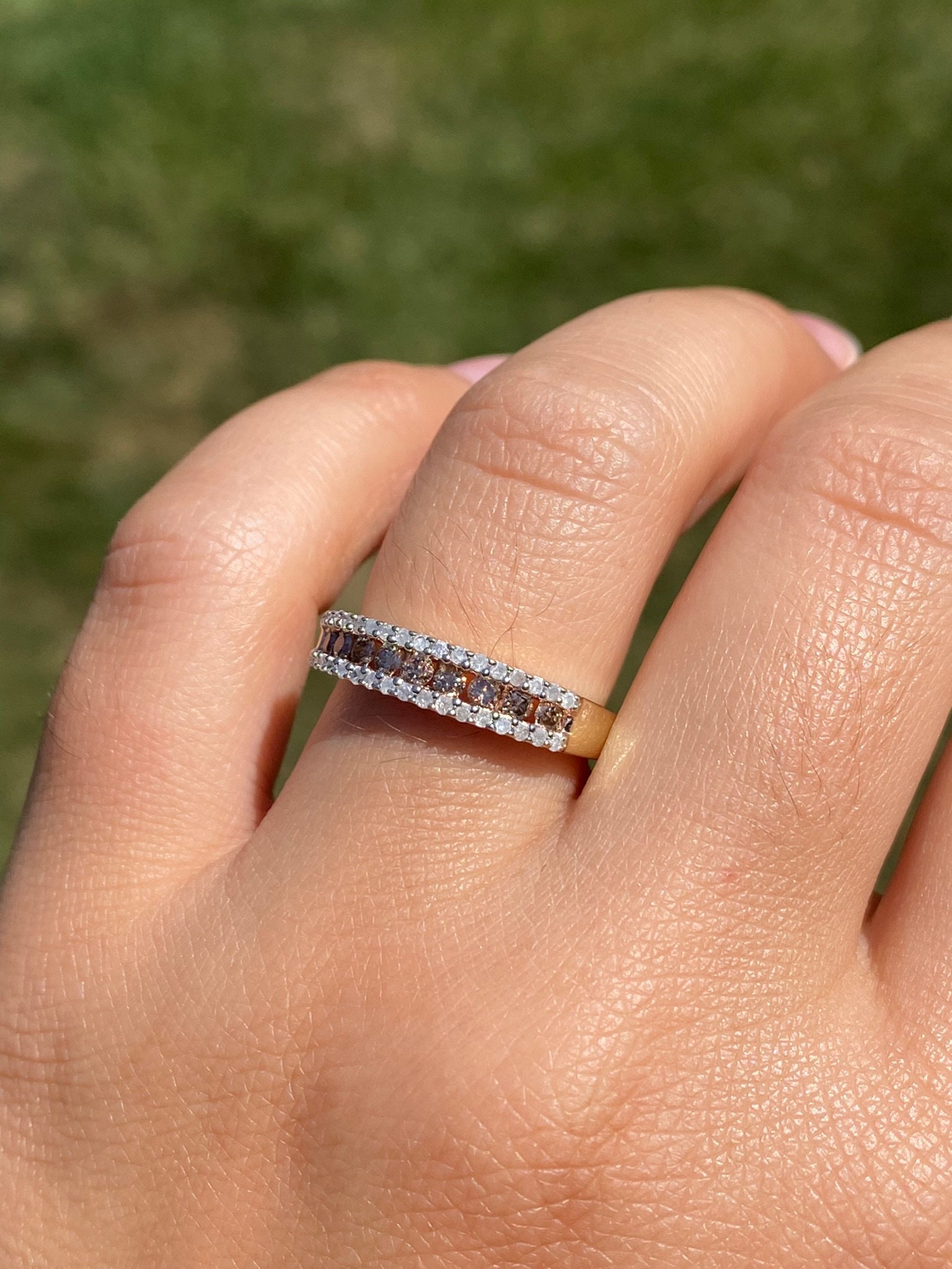 The Frink: Brown and White Diamond Stackable Band in Yellow Gold. The band features a center channel set row of browne diamonds with a single row of white diamonds on either side. The ring is crafted in yellow gold and is currently a finger size 7 yet can be adjusted to any finger size for an additional charge on request.