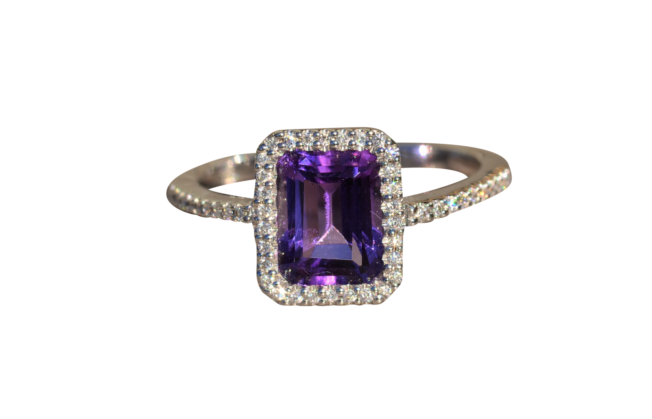 The Fuschia: Ladies Emerald Cut Amethyst and Diamond Ring in White Gold - Jewelry Memo