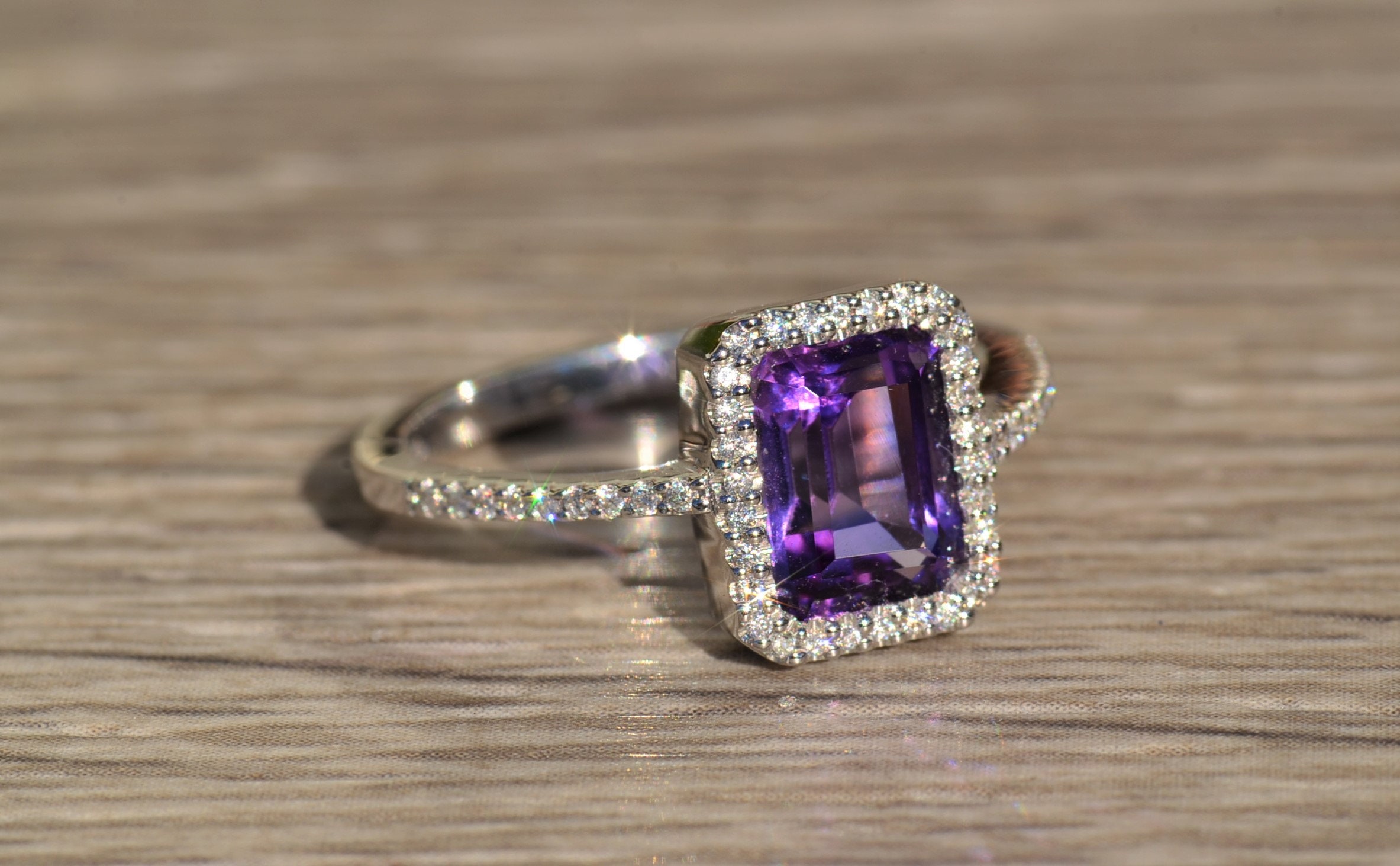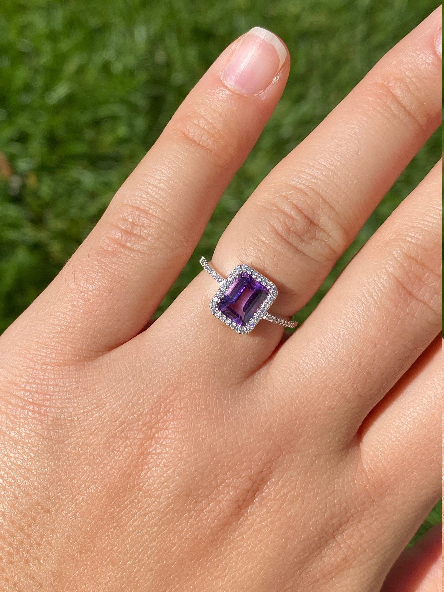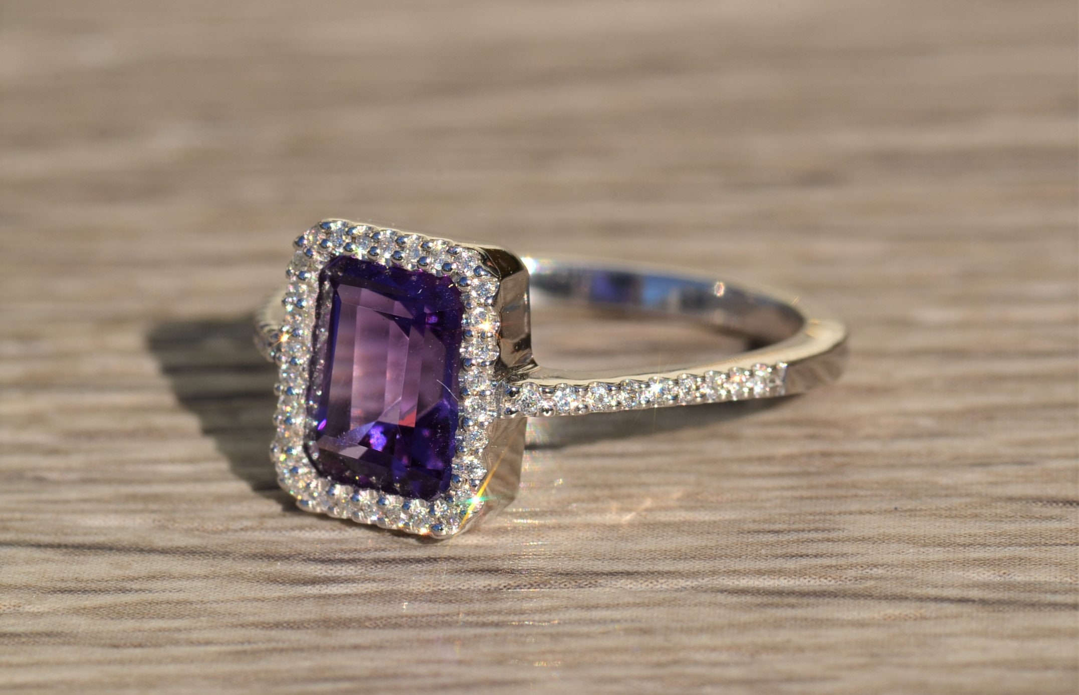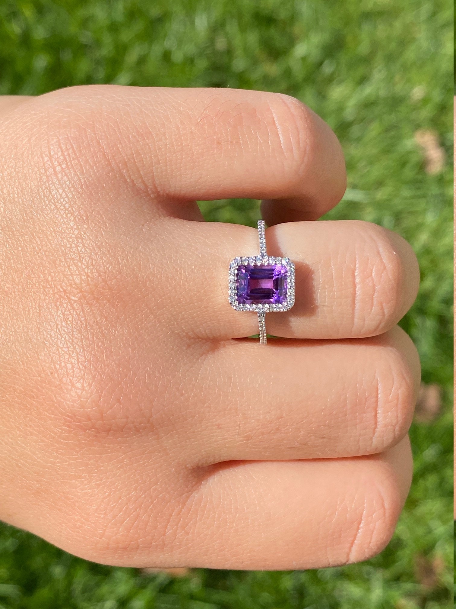 SKU: 1658 Categories: Cocktail Rings, Colored Stone Engagement Rings, Contemporary Jewelry, Engagement Rings, New & Bespoke, New & Bespoke Engagement Rings Tags: 14 karat, 14 karat gold ring, 14 karat white gold, amethyst, amethyst ring, cocktail ring, contemporary, contemporary ring, diamond, diamond halo, diamond halo ring, diamond ring, emerald cut ring, halo ring, modern, modern ring, purple, purple amethyst ring, statement ring, thin, thin diamond halo, White Gold, white gold ring, women's ring