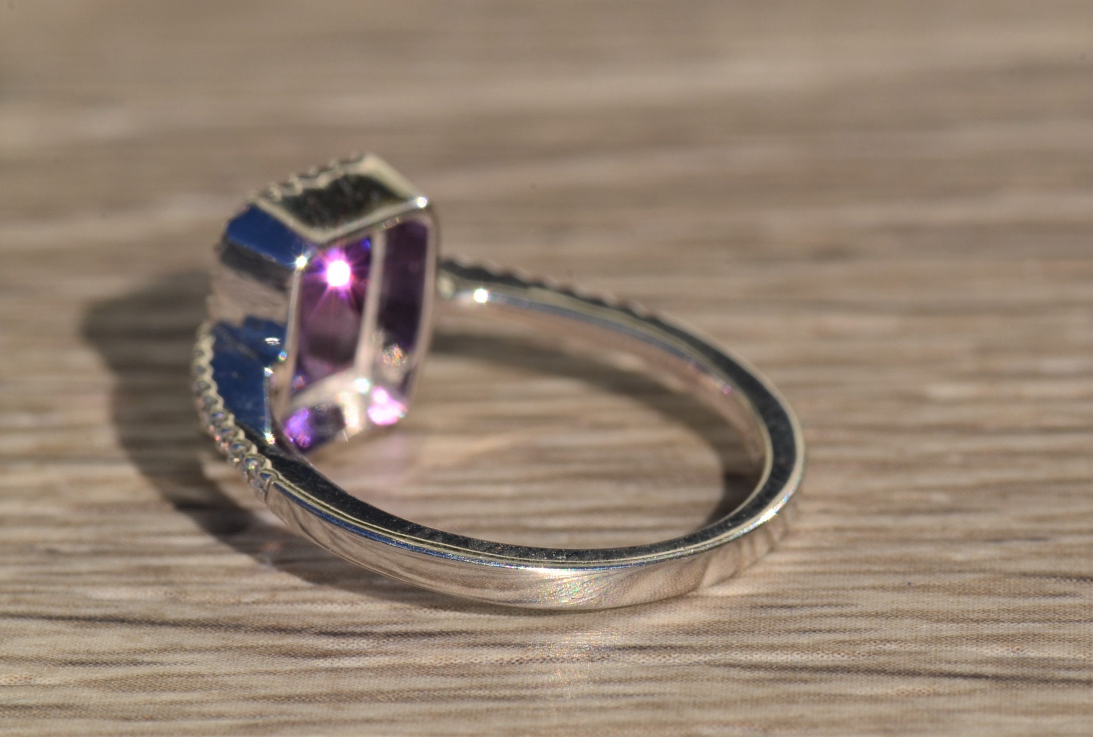 The Fuschia:  Ladies Emerald Cut Amethyst and Diamond Ring in White Gold - Image 7