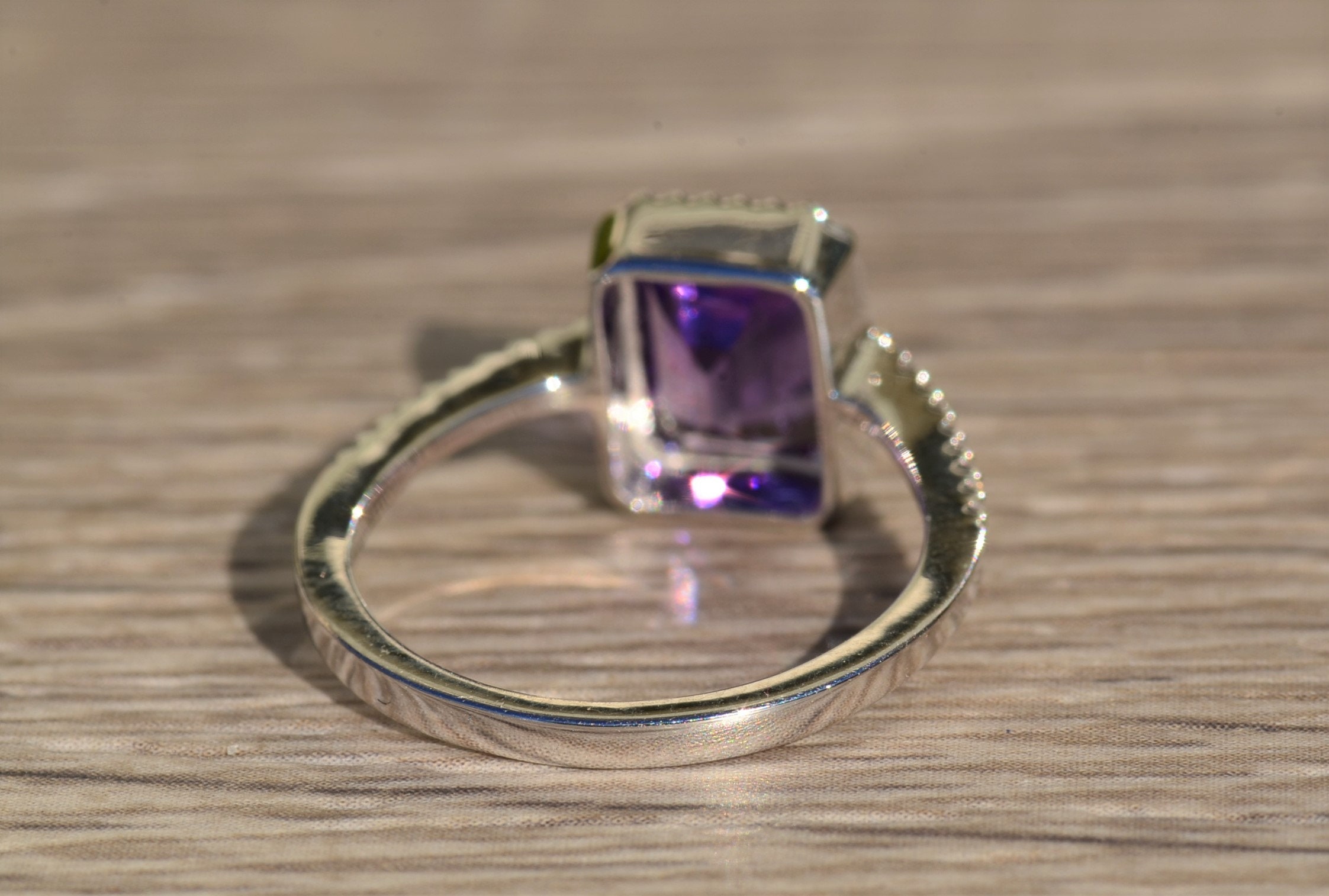 The Fuschia:  Ladies Emerald Cut Amethyst and Diamond Ring in White Gold - Image 9
