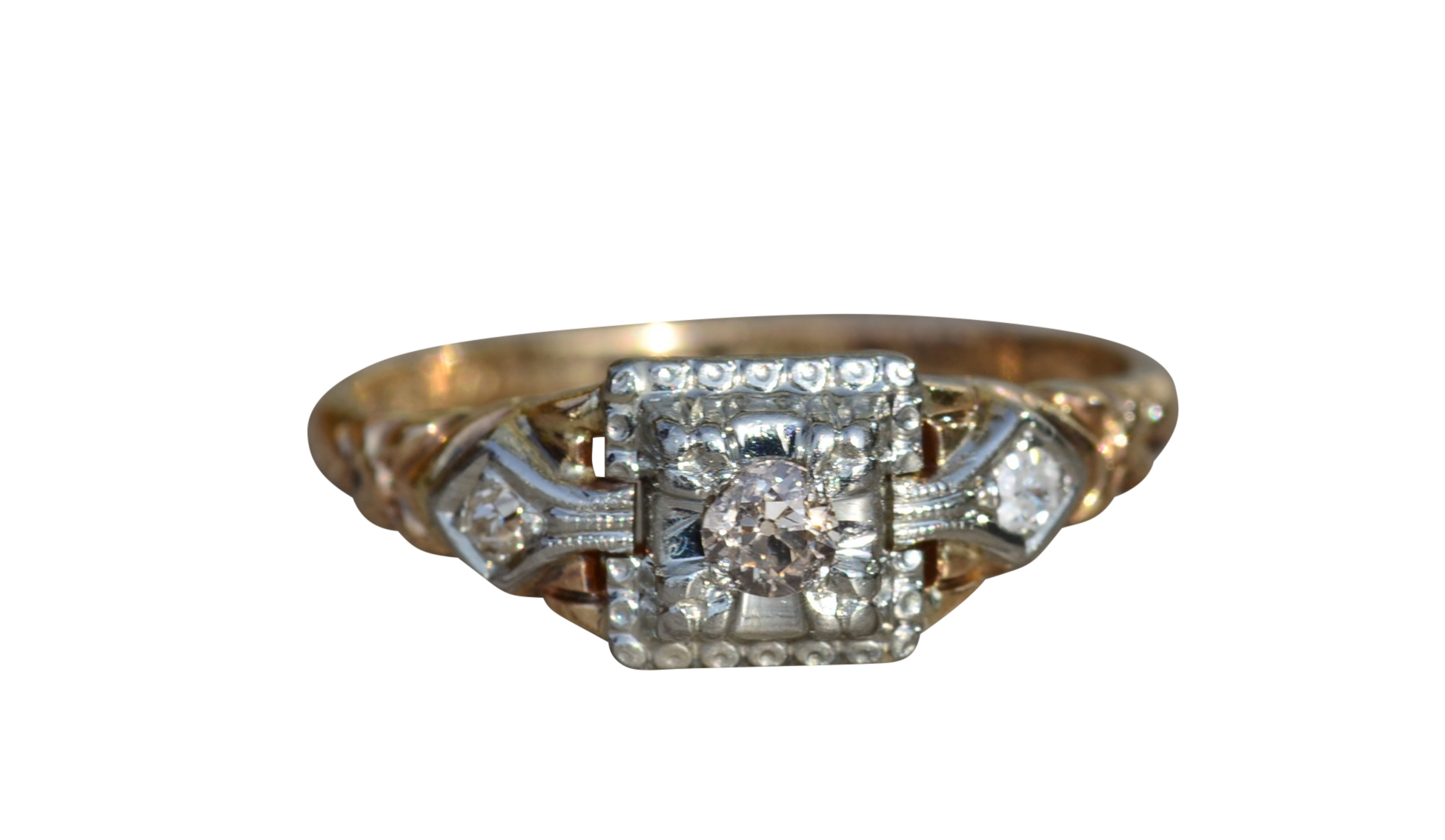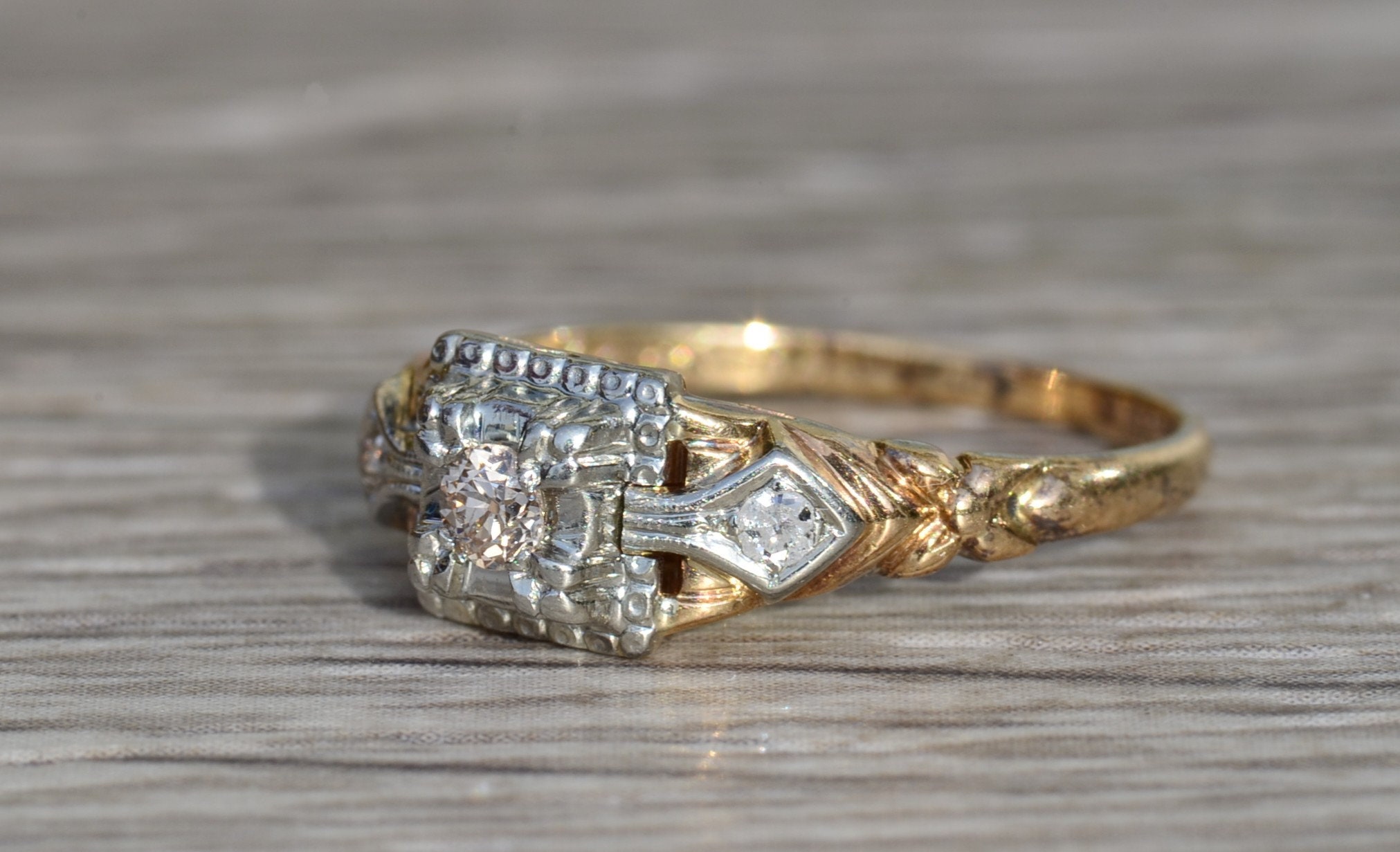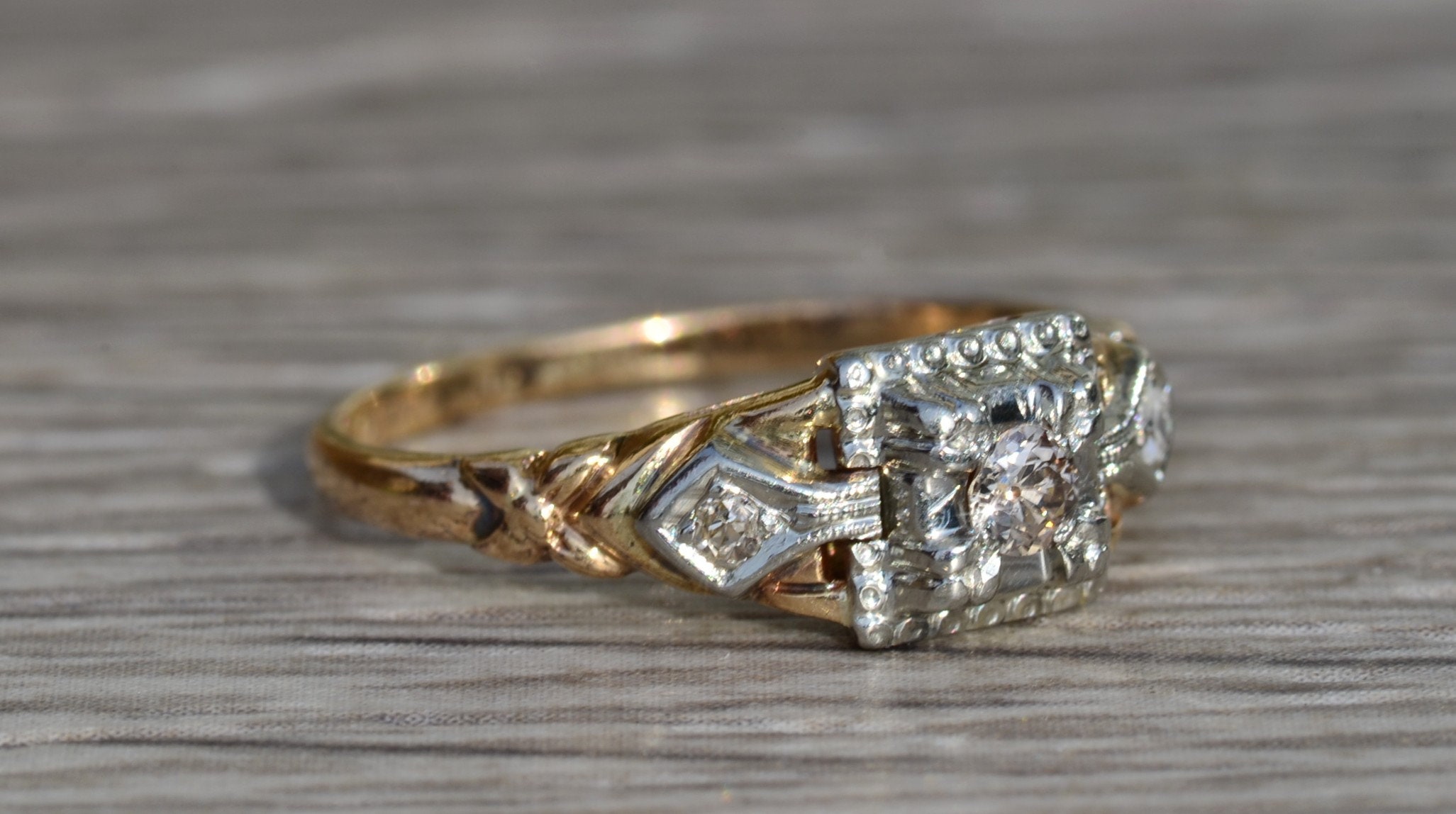Ladies Antique Signed Two Tone Gold Engagement Ring set with Diamonds. Hand fabricated in 14 and 18 karat gold, this engagement style ring features 0.14 carats of diamonds throughout. The ring is signed by the maker who we have not identified yet. The ring is currently a finger size 5.5 and is able to be resized for an additional charge.
