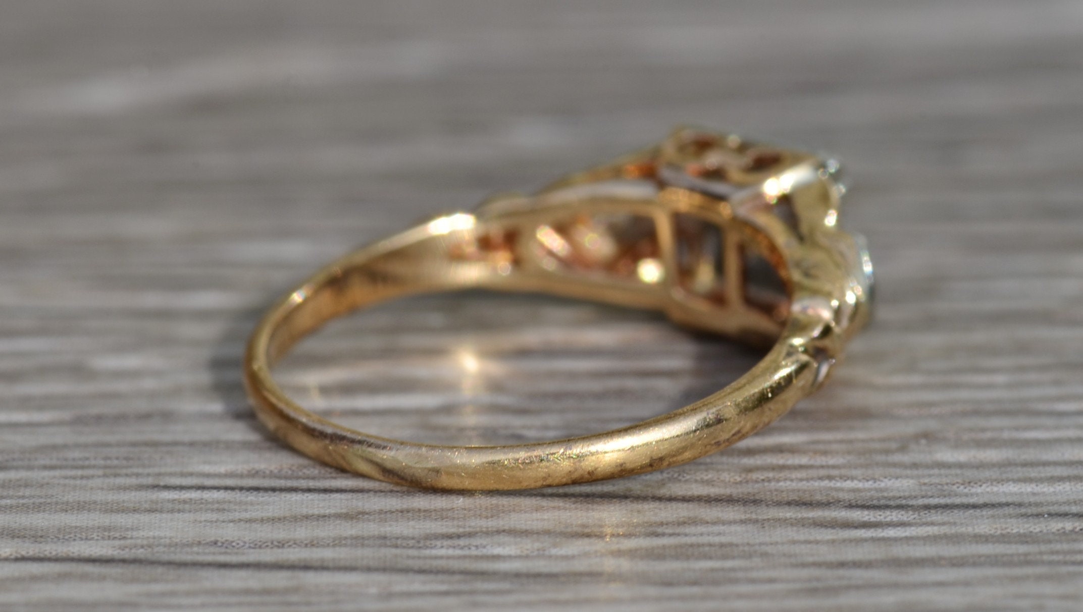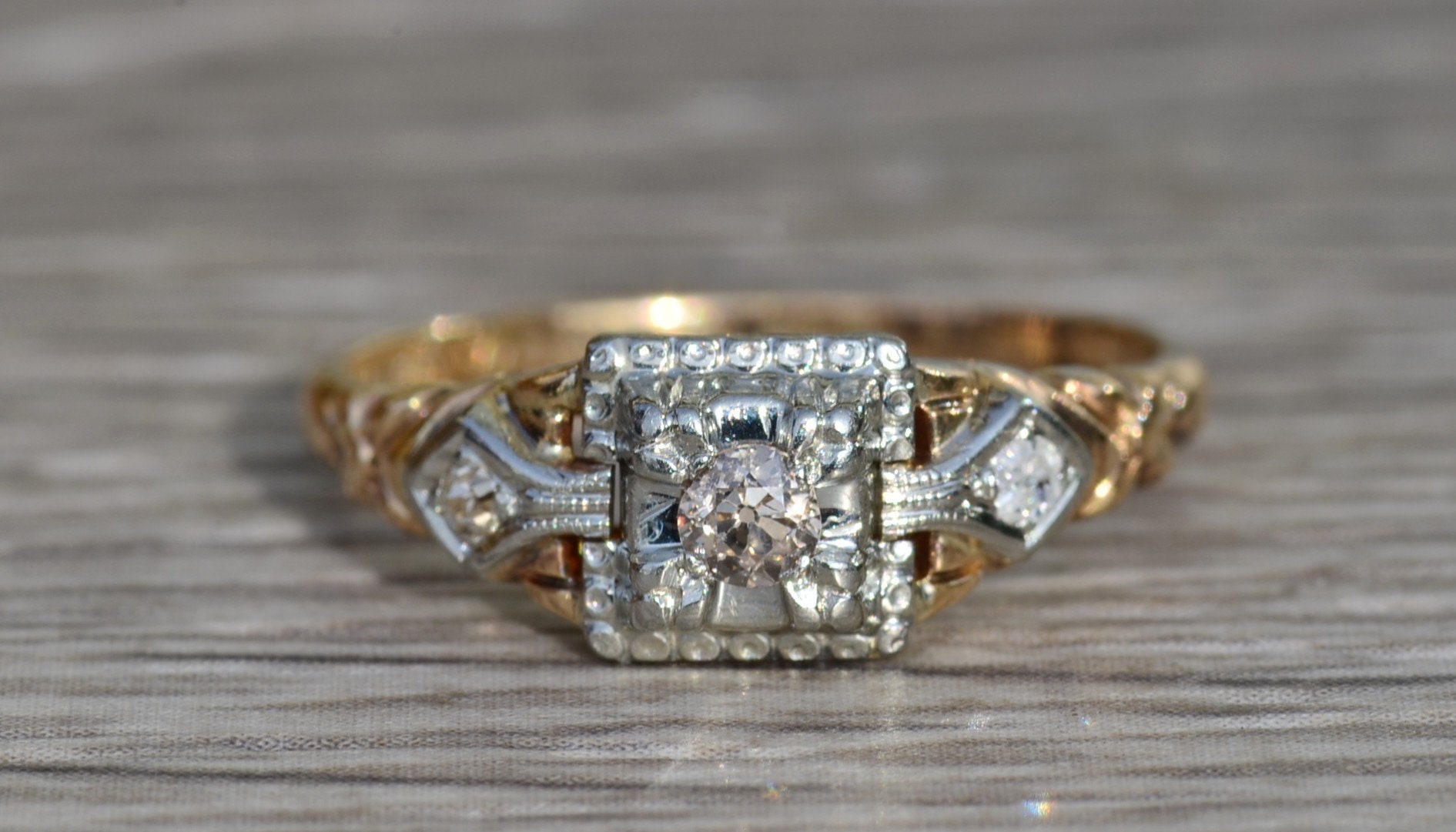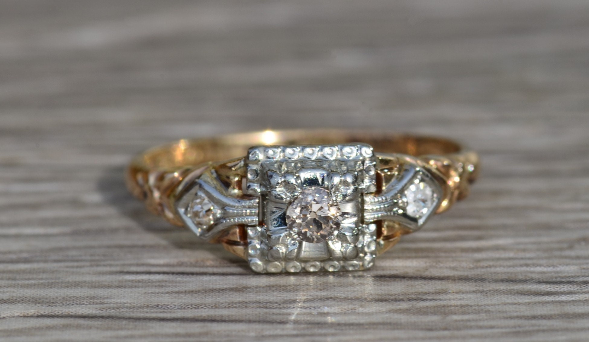 Ladies Antique Signed Two Tone Gold Engagement Ring set with Diamonds. Hand fabricated in 14 and 18 karat gold, this engagement style ring features 0.14 carats of diamonds throughout. The ring is signed by the maker who we have not identified yet. The ring is currently a finger size 5.5 and is able to be resized for an additional charge.