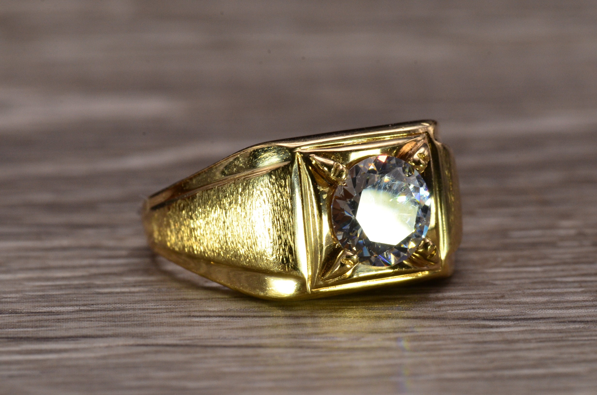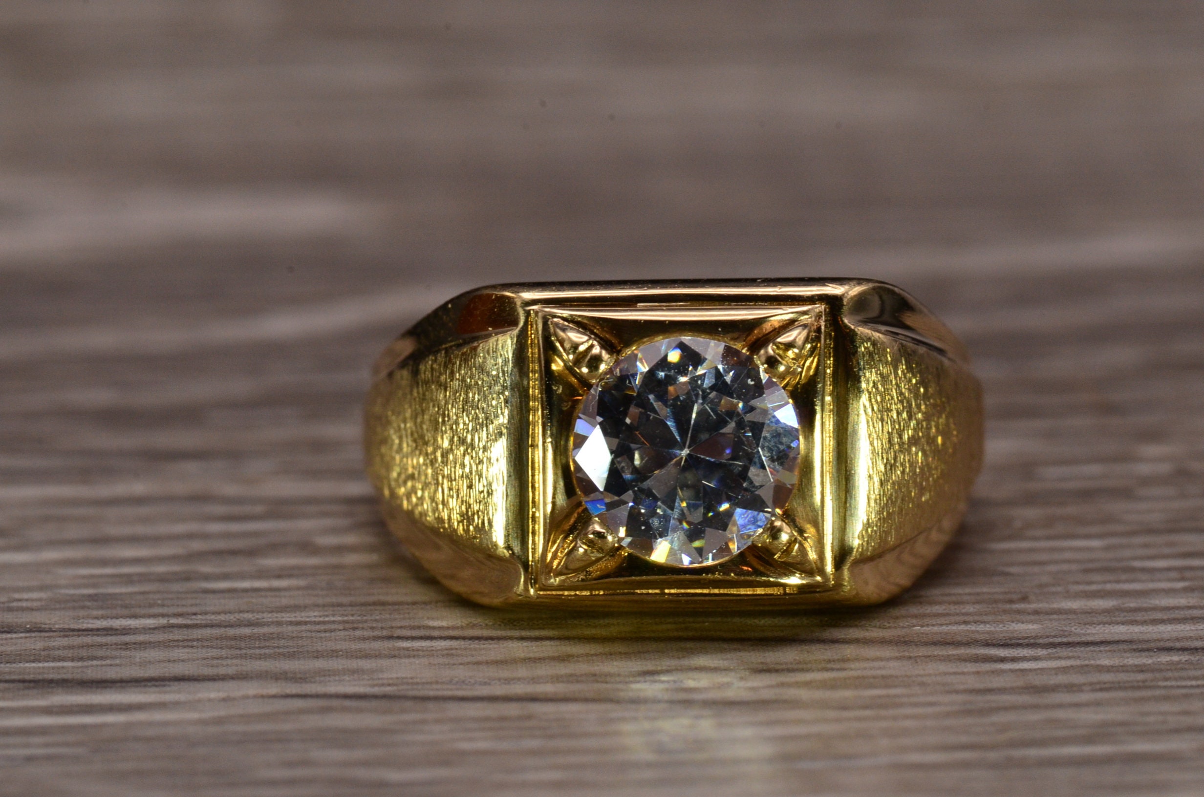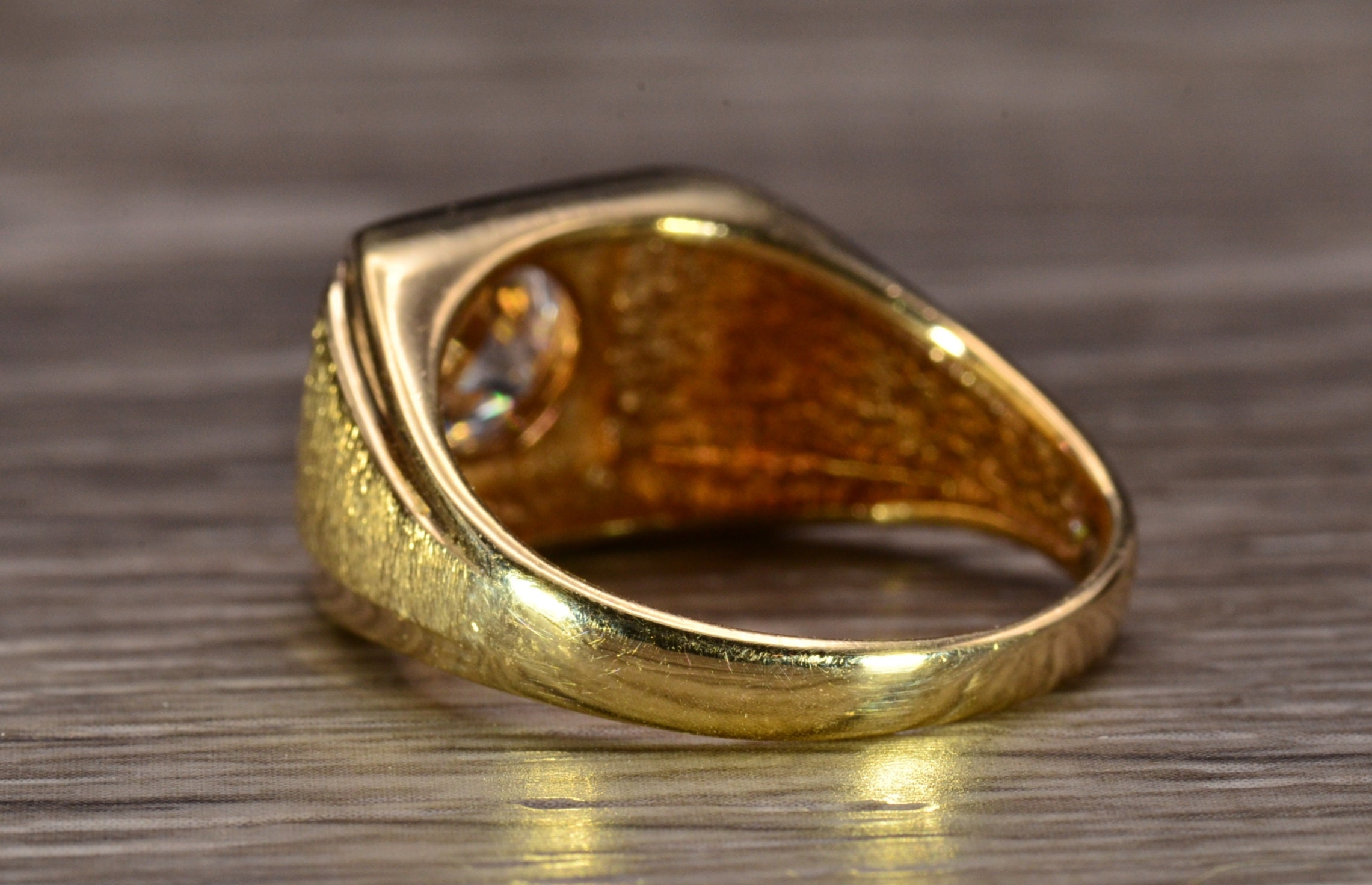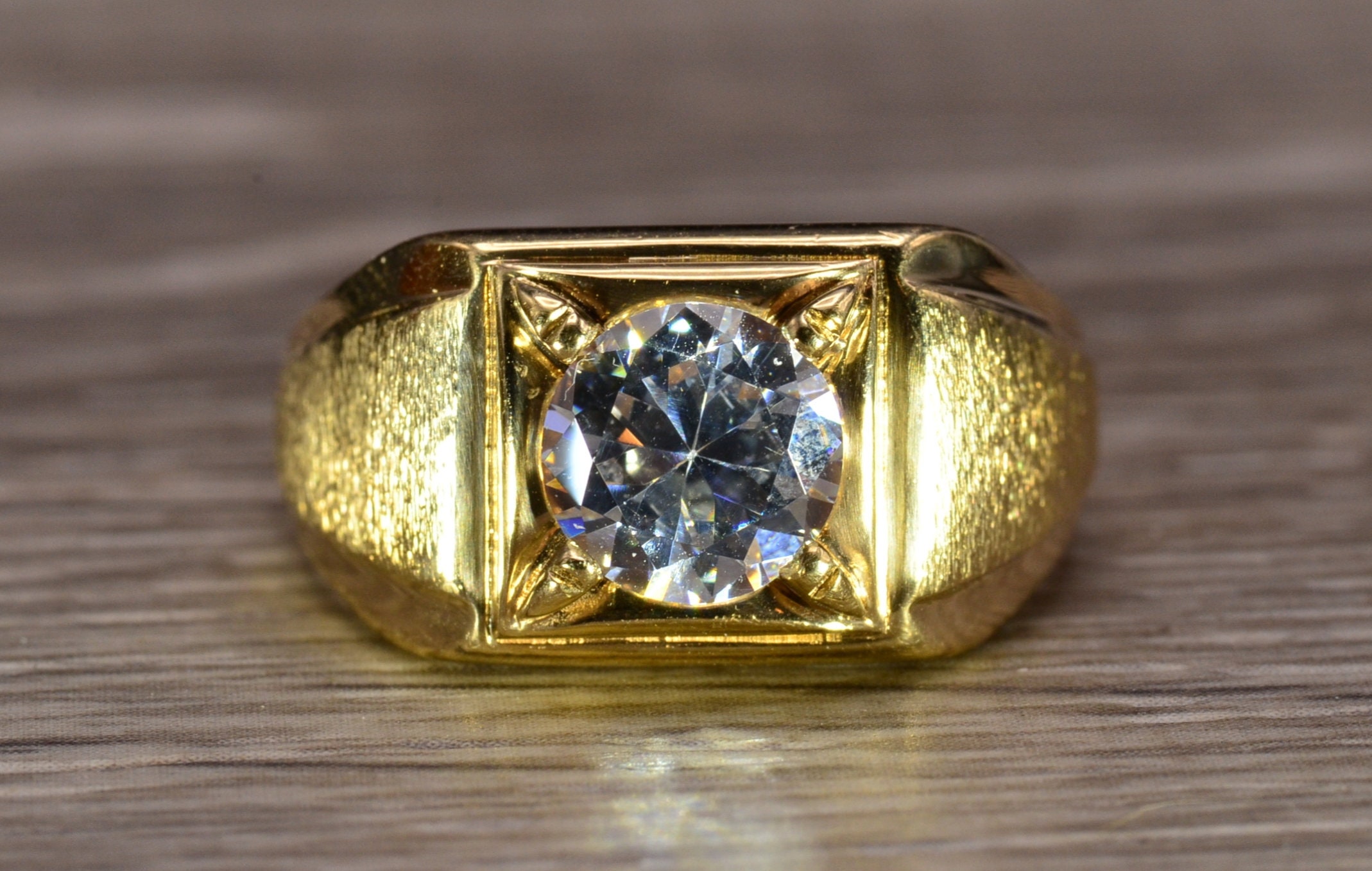The Galliana: Men’s Yellow Gold Cubic Zirconia Cocktail Ring. With both polished and brushed gold sections, this ring features an 8.4mm round cubic zirconia. Currently a finger size 9.5, this ring can be resized for an additional charge.