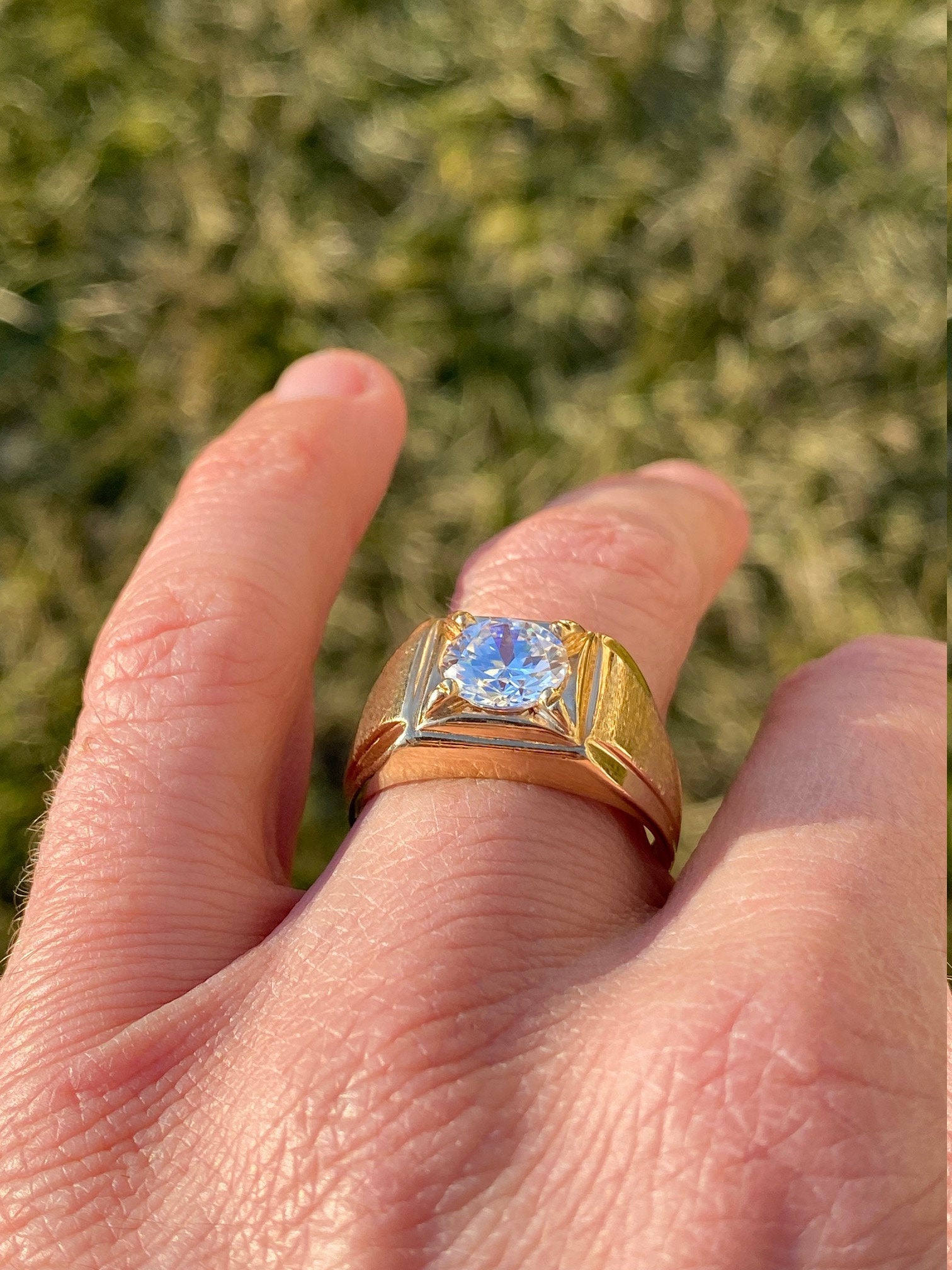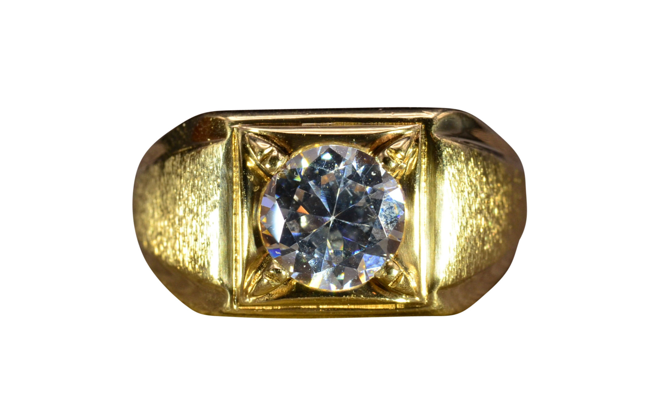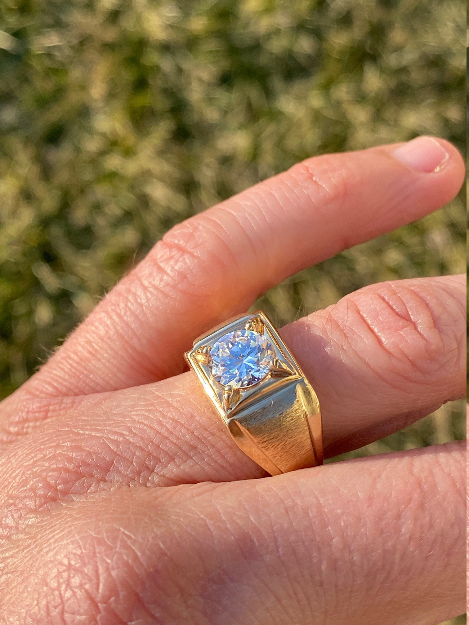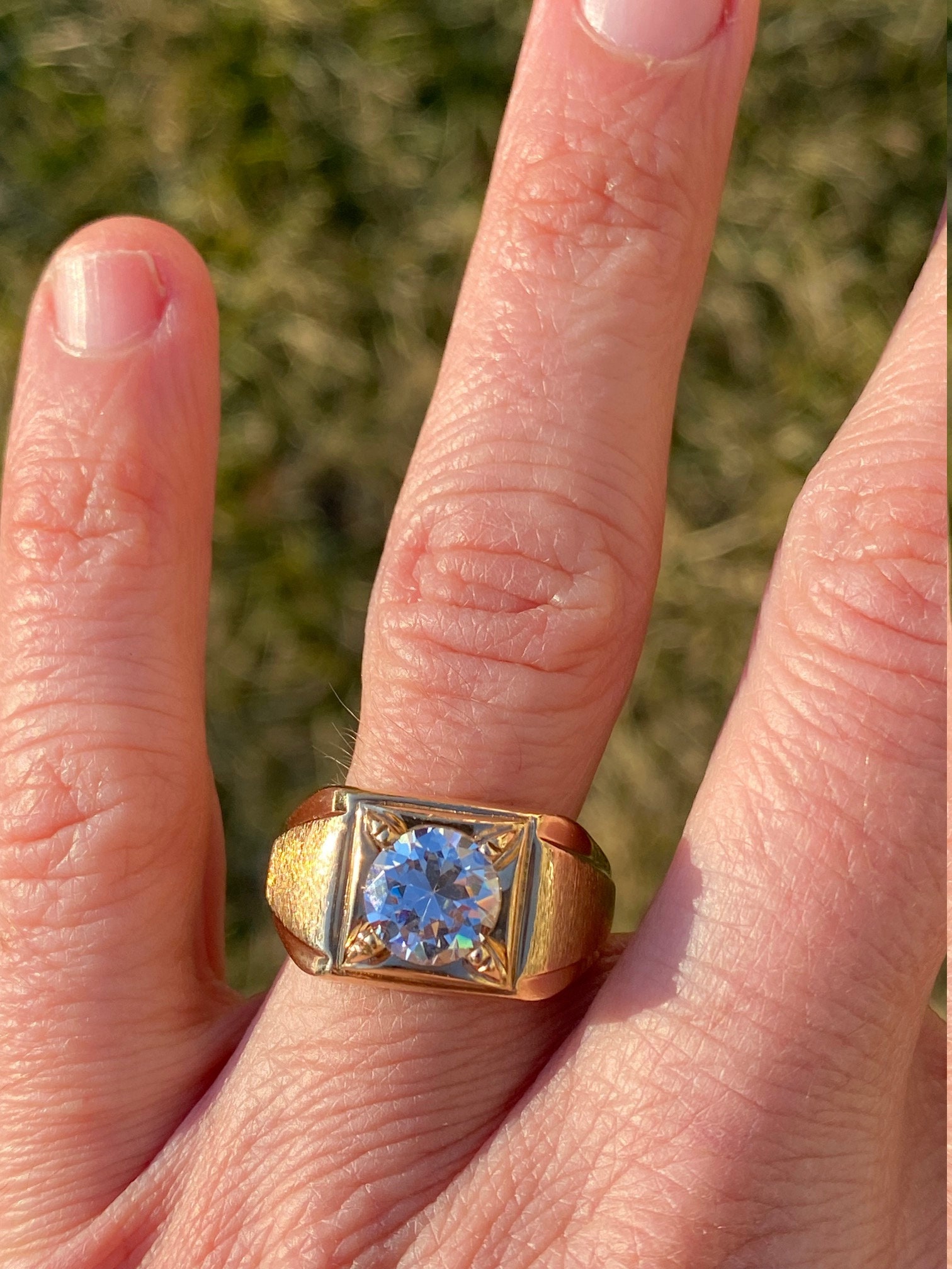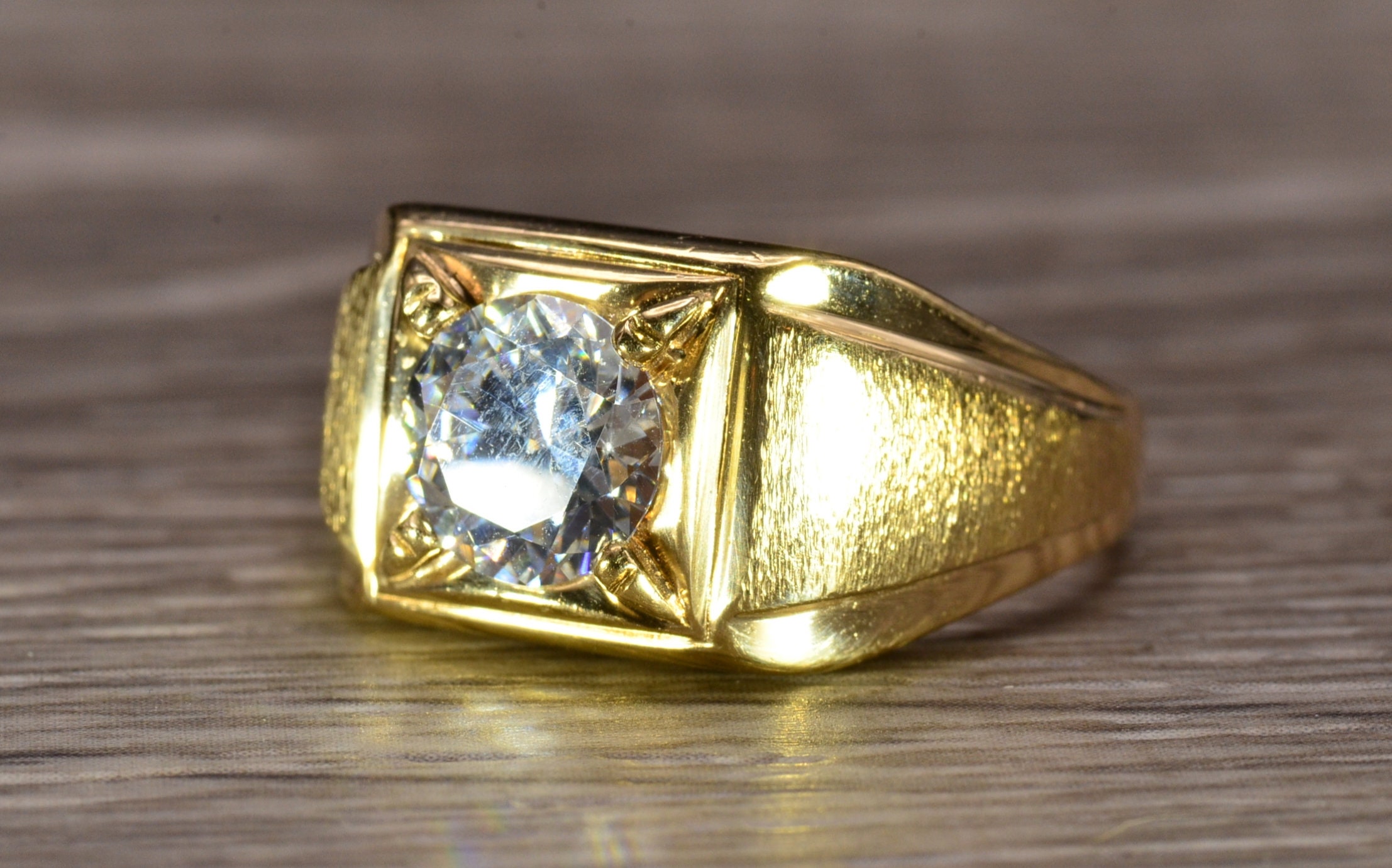 The Galliana: Men’s Yellow Gold Cubic Zirconia Cocktail Ring. With both polished and brushed gold sections, this ring features an 8.4mm round cubic zirconia. Currently a finger size 9.5, this ring can be resized for an additional charge.