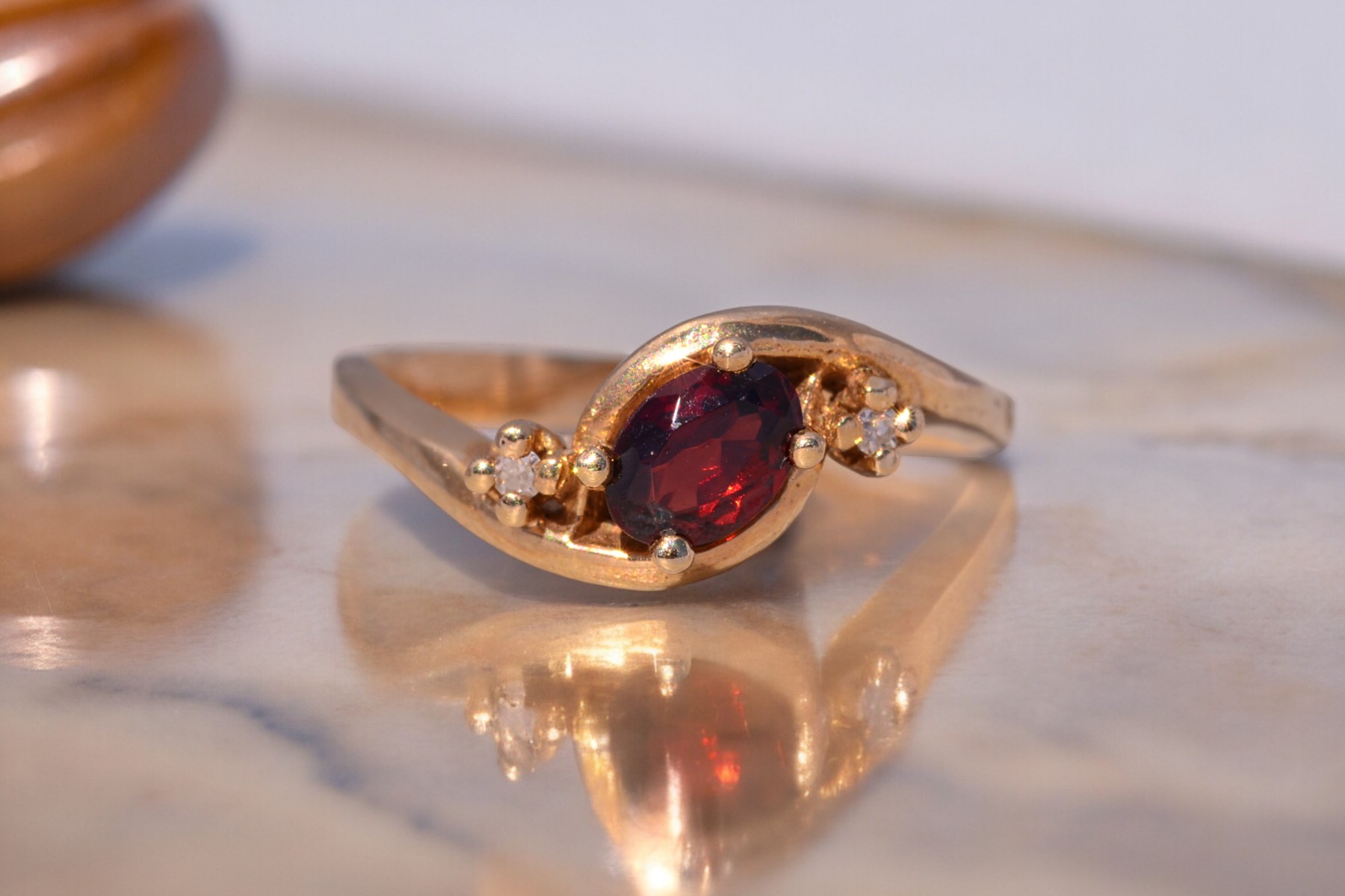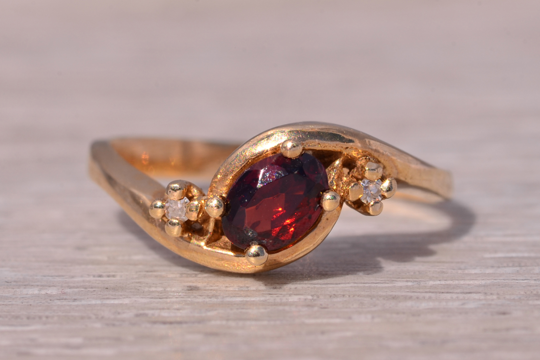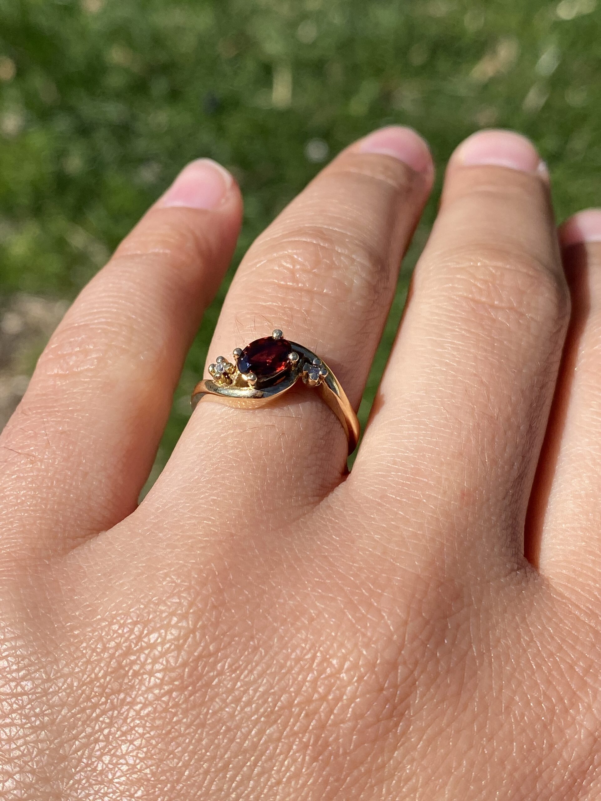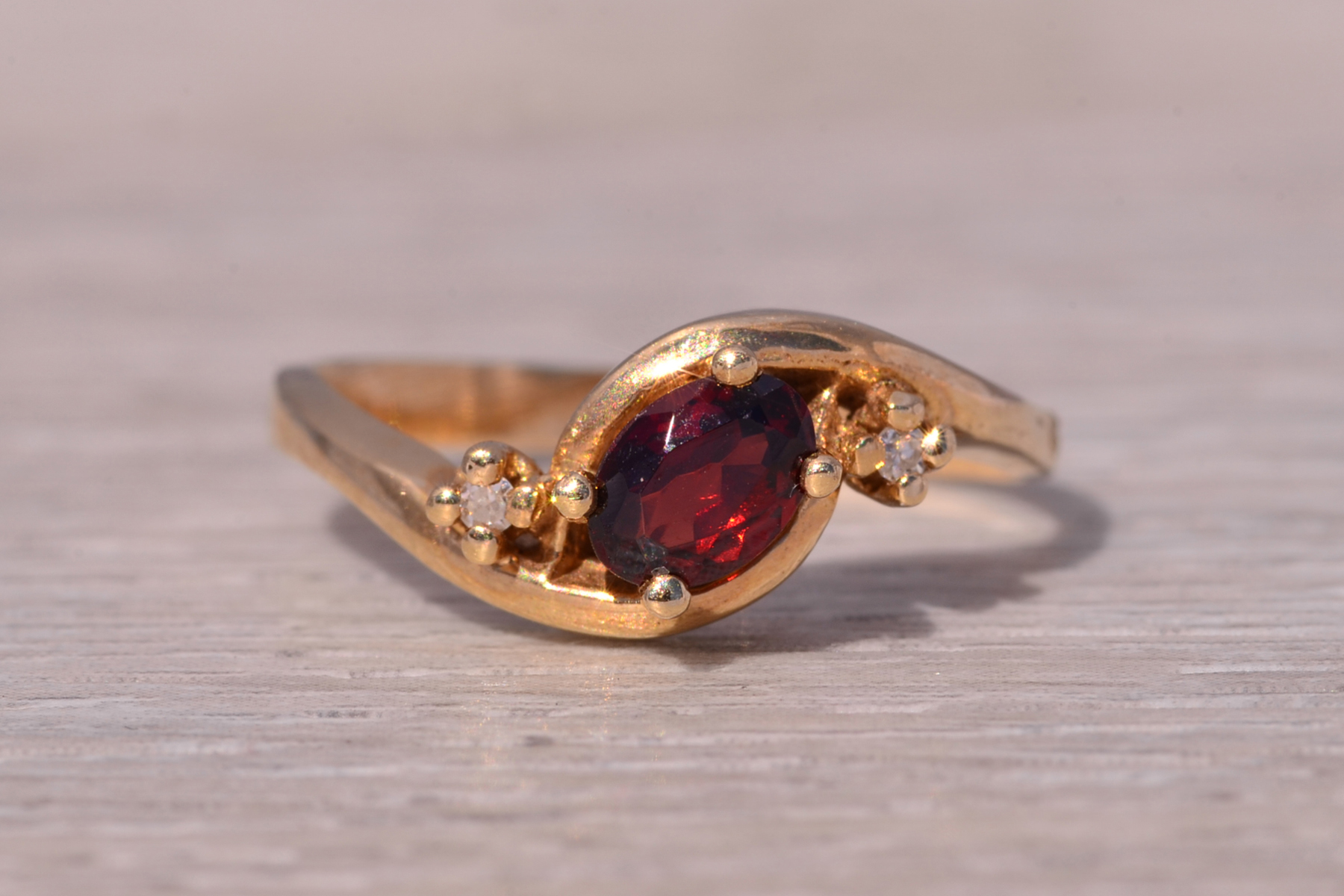 This stunning piece, known as The Garnet Whisper, features a captivating oval cut natural garnet at its center. The garnet is elegantly flanked by two round brilliant cut natural diamonds, adding a touch of sparkle and sophistication. The ring is crafted in 14 karat yellow gold and is currently a finger size 6.5 yet can be adjusted to any finger size for an additional charge upon request, ensuring a perfect fit. The ring bears a designer hallmark, yet we have not quite identified the maker yet.
