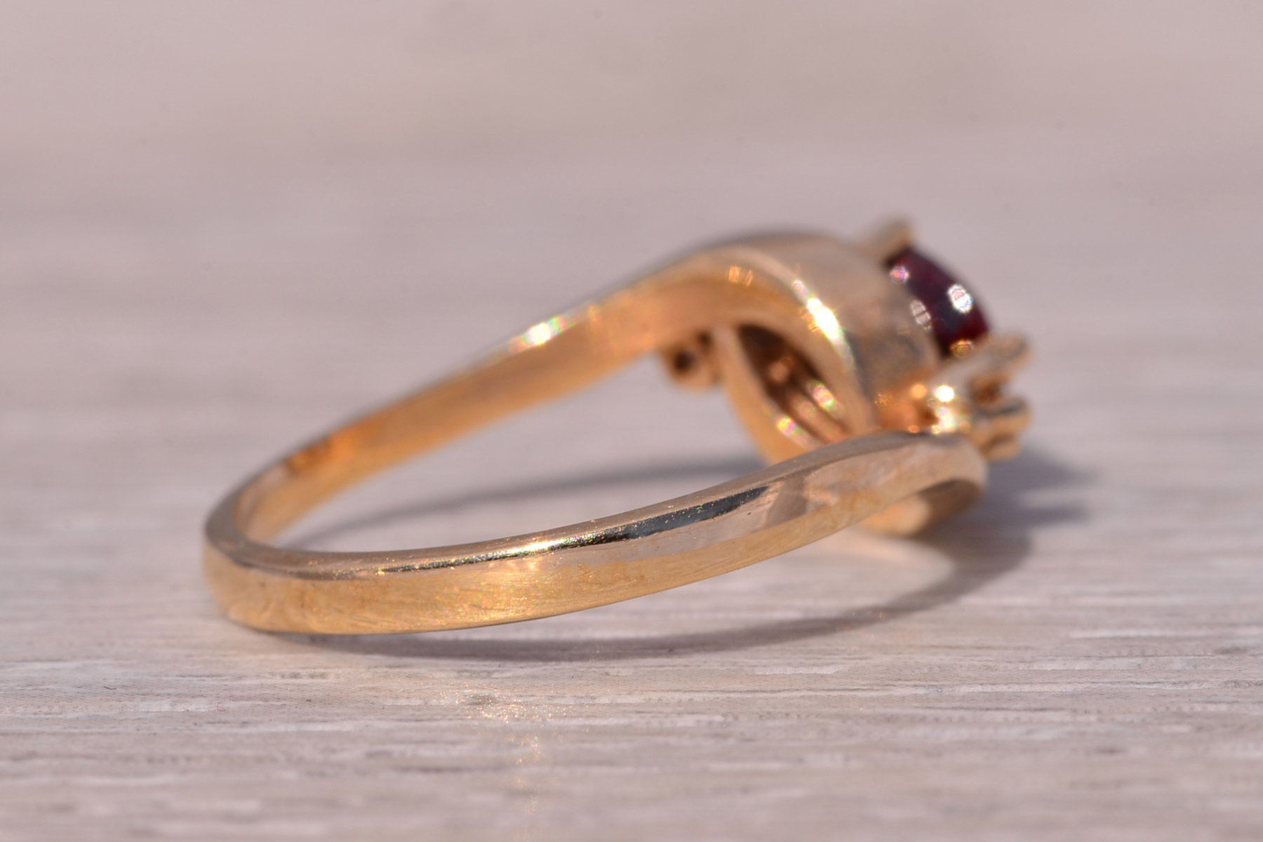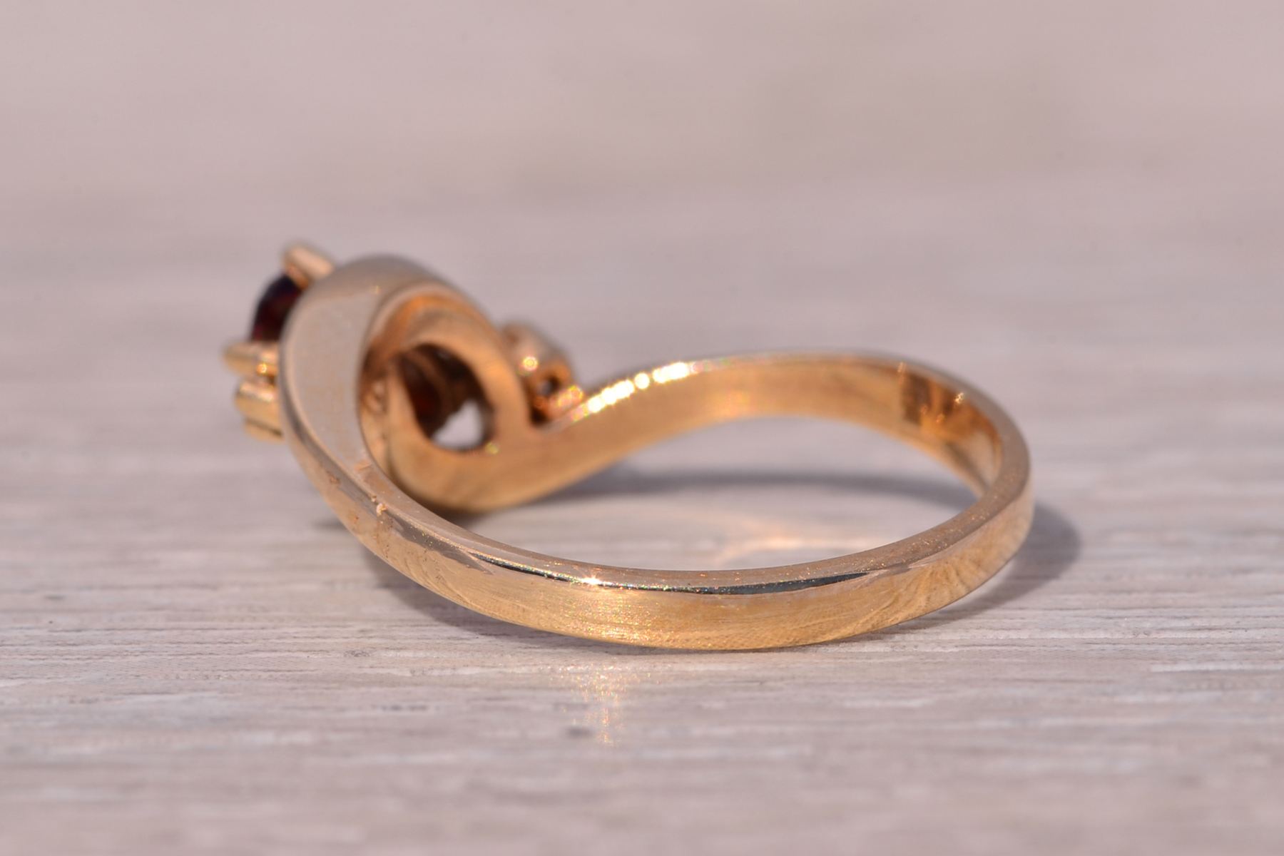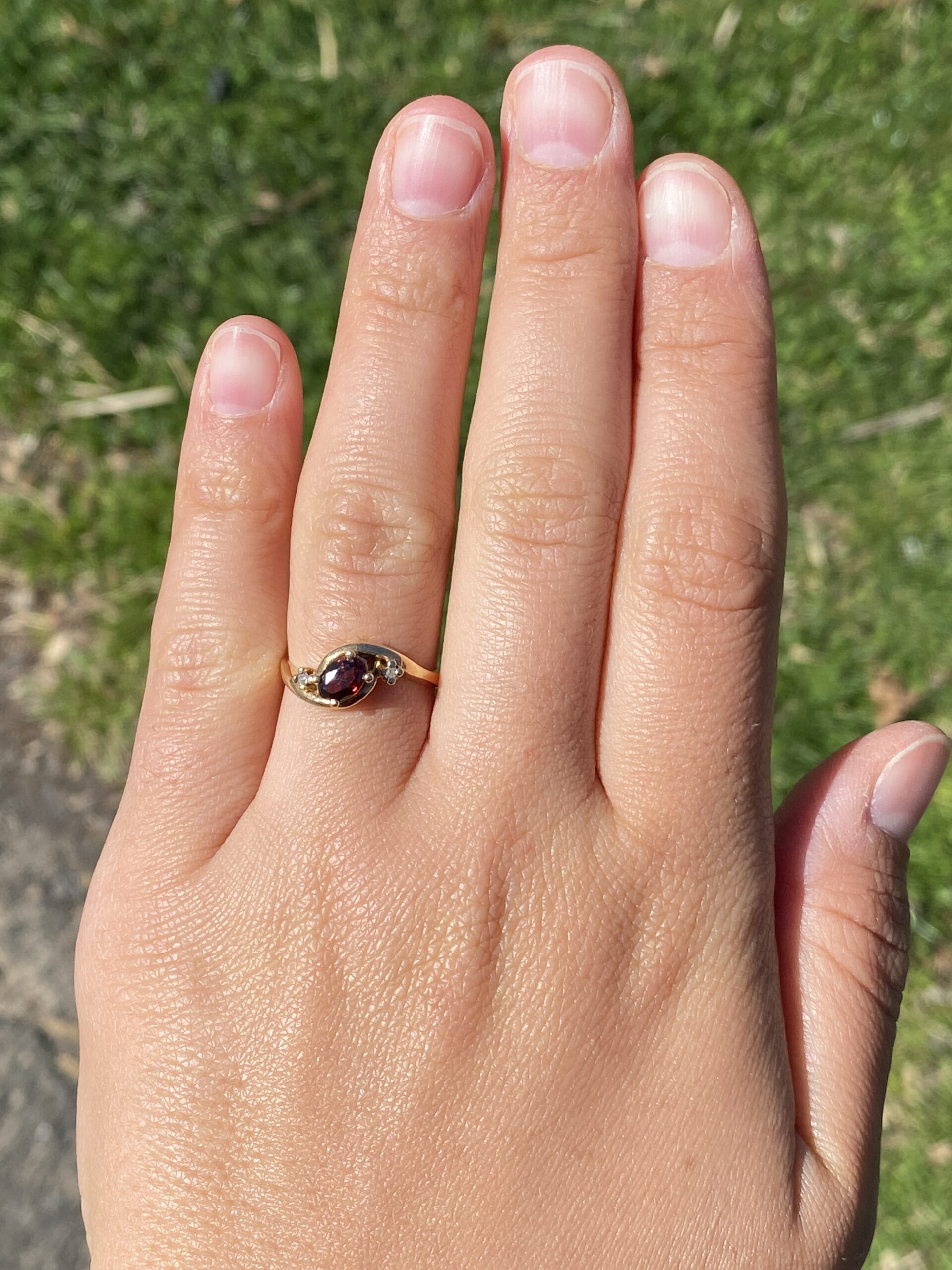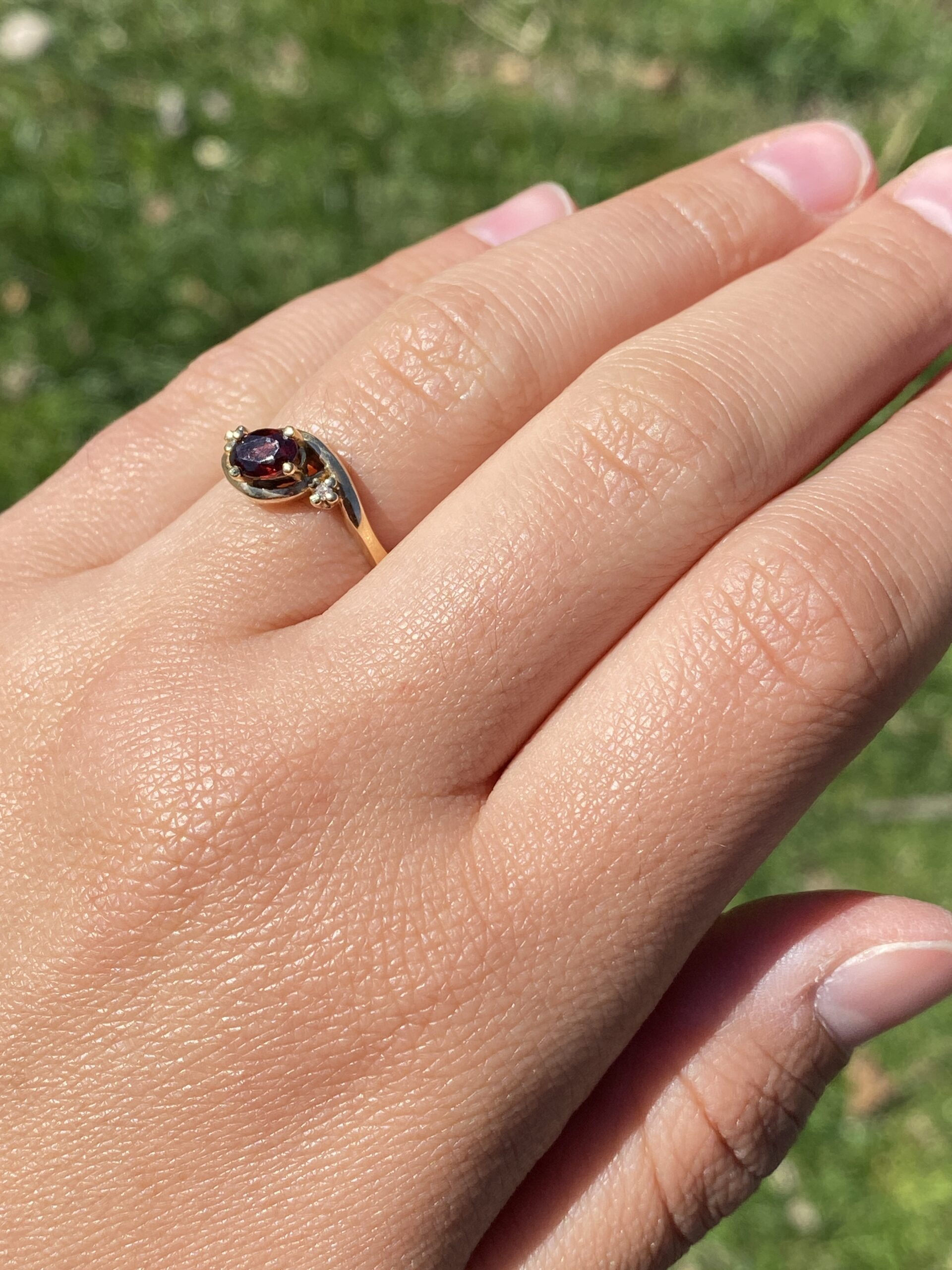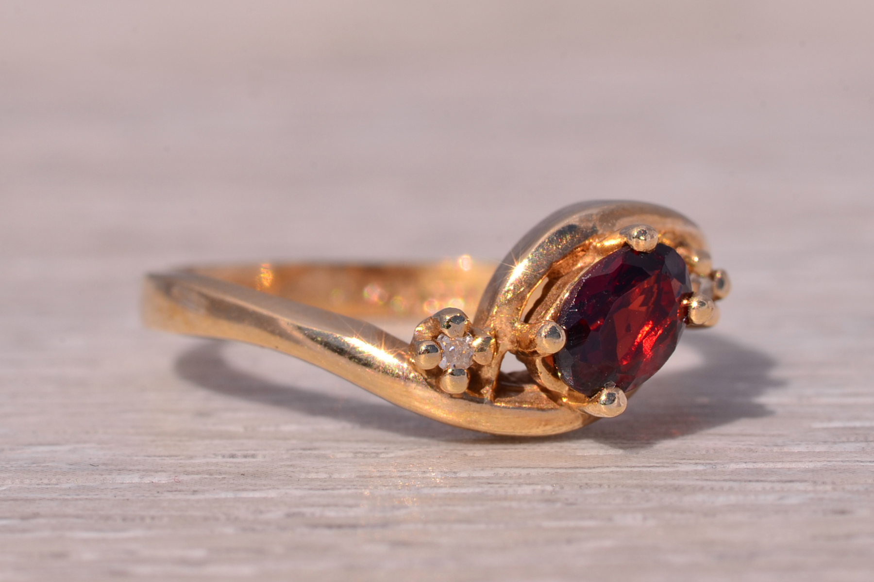 This stunning piece, known as The Garnet Whisper, features a captivating oval cut natural garnet at its center. The garnet is elegantly flanked by two round brilliant cut natural diamonds, adding a touch of sparkle and sophistication. The ring is crafted in 14 karat yellow gold and is currently a finger size 6.5 yet can be adjusted to any finger size for an additional charge upon request, ensuring a perfect fit. The ring bears a designer hallmark, yet we have not quite identified the maker yet.