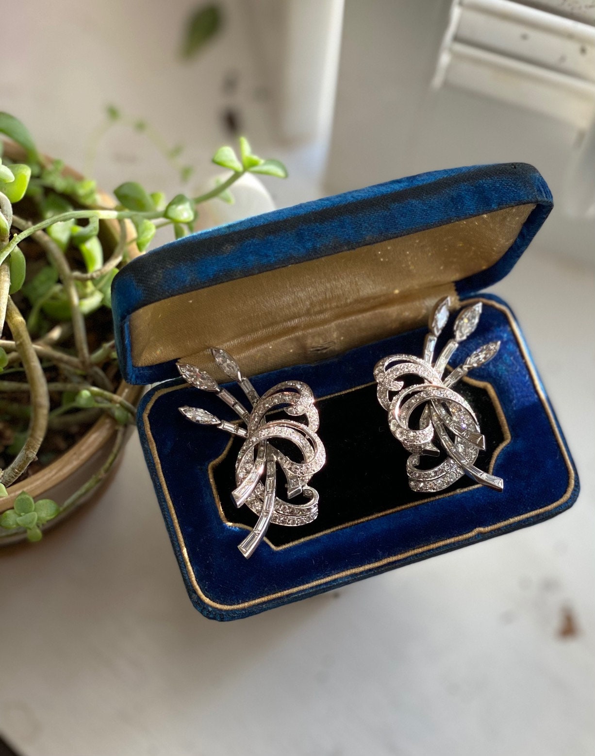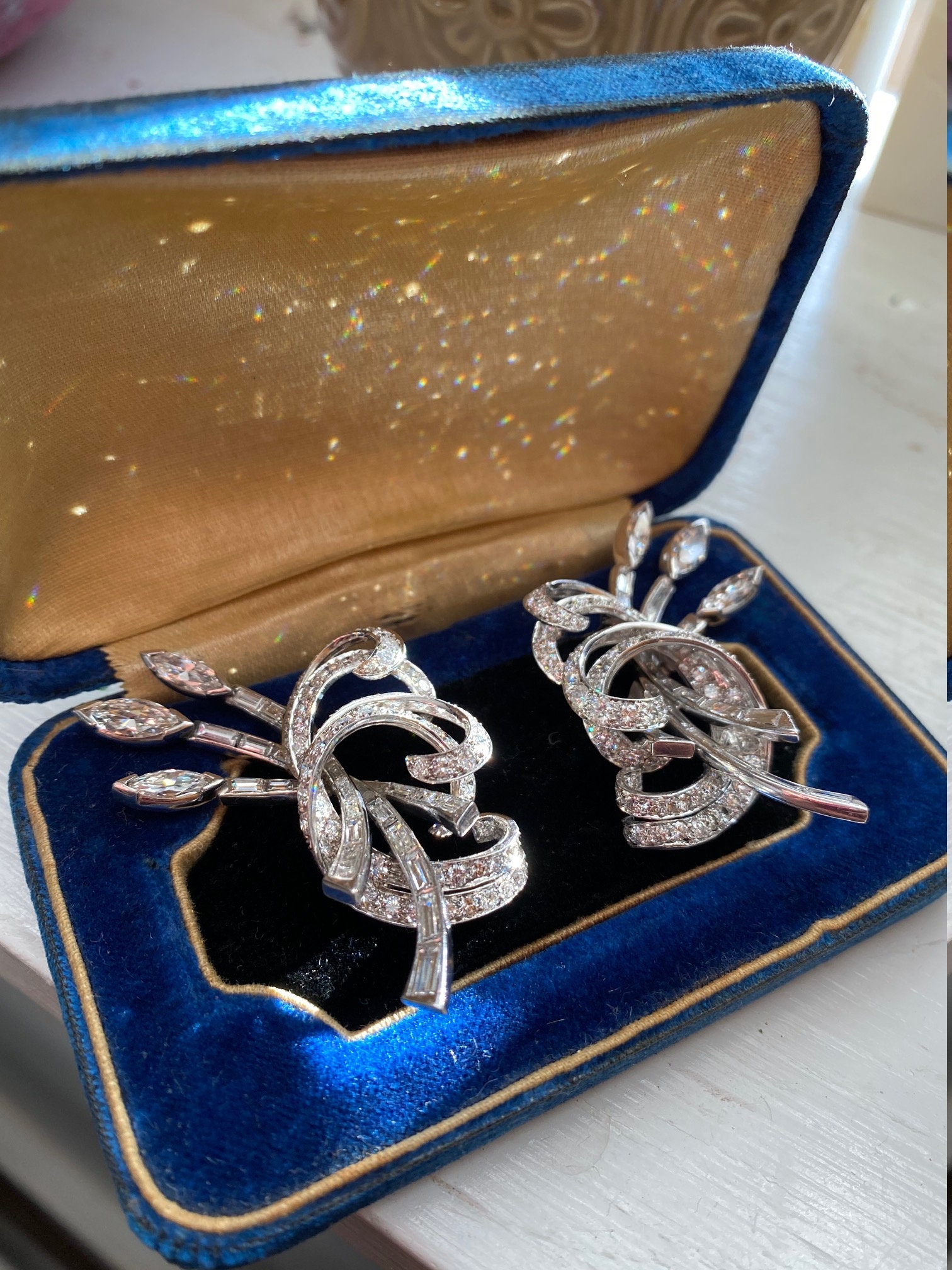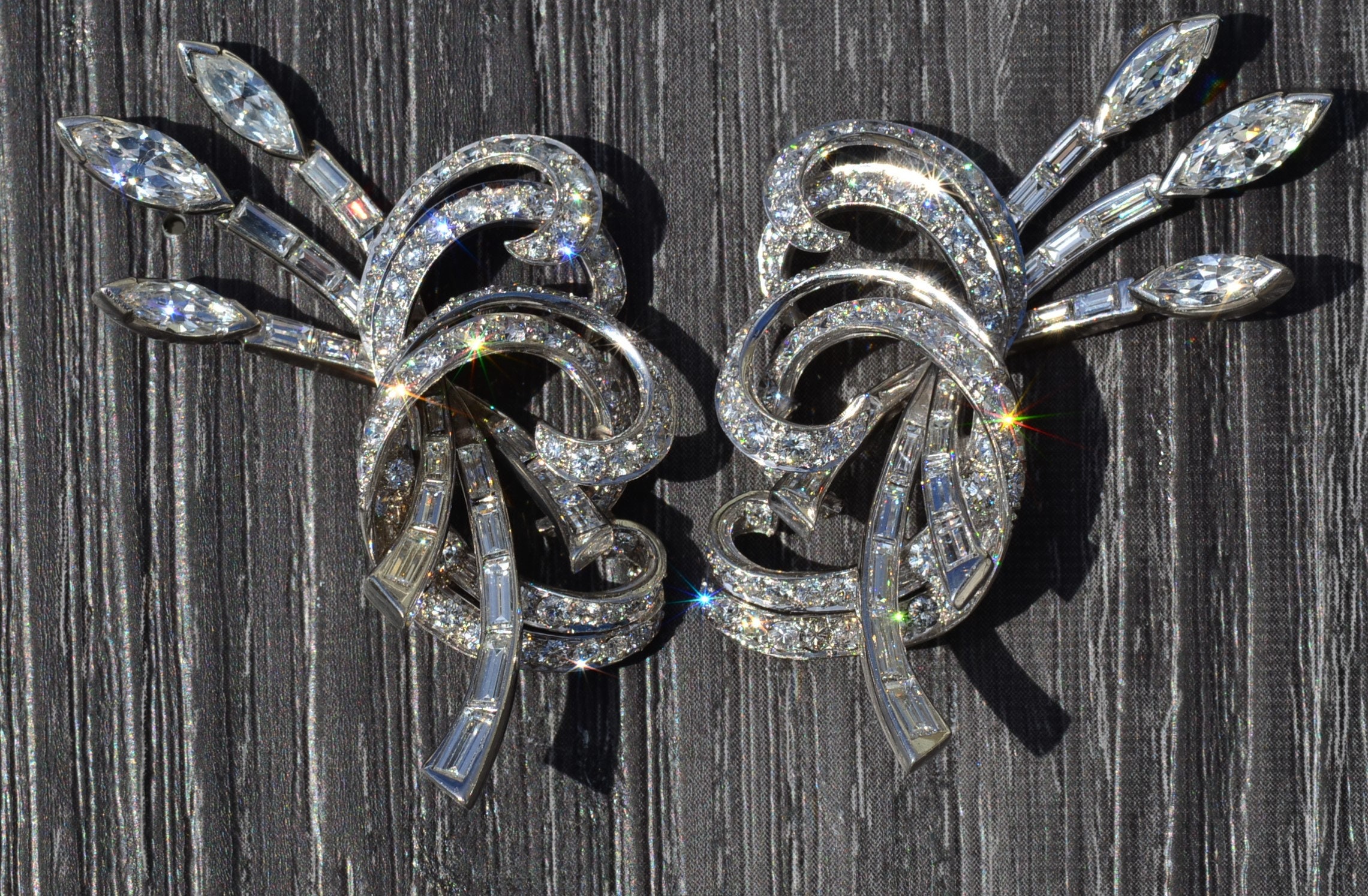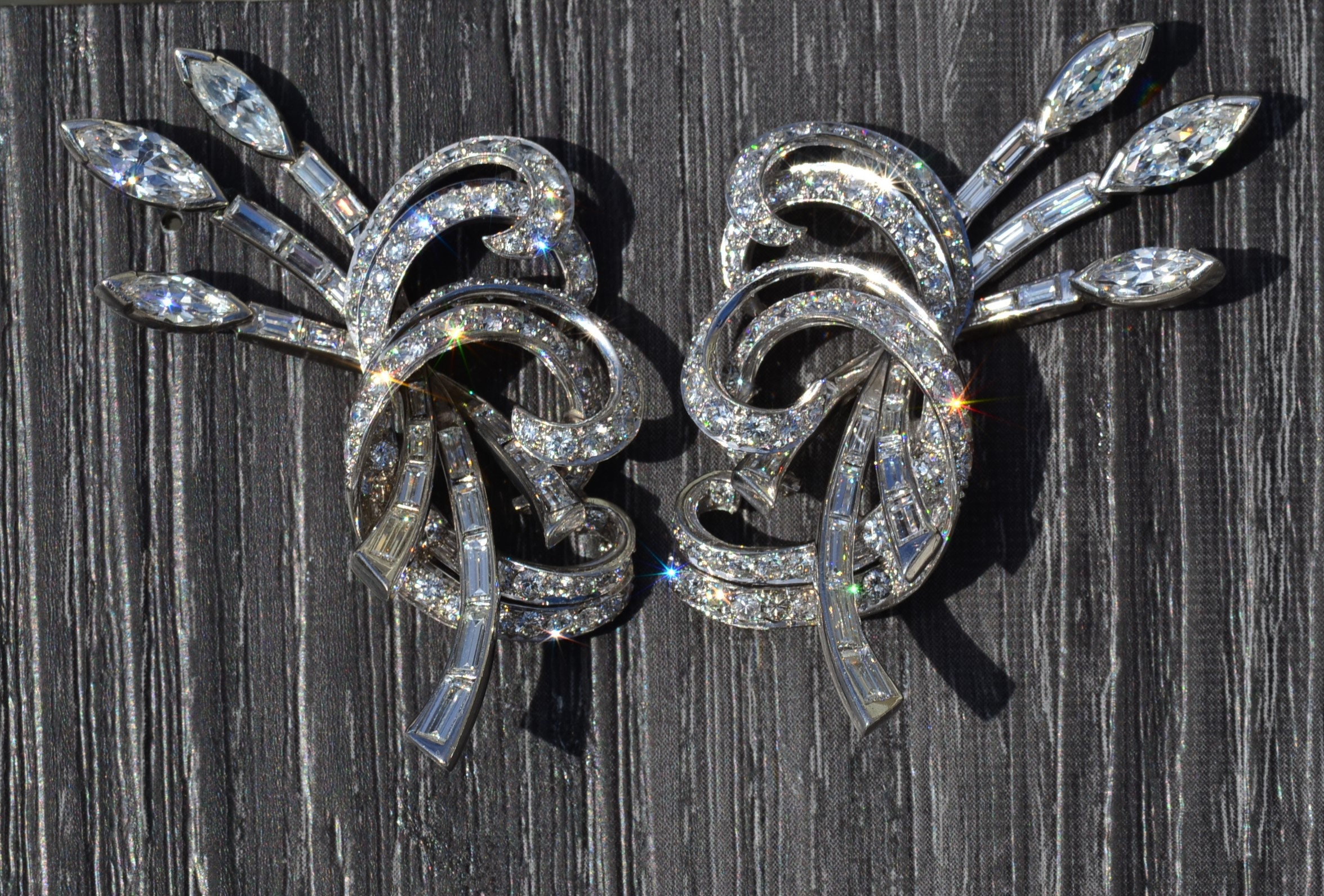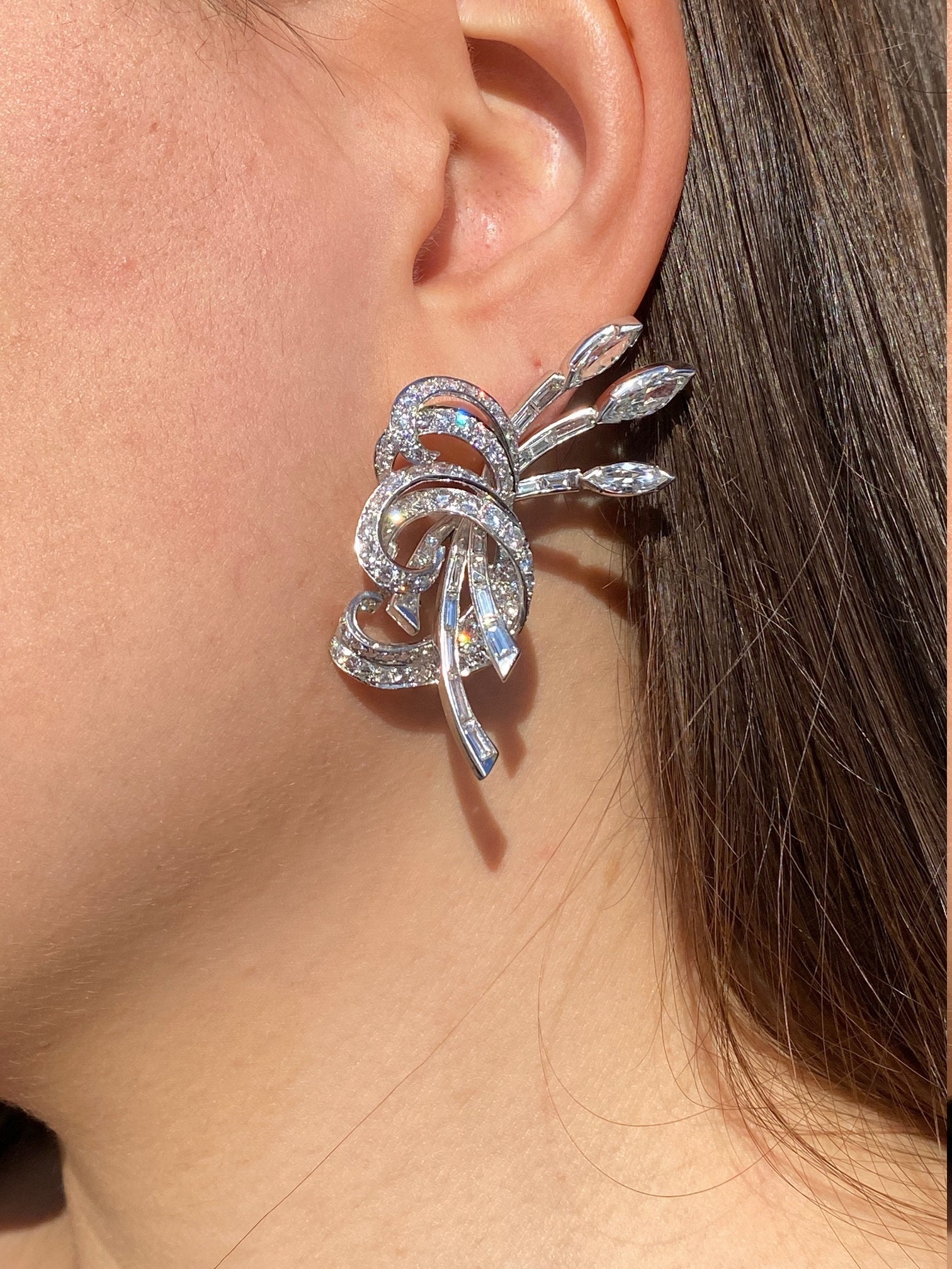 Post War Hollywood Glam Platinum & Diamond Earrings. Artfully crafted in durable platinum, these earrings are set with round, marquise cut and baguette cut diamonds with an approximate total weight of 16 carats. The diamonds have an approximate Gemological Institute of America clarity grade of Vvs2 to Vs1 and a color grade of F. Allow these earrings to shimmer in the sunlight or dance the night away on the red carpet.