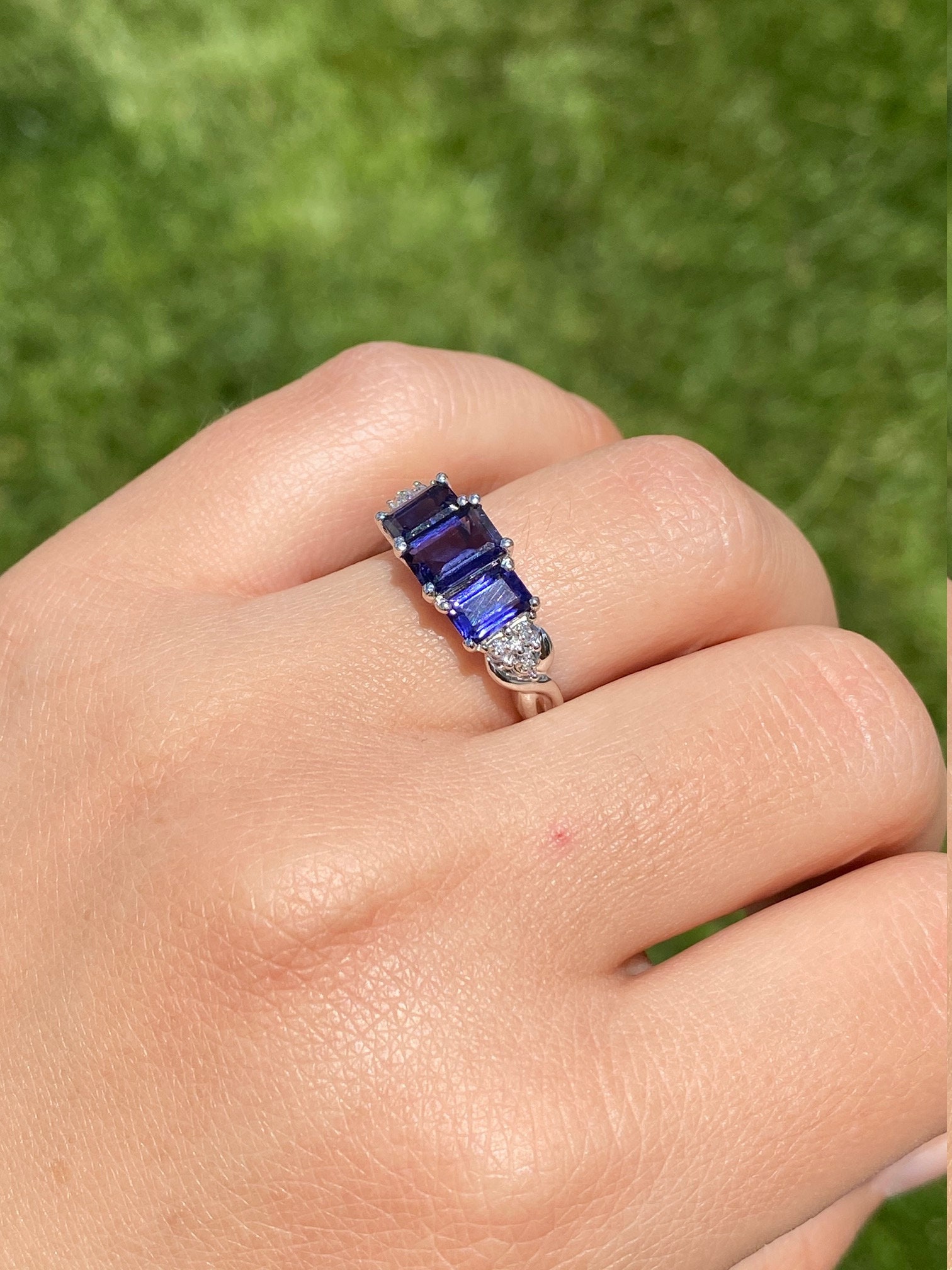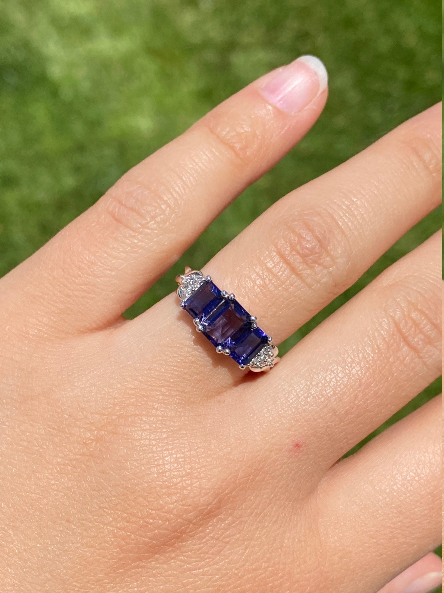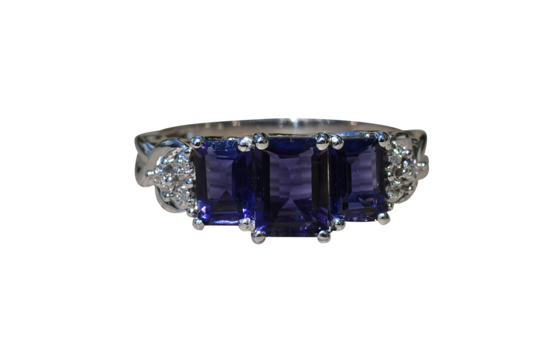 Ladies Contemporary Triology Ring in White Gold set with Iolite and Diamonds. Crafted in white gold, this three stone ring features three emerald cut Iolite stones across the center with accent side diamonds. The ring has a total carat weight of 1.60 carats Iolite. Currently, this ring is a finger size 7.25 and is able to be sized for an additional charge.