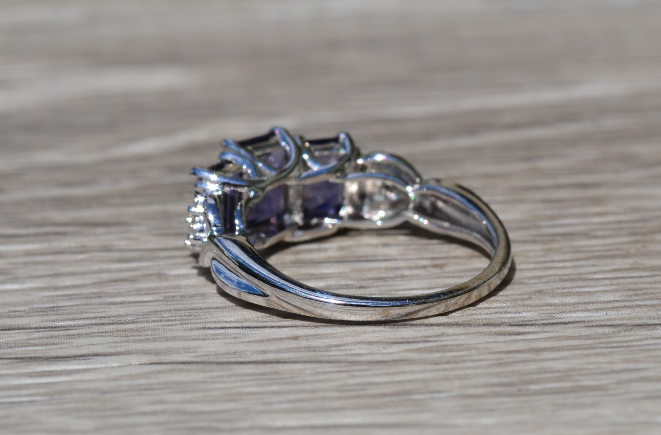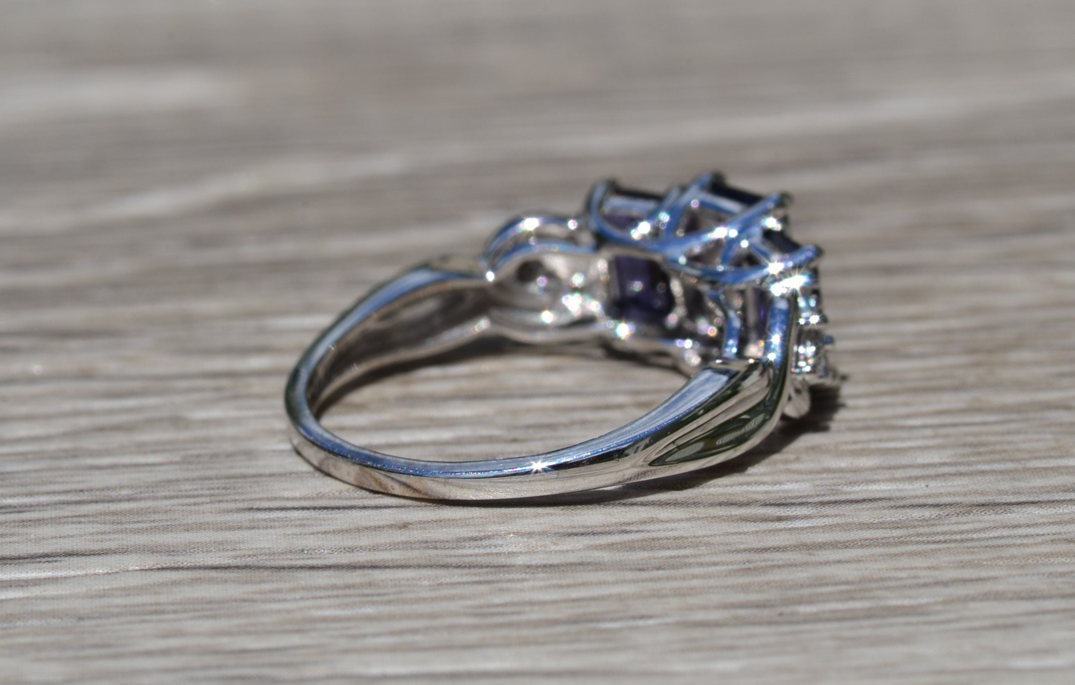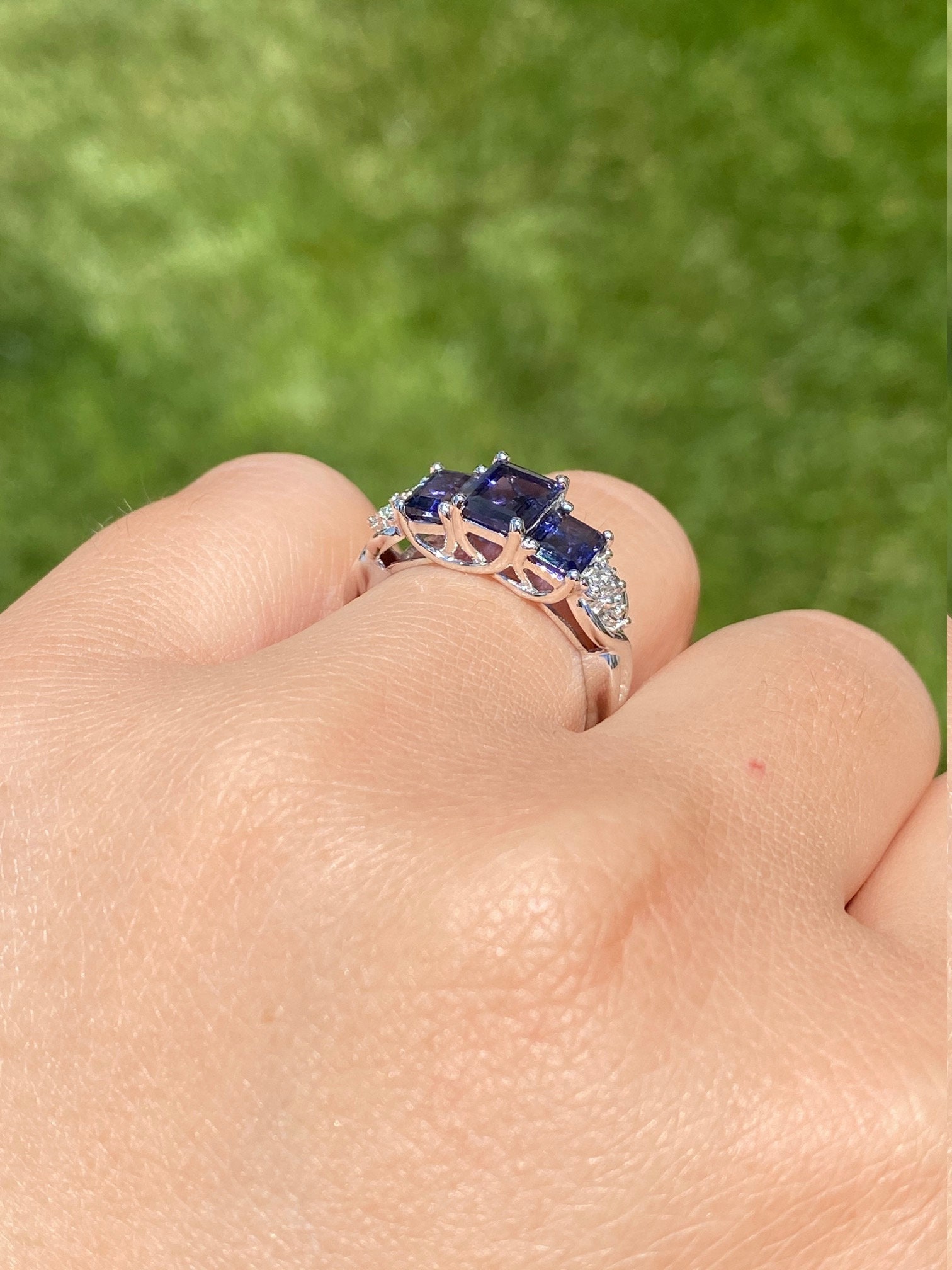 Ladies Contemporary Triology Ring in White Gold set with Iolite and Diamonds. Crafted in white gold, this three stone ring features three emerald cut Iolite stones across the center with accent side diamonds. The ring has a total carat weight of 1.60 carats Iolite. Currently, this ring is a finger size 7.25 and is able to be sized for an additional charge.