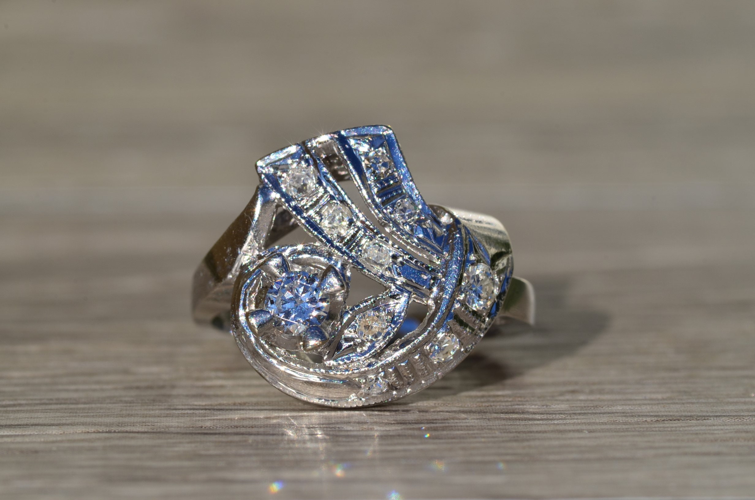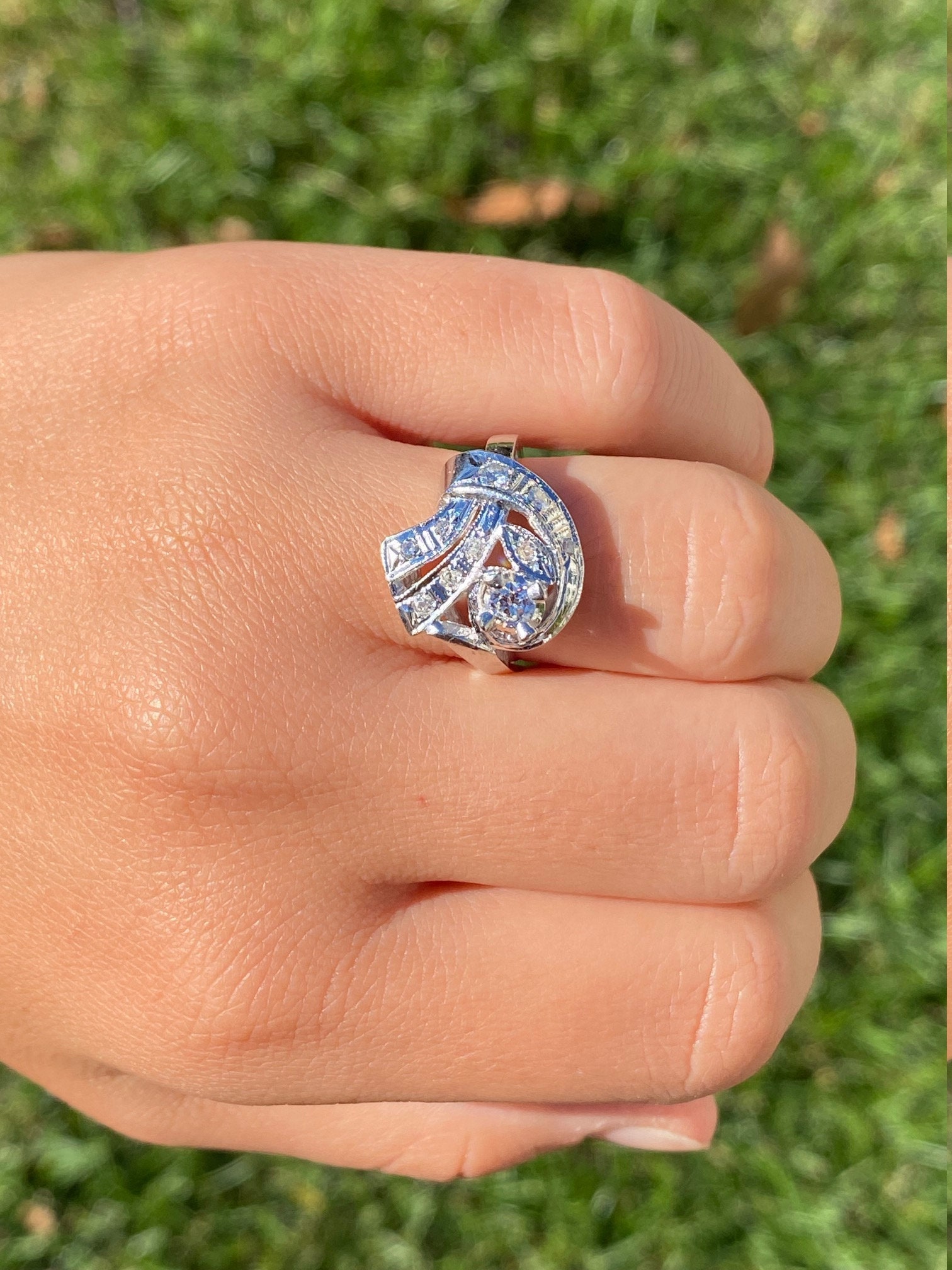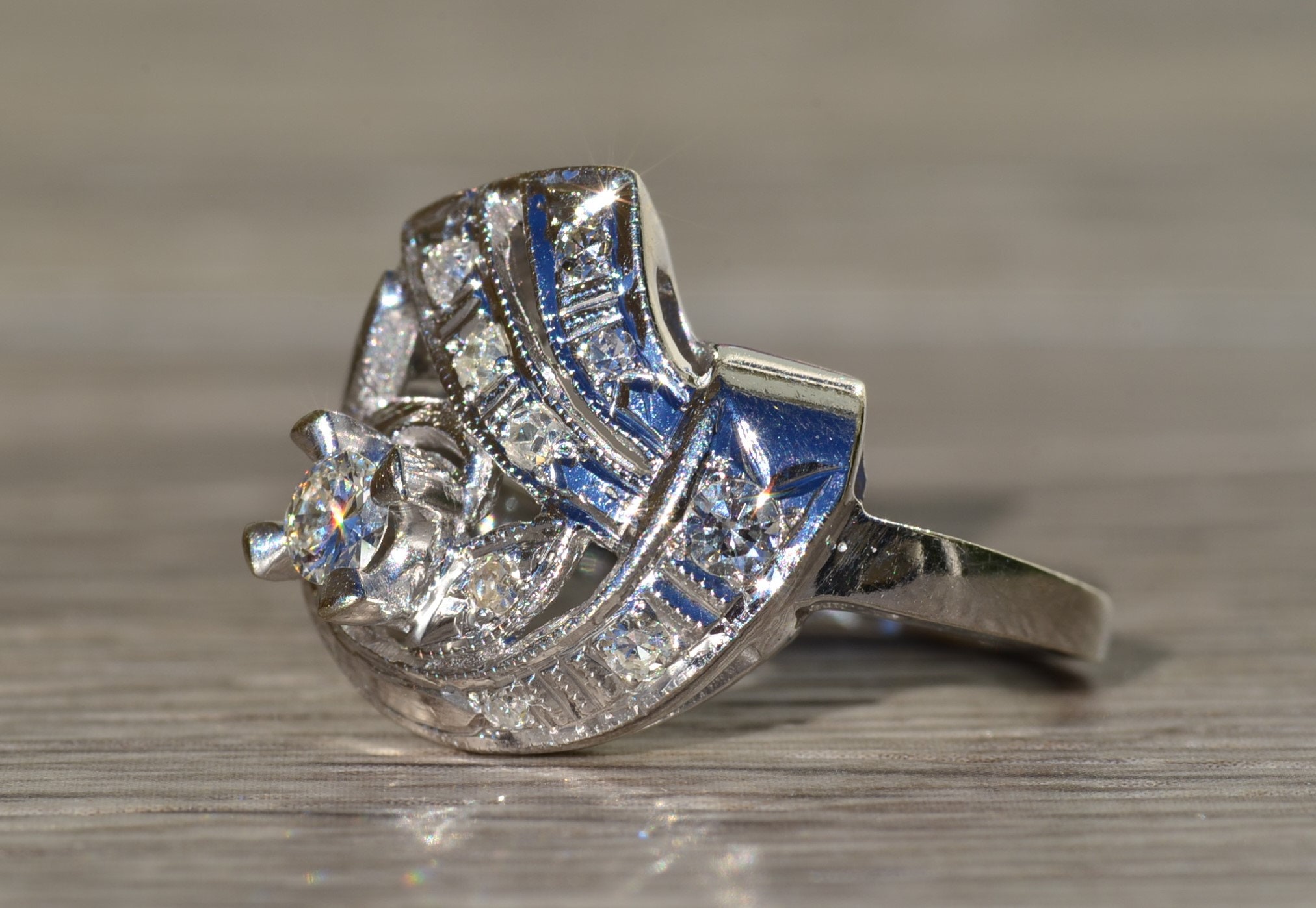 Ladies Antique Cocktail Ring in 14K Gold set with Diamonds. Crafted in 14 karat white gold, this antique ladies ring features a total diamond weight of 0.40 carats. Deco in design, you can find original beadwork surrounding the diamonds. Currently a finger size 7, this ring can be resized for an additional charge.
