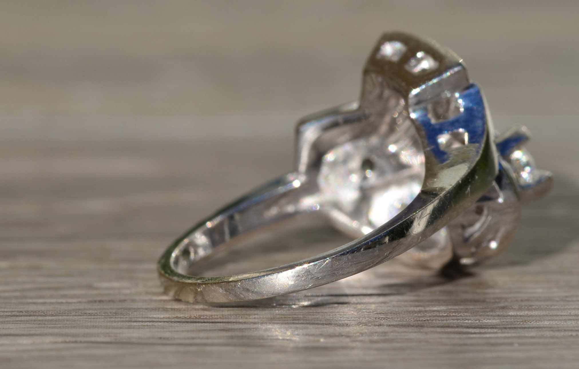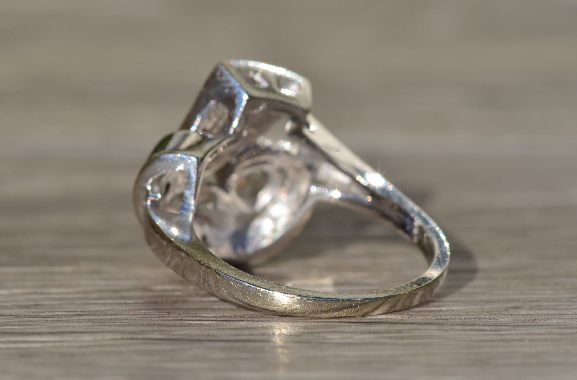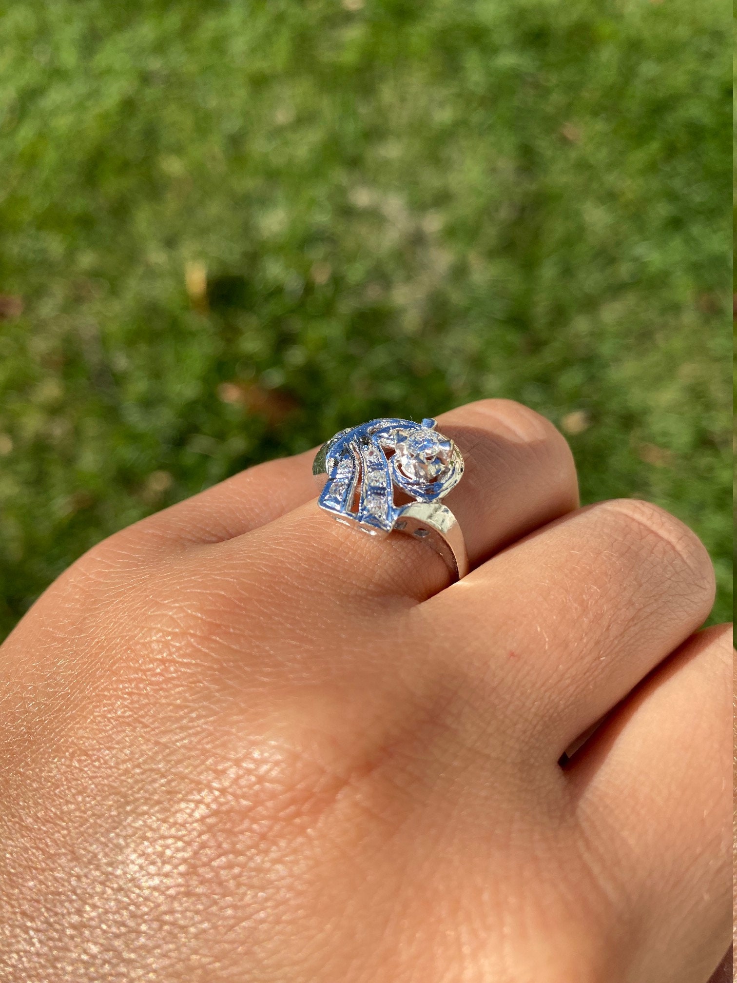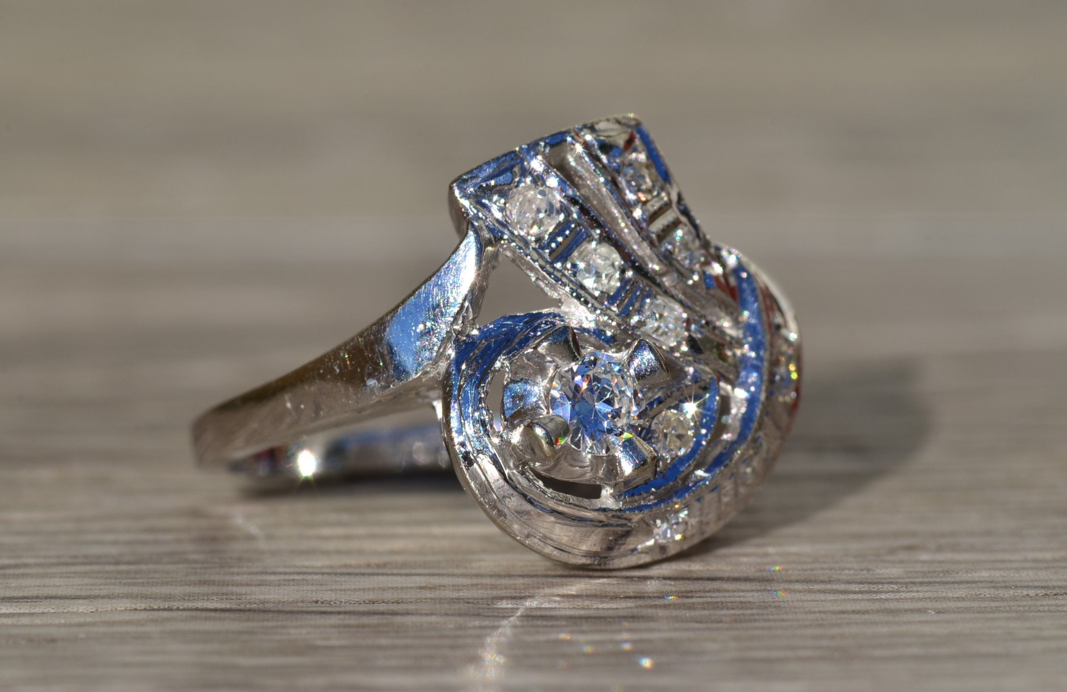 Ladies Antique Cocktail Ring in 14K Gold set with Diamonds. Crafted in 14 karat white gold, this antique ladies ring features a total diamond weight of 0.40 carats. Deco in design, you can find original beadwork surrounding the diamonds. Currently a finger size 7, this ring can be resized for an additional charge.