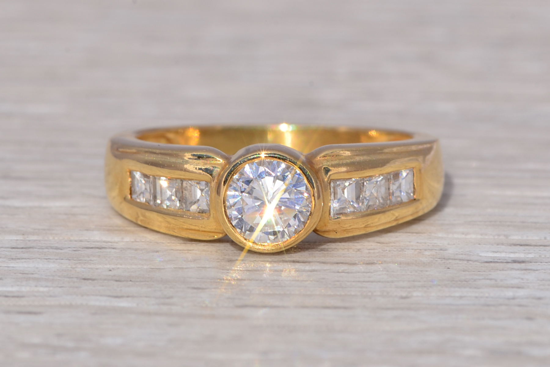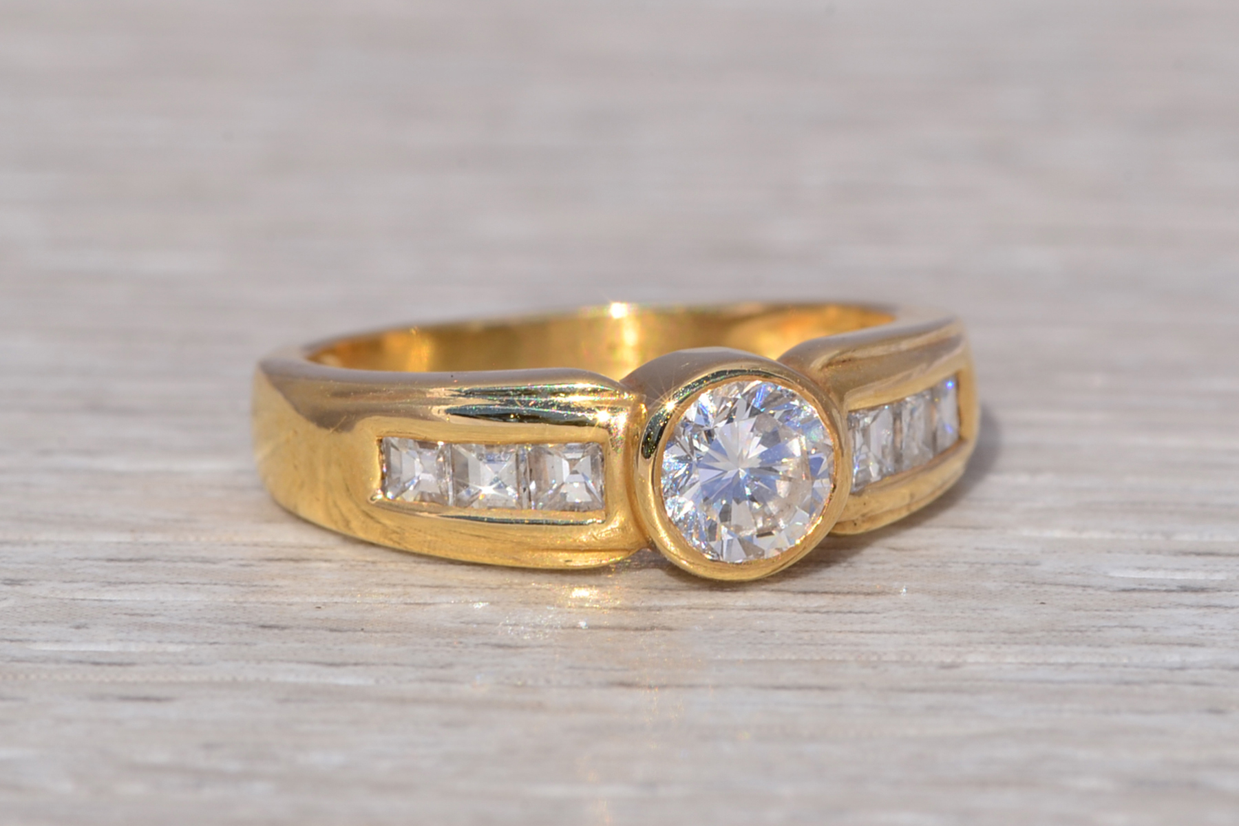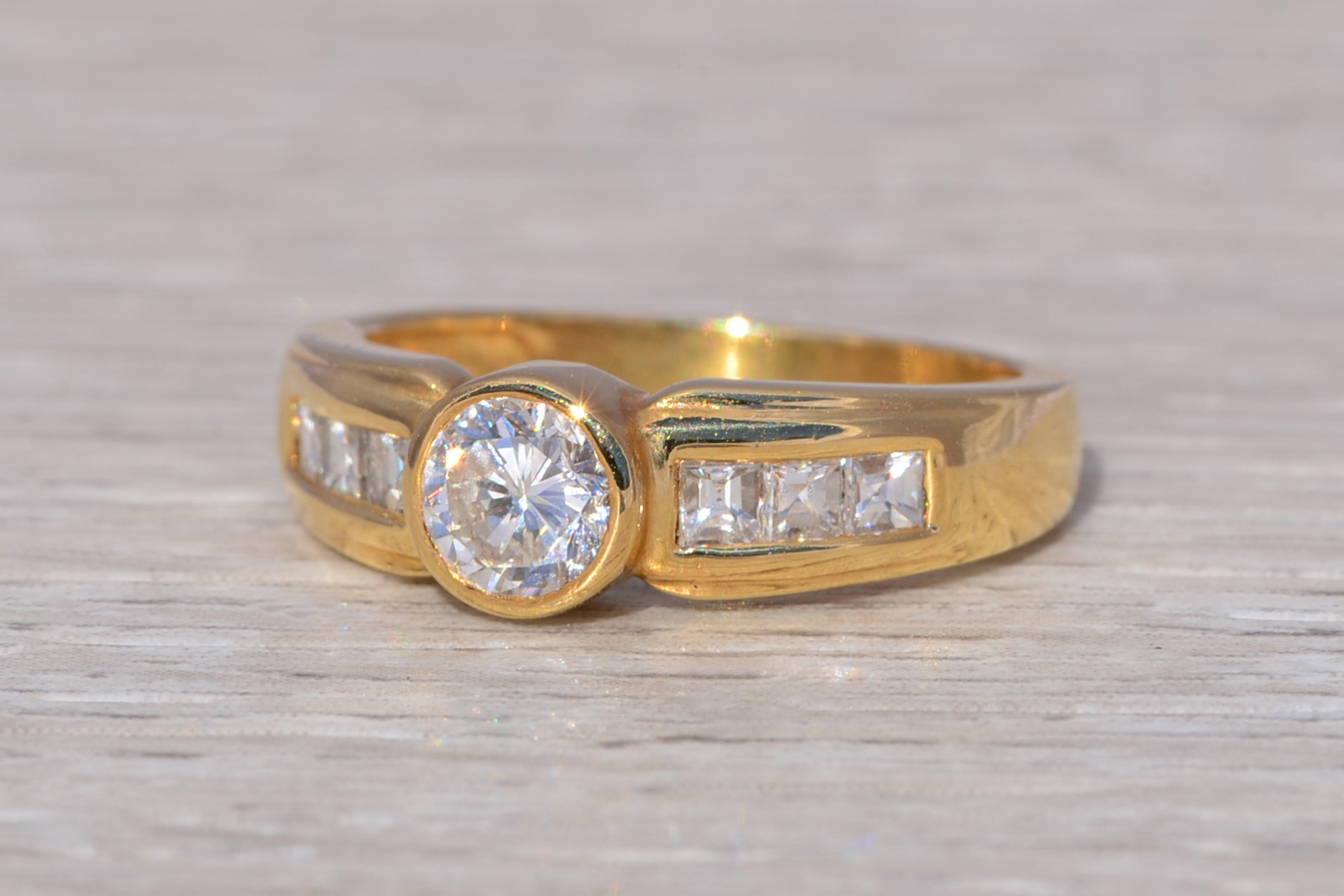 SKU: 80100116 Categories: All Antique & Vintage Engagement Rings, All Antiquities & Vintage, Contemporary Engagement Rings, Contemporary Jewelry, Engagement Rings, New & Bespoke, New & Bespoke Engagement Rings, Phat Nineties Jewelry, Radical Eighties Jewelry, Vintage Engagement Rings Tags: 14 karat gold, 14 karat gold ring, 1990s, 1990s ring, asscher cut, asscher cut diamond, bezel set ring, bezel setting, cocktail ring, diamond ring, engagement ring, gift for her, ladies' ring, natural diamond, round diamond band, round diamond ring, statement ring, vintage ring, yellow gold, yellow gold ring