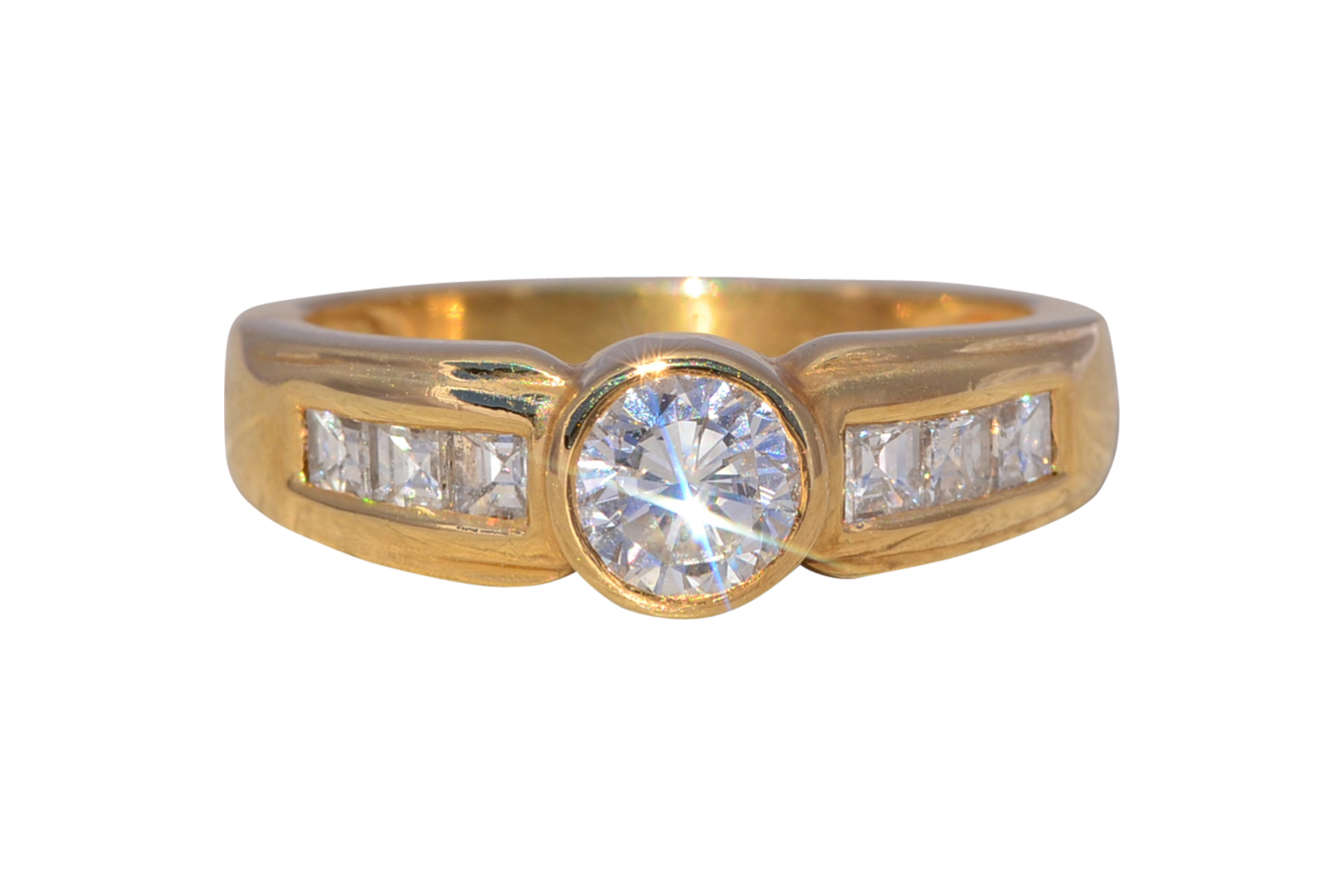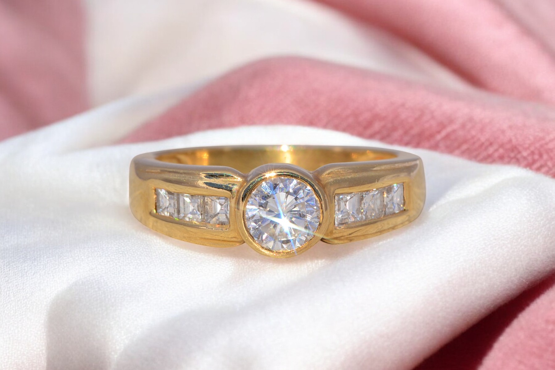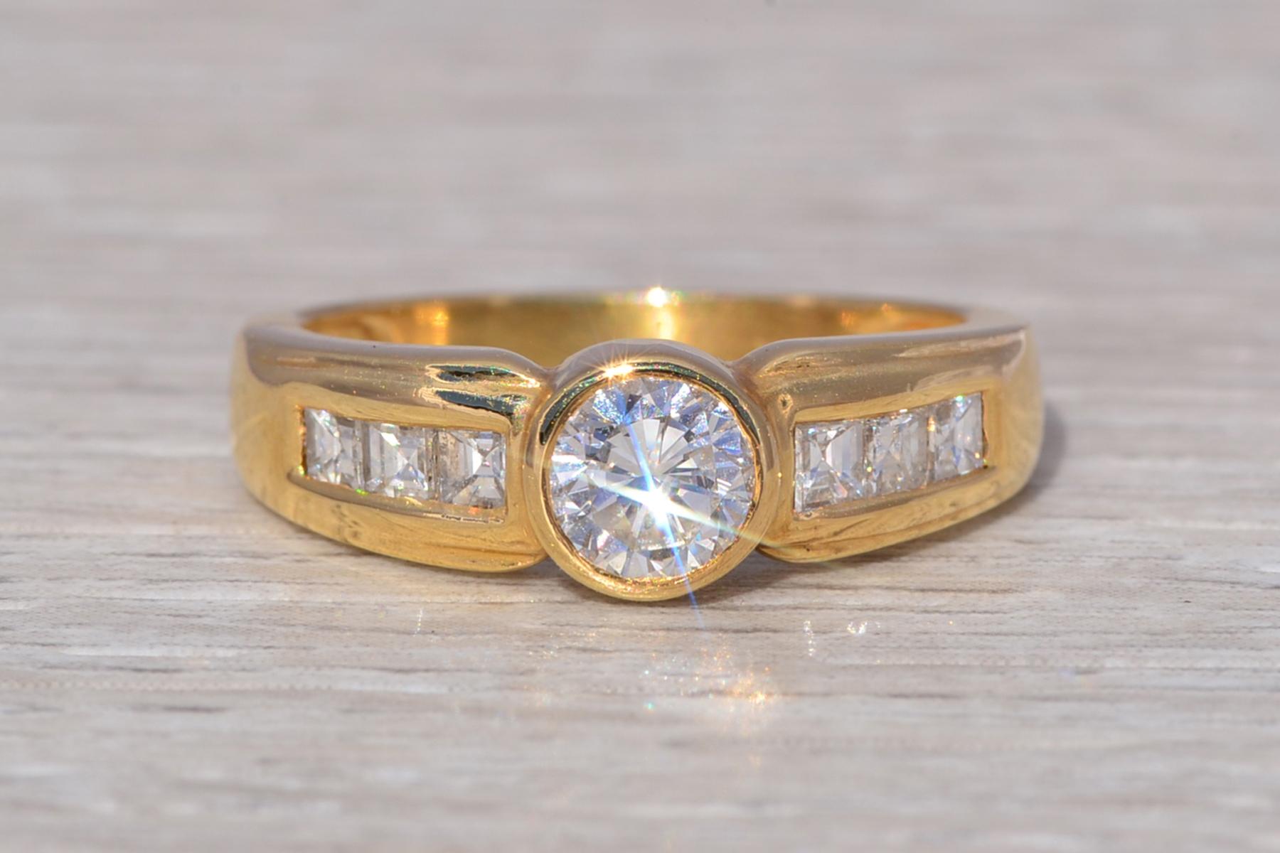SKU: 80100116 Categories: All Antique & Vintage Engagement Rings, All Antiquities & Vintage, Contemporary Engagement Rings, Contemporary Jewelry, Engagement Rings, New & Bespoke, New & Bespoke Engagement Rings, Phat Nineties Jewelry, Radical Eighties Jewelry, Vintage Engagement Rings Tags: 14 karat gold, 14 karat gold ring, 1990s, 1990s ring, asscher cut, asscher cut diamond, bezel set ring, bezel setting, cocktail ring, diamond ring, engagement ring, gift for her, ladies' ring, natural diamond, round diamond band, round diamond ring, statement ring, vintage ring, yellow gold, yellow gold ring