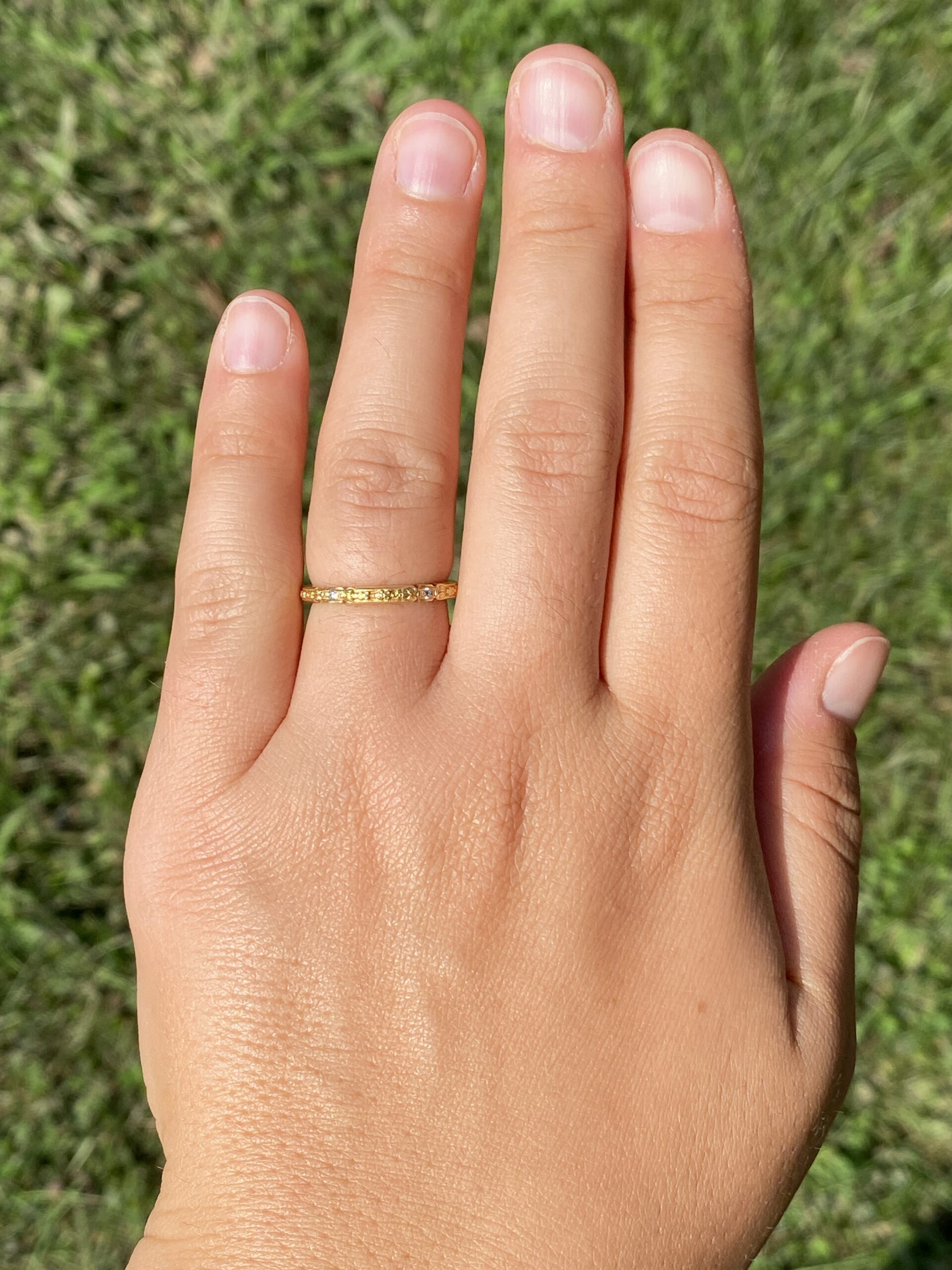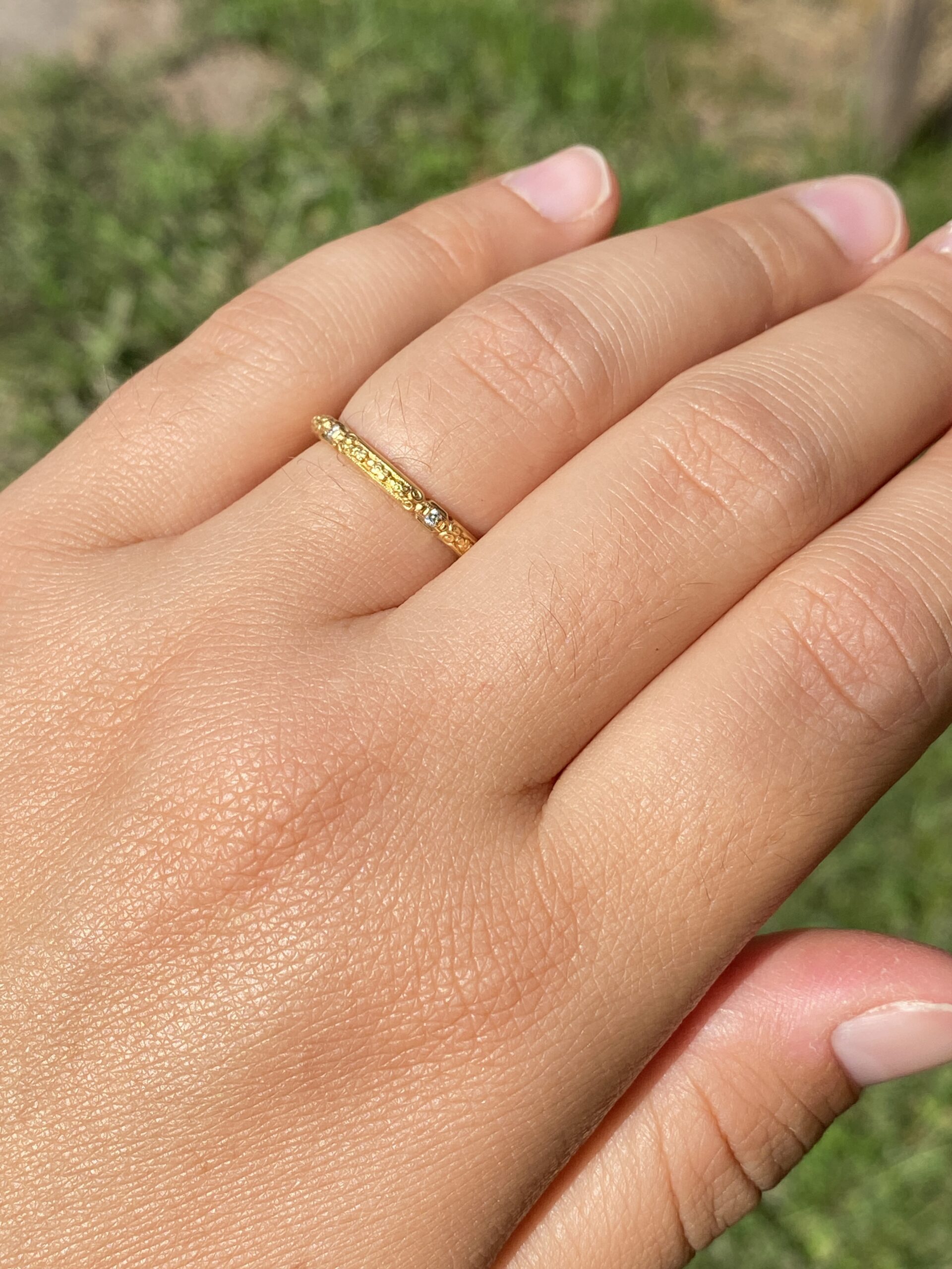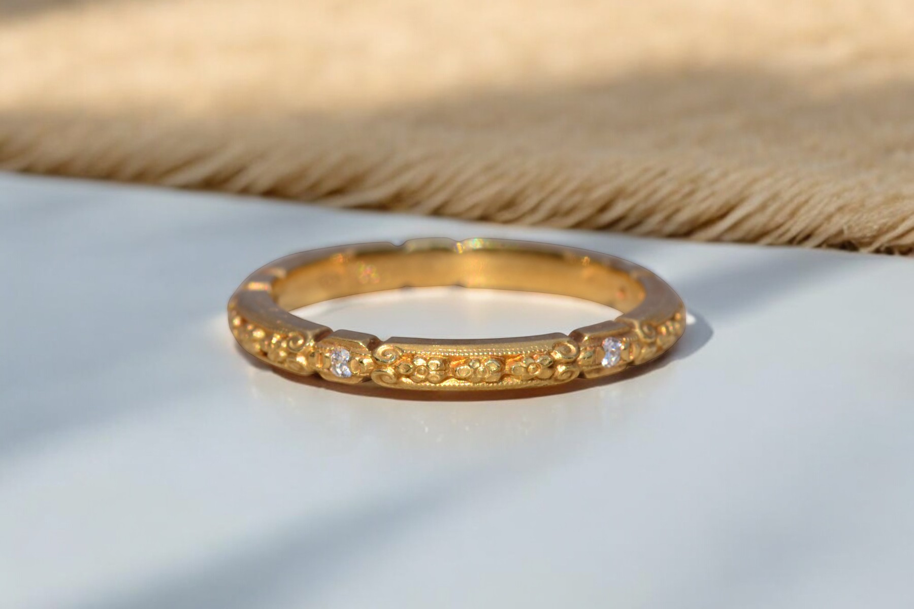 This elegant piece, known as The Golden Whisper, features a timeless eternity design delicately adorned with natural diamonds totaling approximately 0.05 carats. The round brilliant cut diamonds are set intermittently along the band, nestled within intricate scrolling and beaded detailing that exudes refined craftsmanship. The warm matte texture of the 18 karat yellow gold enhances the delicate sparkle of the diamonds, creating a piece that feels both vintage-inspired and effortlessly graceful. The ring is crafted in 18 karat yellow gold and is currently a finger size 6.5 yet can be adjusted to any finger size for an additional charge upon request, ensuring a perfect fit.
