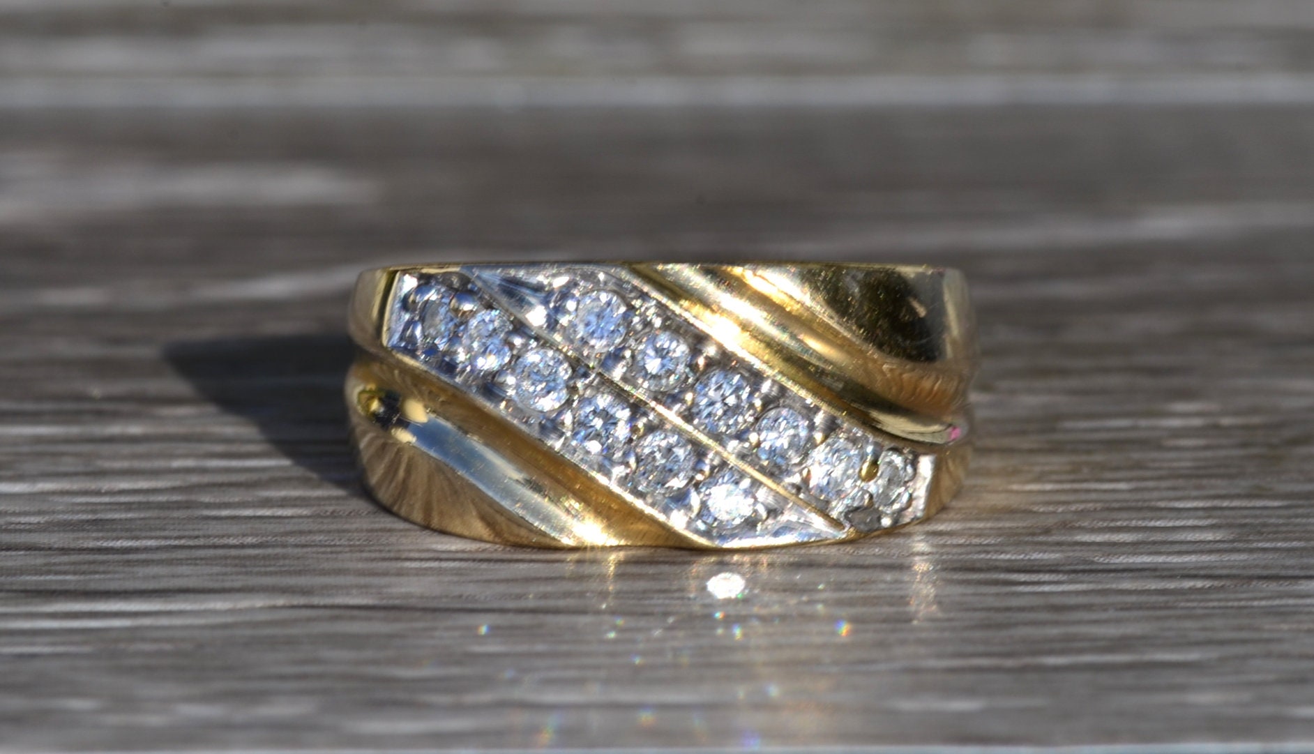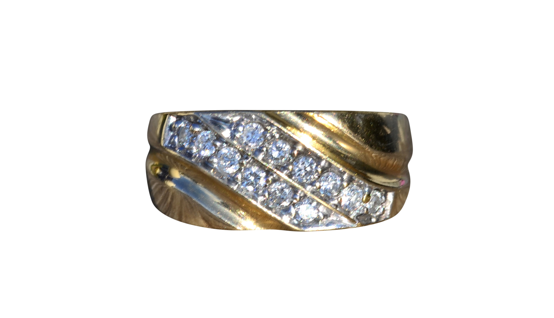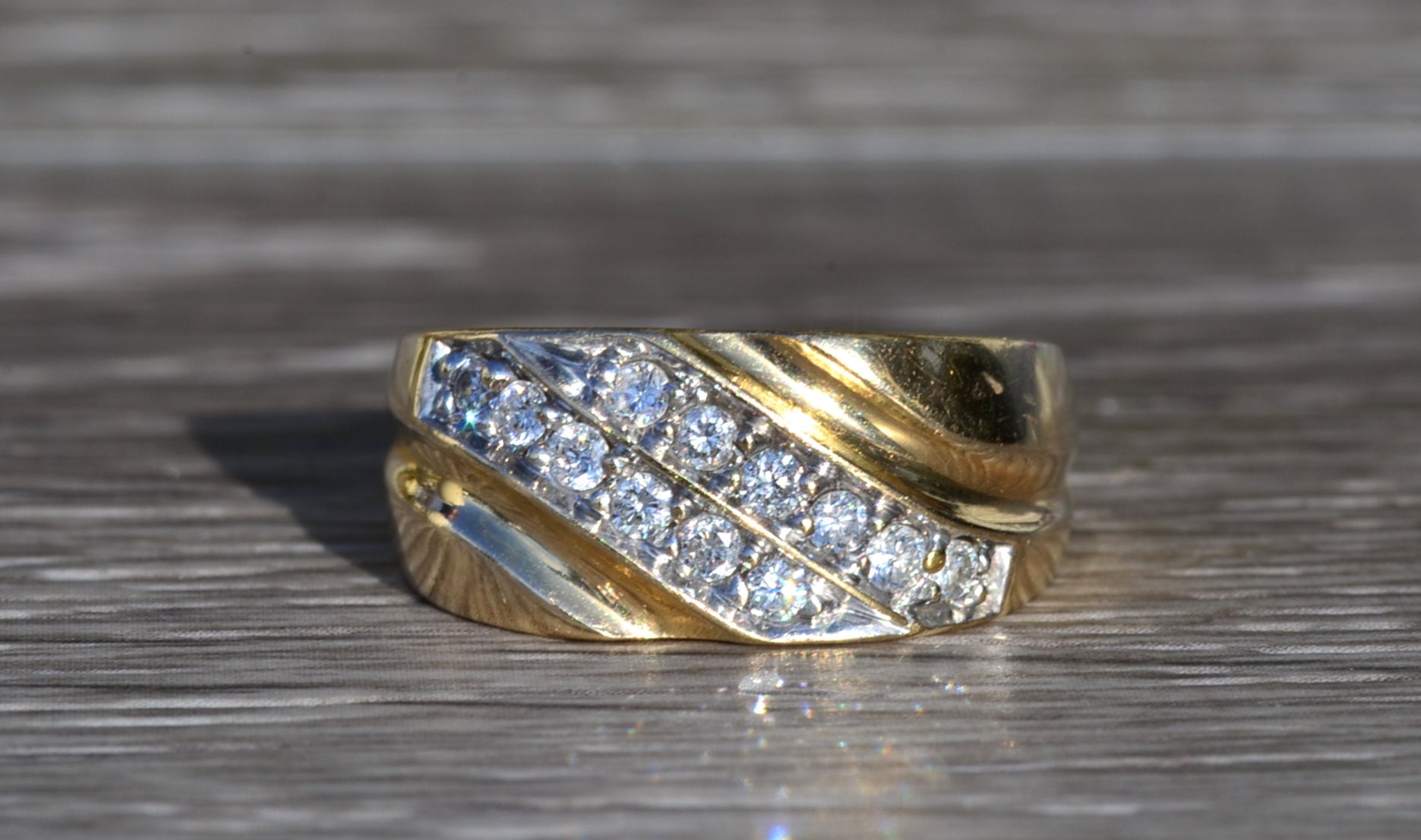 The Goodlettsville: Men’s 14K Yellow Gold 0.45 CTW Diamond Cocktail Ring. Crafted in 14 karat yellow gold, this gentlemen’s cocktail ring features two diagonal rows of round diamonds for a total diamond weight of 0.45 carats. Currently a finger size 9.75, this ring can be resized for an additional charge.