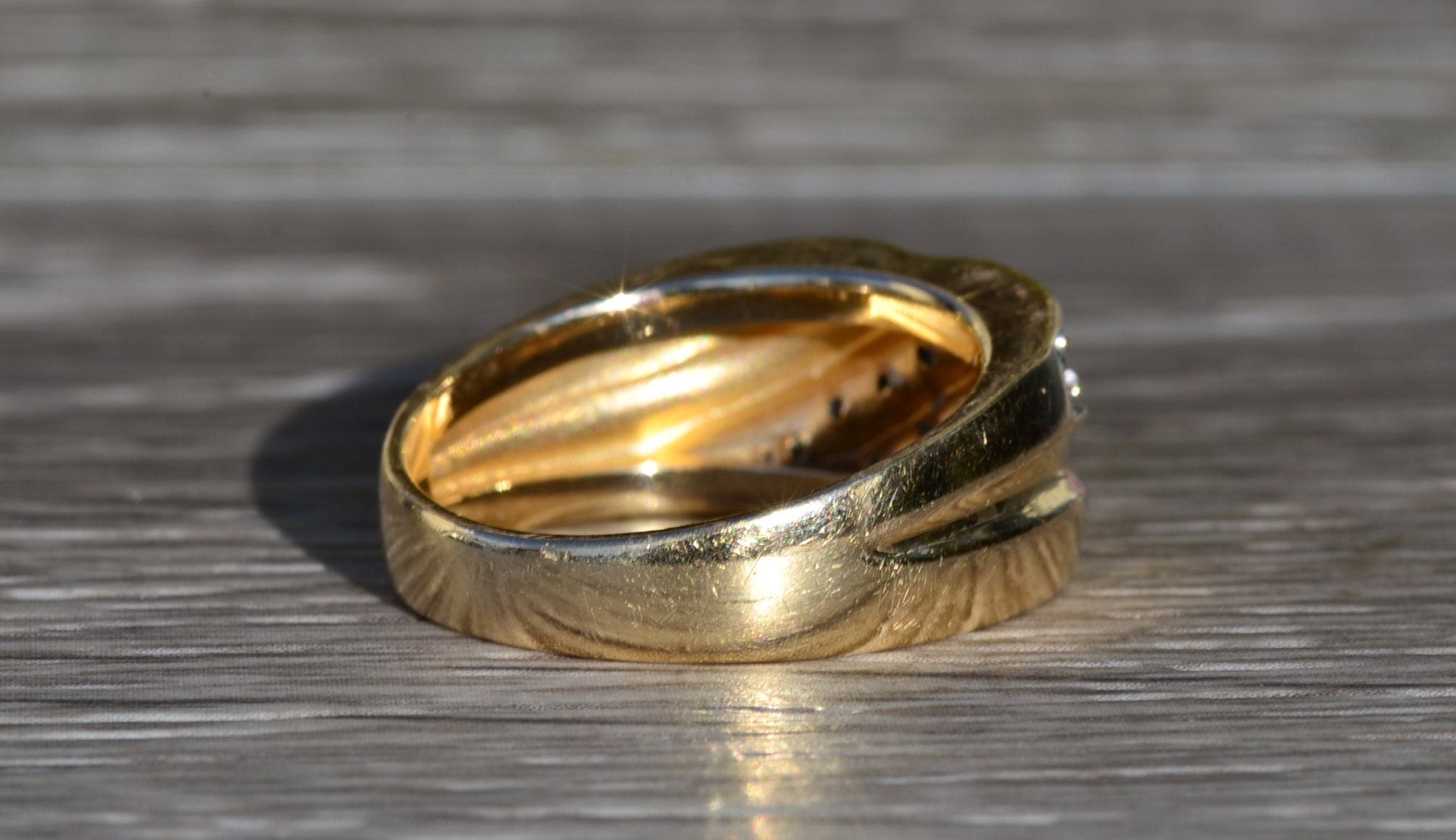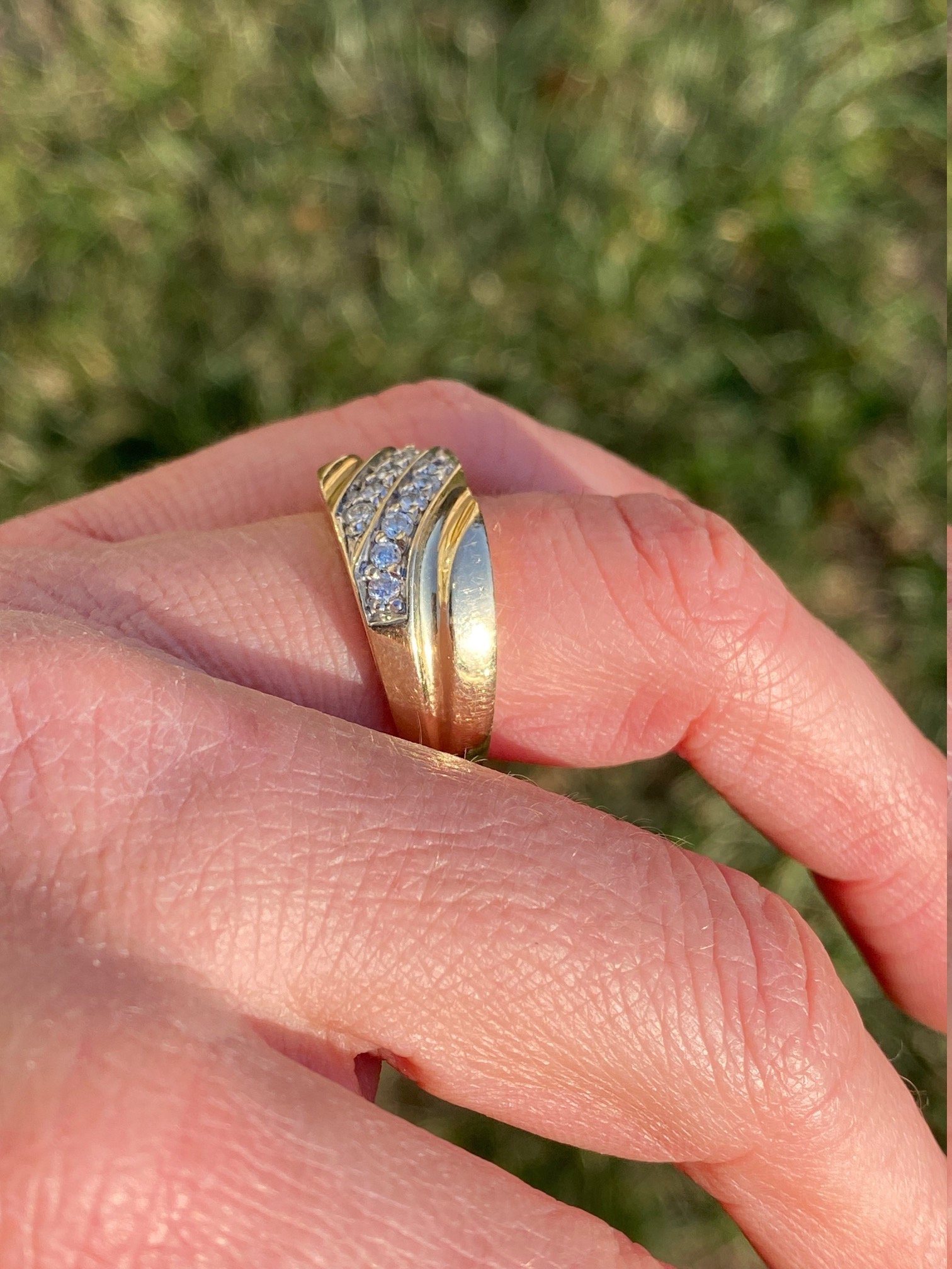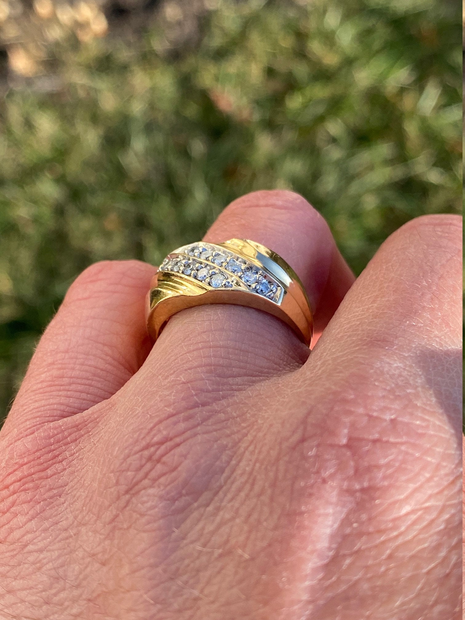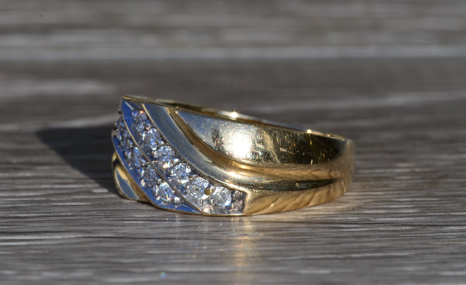 The Goodlettsville: Men’s 14K Yellow Gold 0.45 CTW Diamond Cocktail Ring. Crafted in 14 karat yellow gold, this gentlemen’s cocktail ring features two diagonal rows of round diamonds for a total diamond weight of 0.45 carats. Currently a finger size 9.75, this ring can be resized for an additional charge.