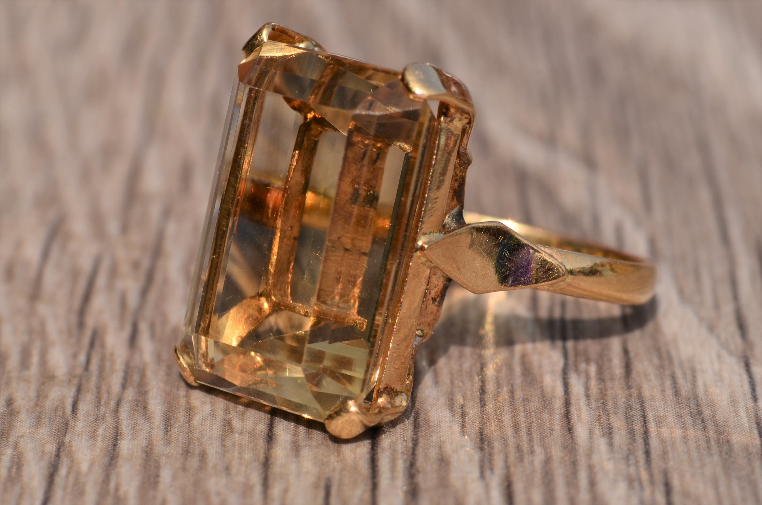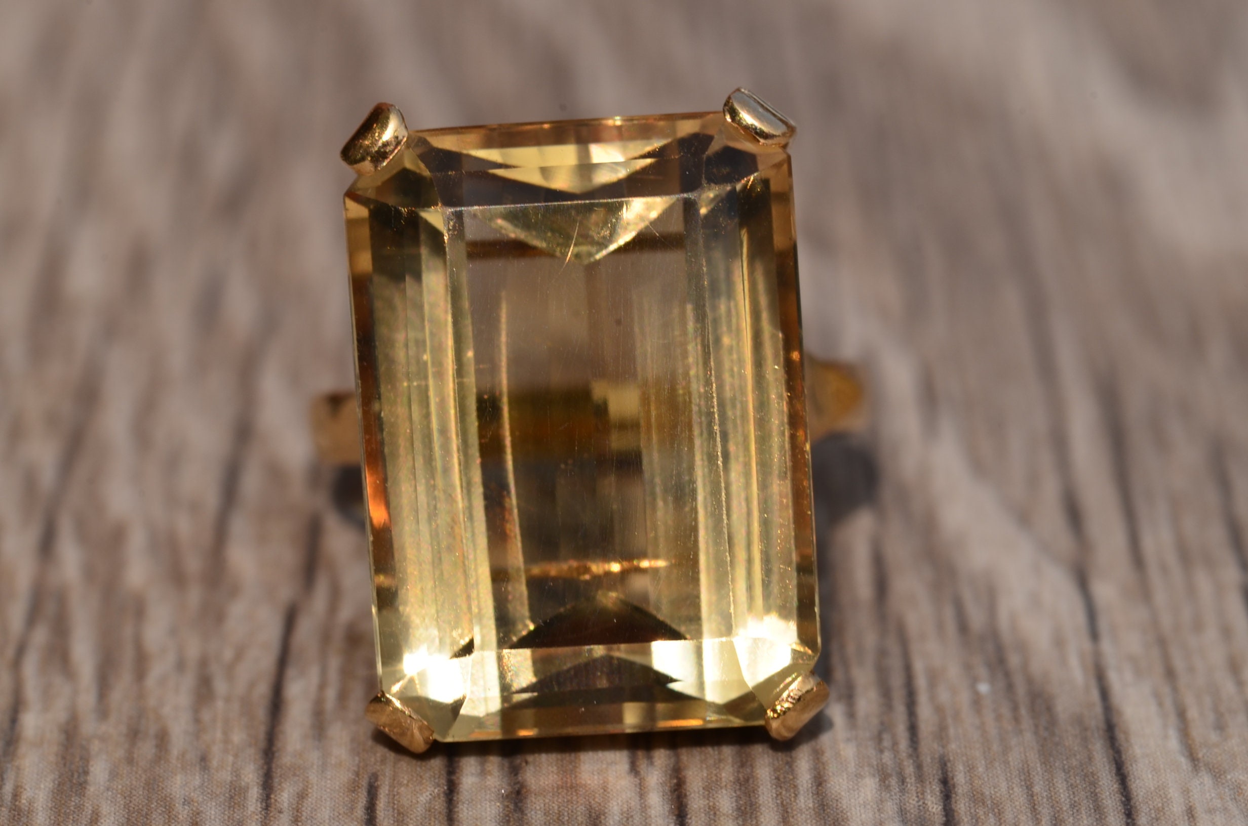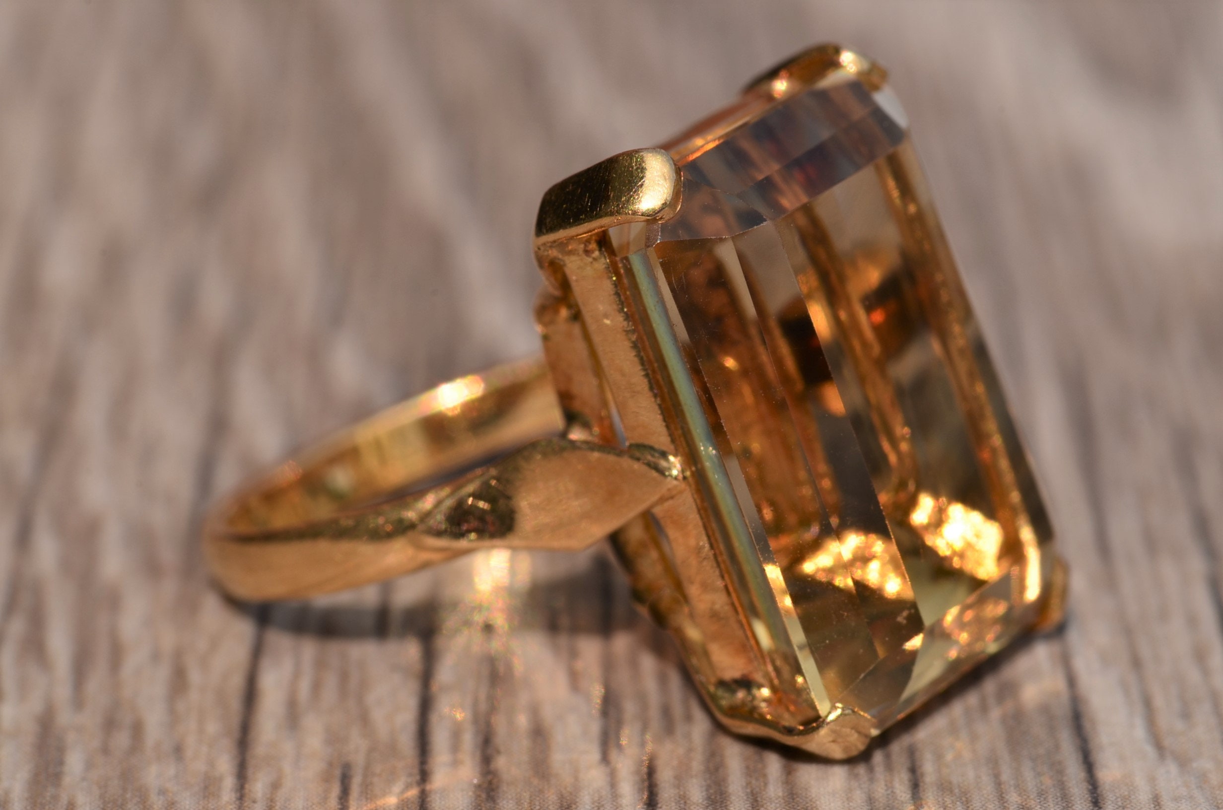 Bold Emerald Cut Quartz Statement Ring in 18 Karat Yellow Gold. This ring features a large emerald cut quartz center stone that has great presence on the hand. Admire the wonderful step cuts this golden colored stone offers. The ring is currently a finger size 6 1/4, yet can be adjusted in size.