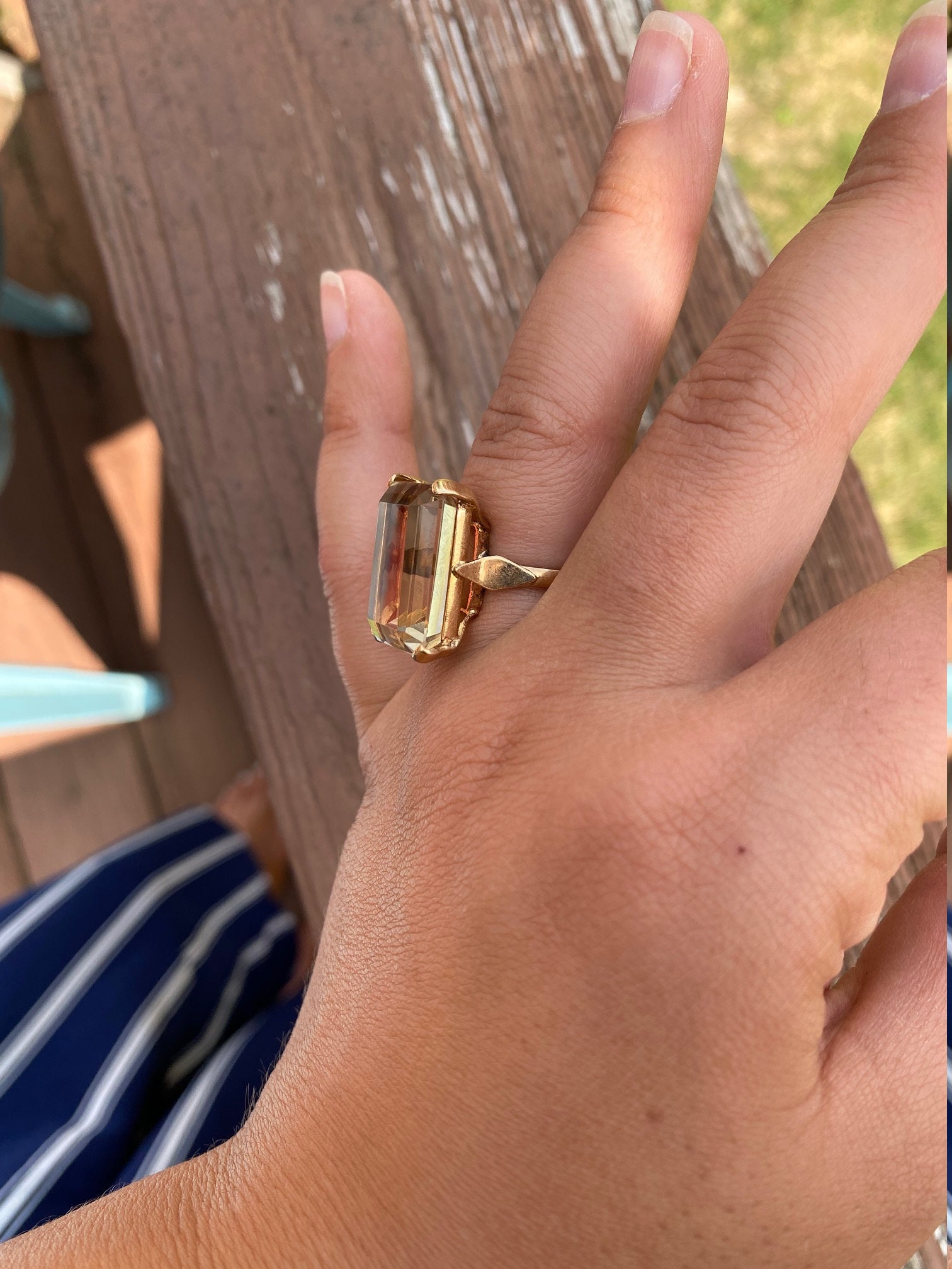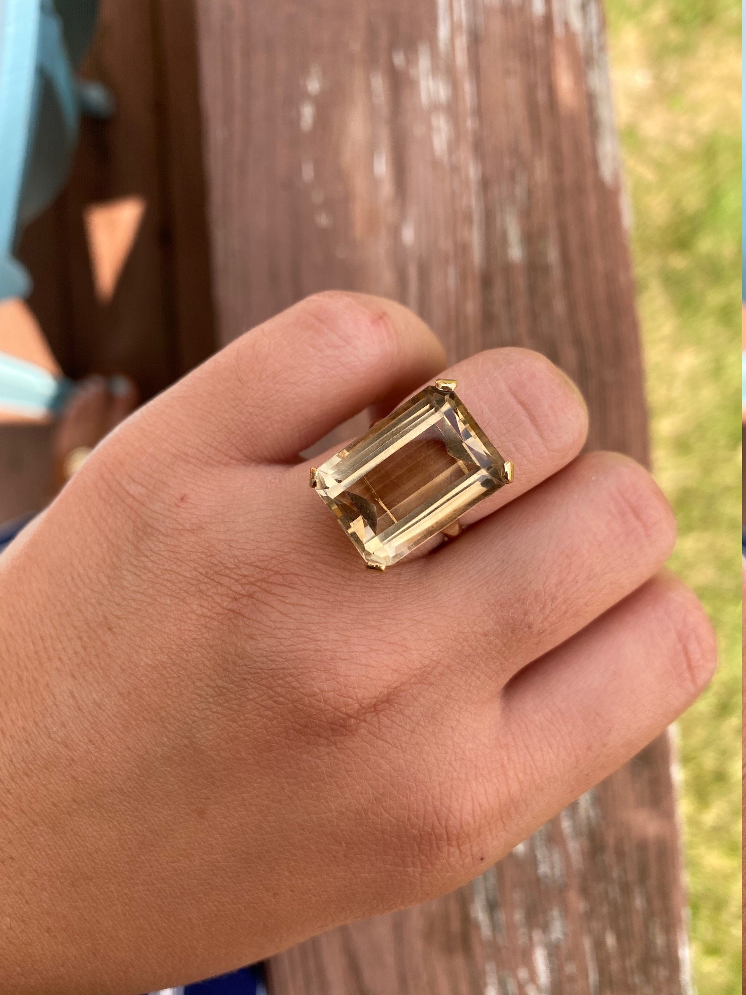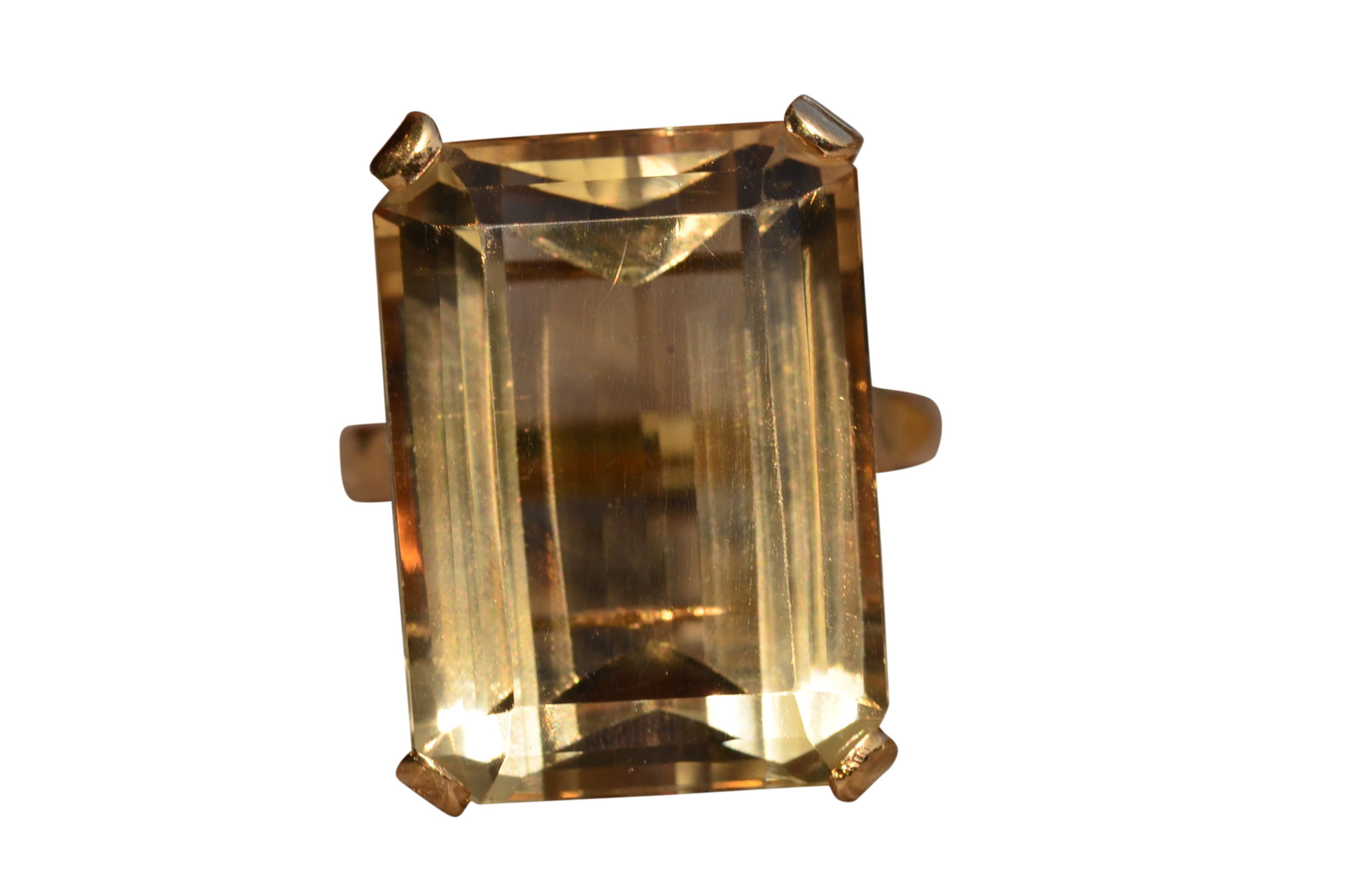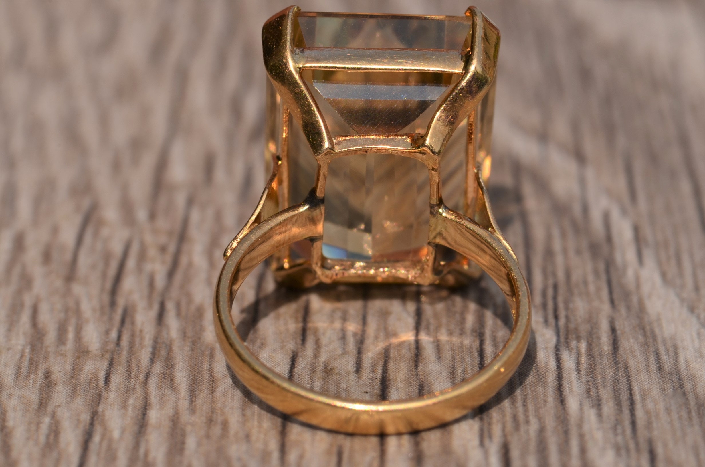 Bold Emerald Cut Quartz Statement Ring in 18 Karat Yellow Gold. This ring features a large emerald cut quartz center stone that has great presence on the hand. Admire the wonderful step cuts this golden colored stone offers. The ring is currently a finger size 6 1/4, yet can be adjusted in size.