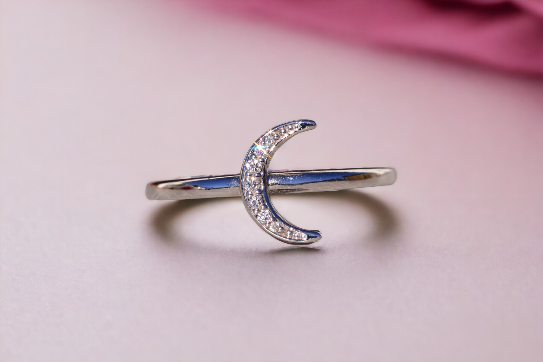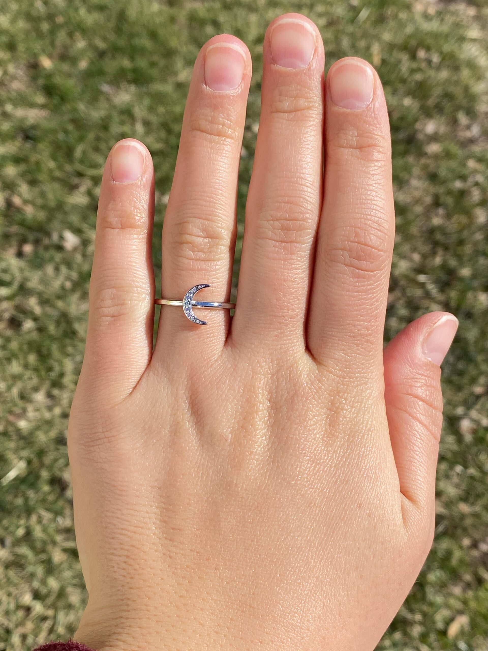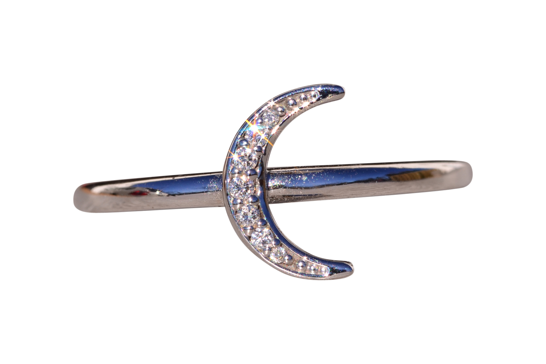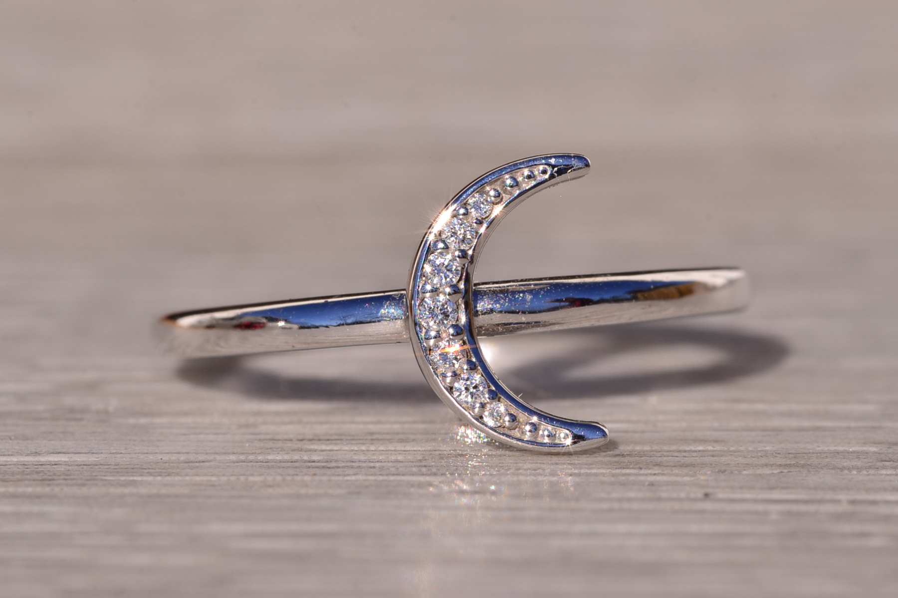 The Halver: Crescent Moon Natural Diamond Ring in White Gold. This ring exudes contemporary elegance with its sleek and minimalist design. At the center lies a crescent-shaped setting adorned with natural diamonds. Crafted from lustrous 14 karat white gold, the ring boasts a modern aesthetic that is both timeless and versatile. With its slender shank, the ring offers a delicate and refined silhouette, perfect for everyday wear or special occasions. Currently sized at 7.25, it can be resized to fit any finger size upon request, ensuring a comfortable and personalized fit.