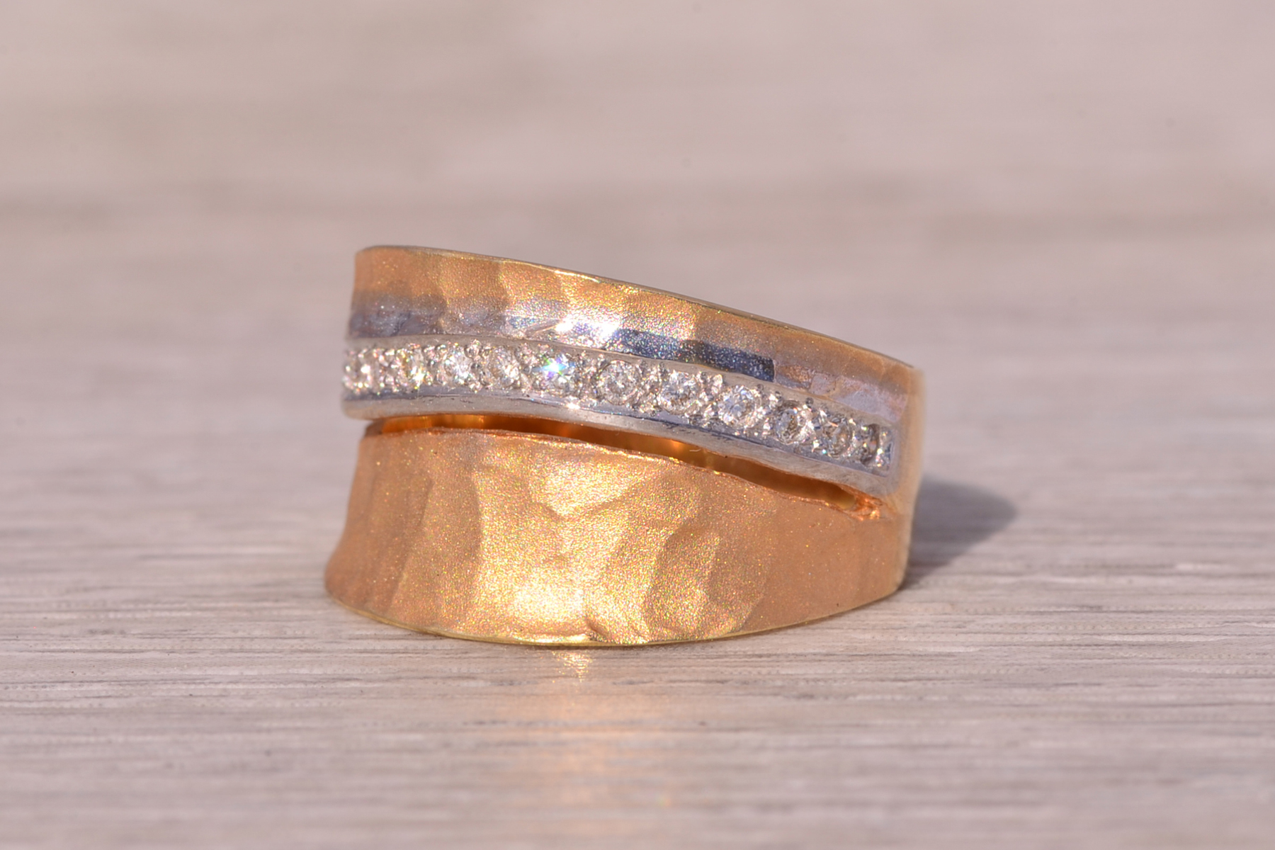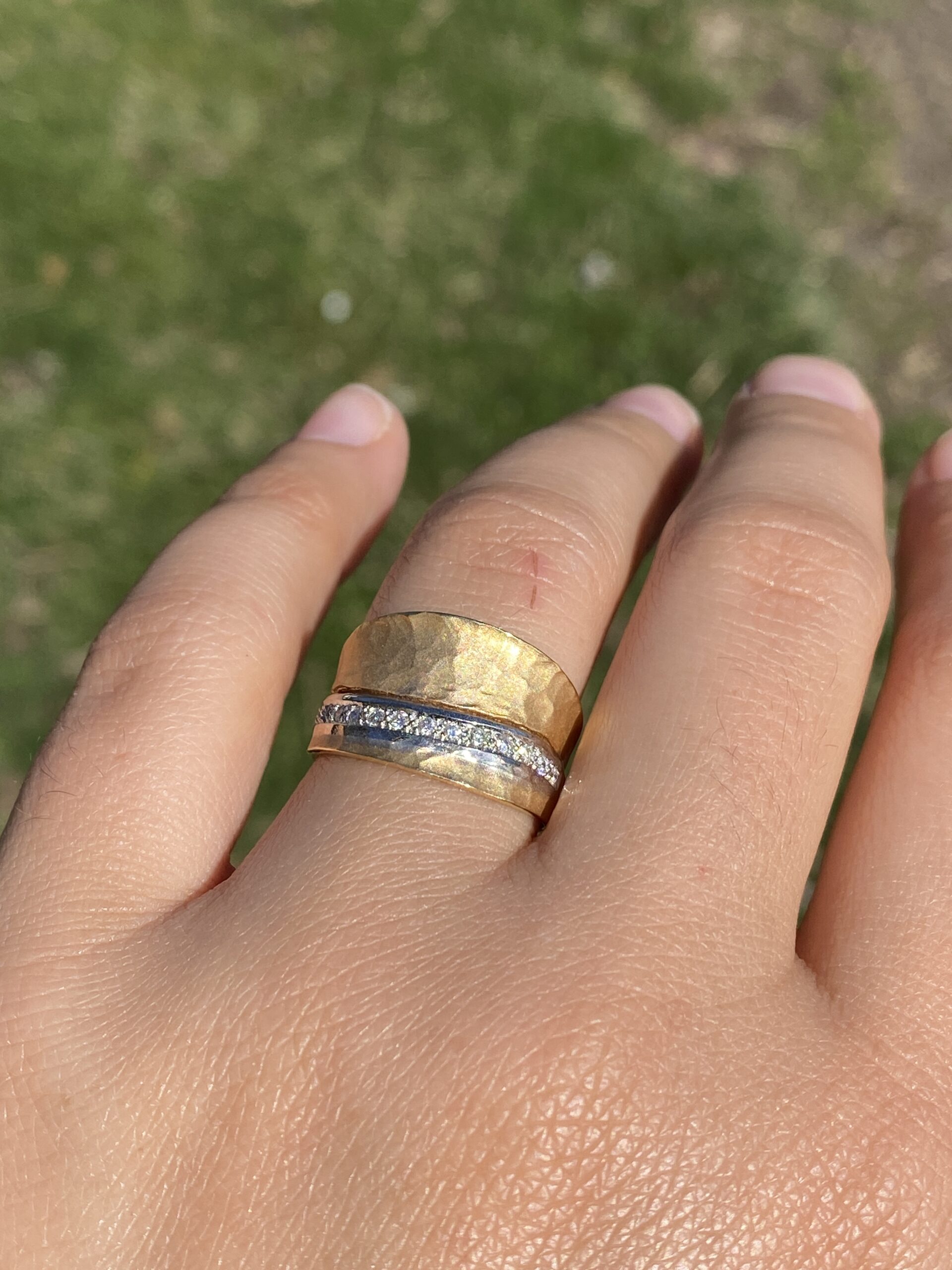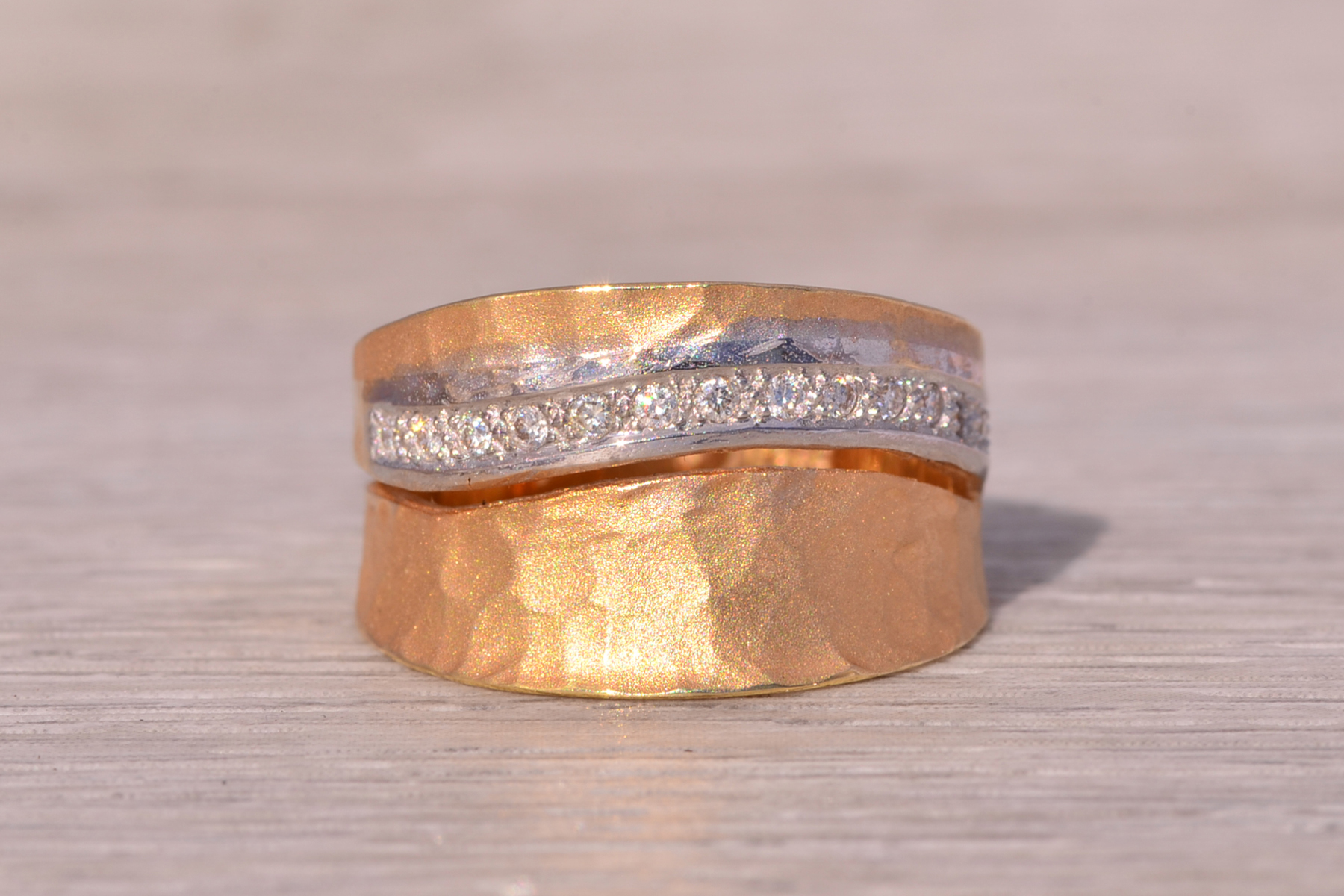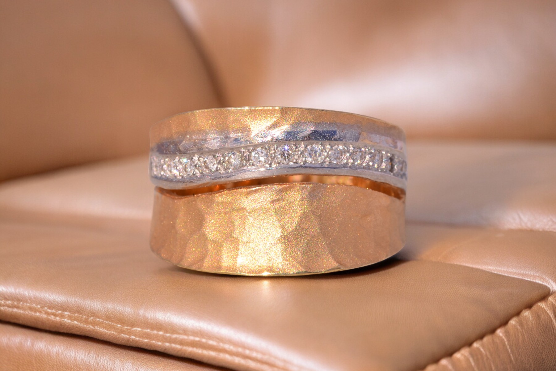 This stunning piece, known as The Hammered Harmony, features a captivating blend of 14 karat yellow and white gold with a unique hammered matte finish. The sleek design showcases a row of sparkling natural diamonds totaling 0.15 carats, set in the white gold band, creating a striking contrast against the warm yellow gold. The combination of textures and metals gives the ring a timeless yet modern aesthetic. The ring is currently a finger size 7 yet can be adjusted to any finger size for an additional charge upon request, ensuring a perfect fit.