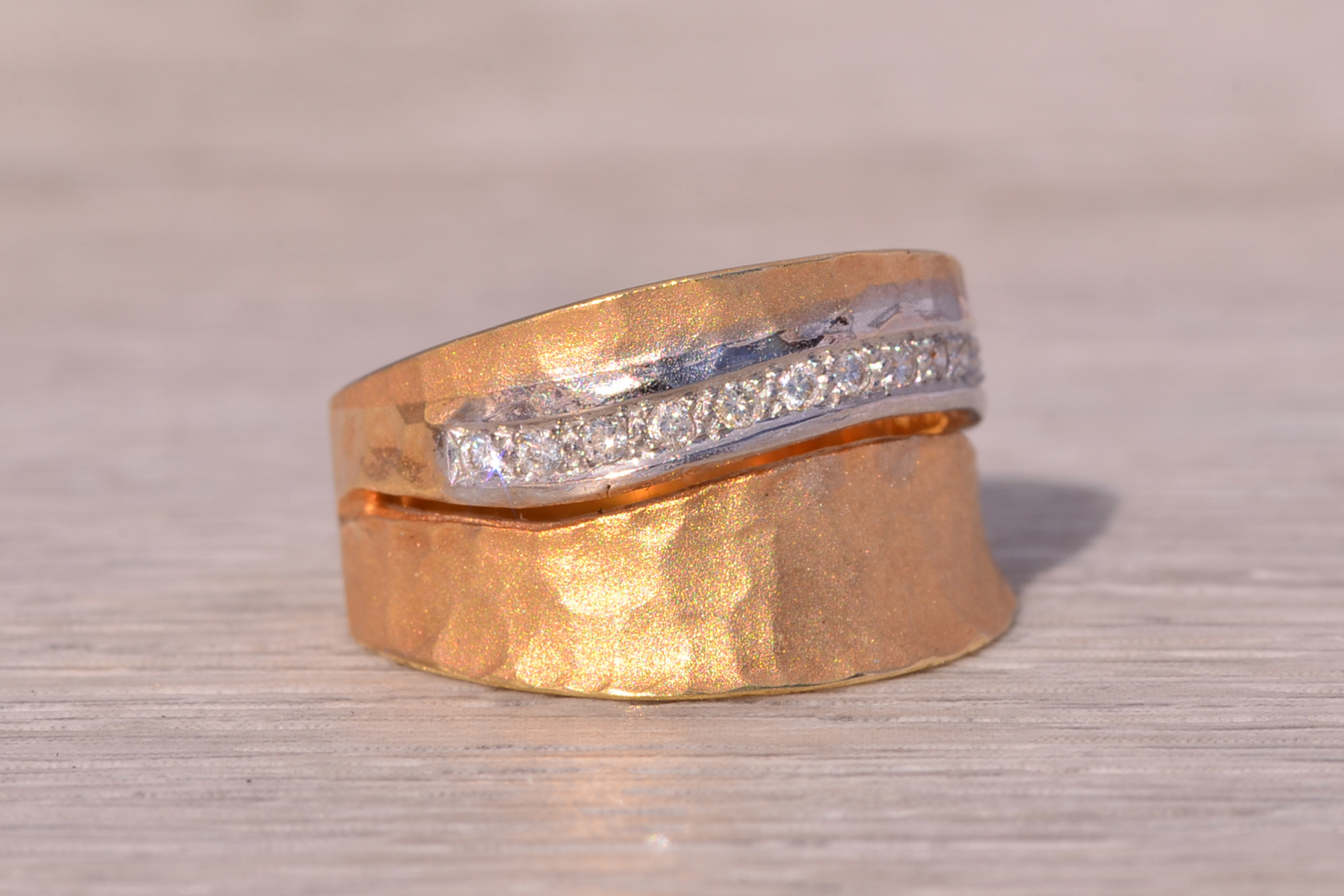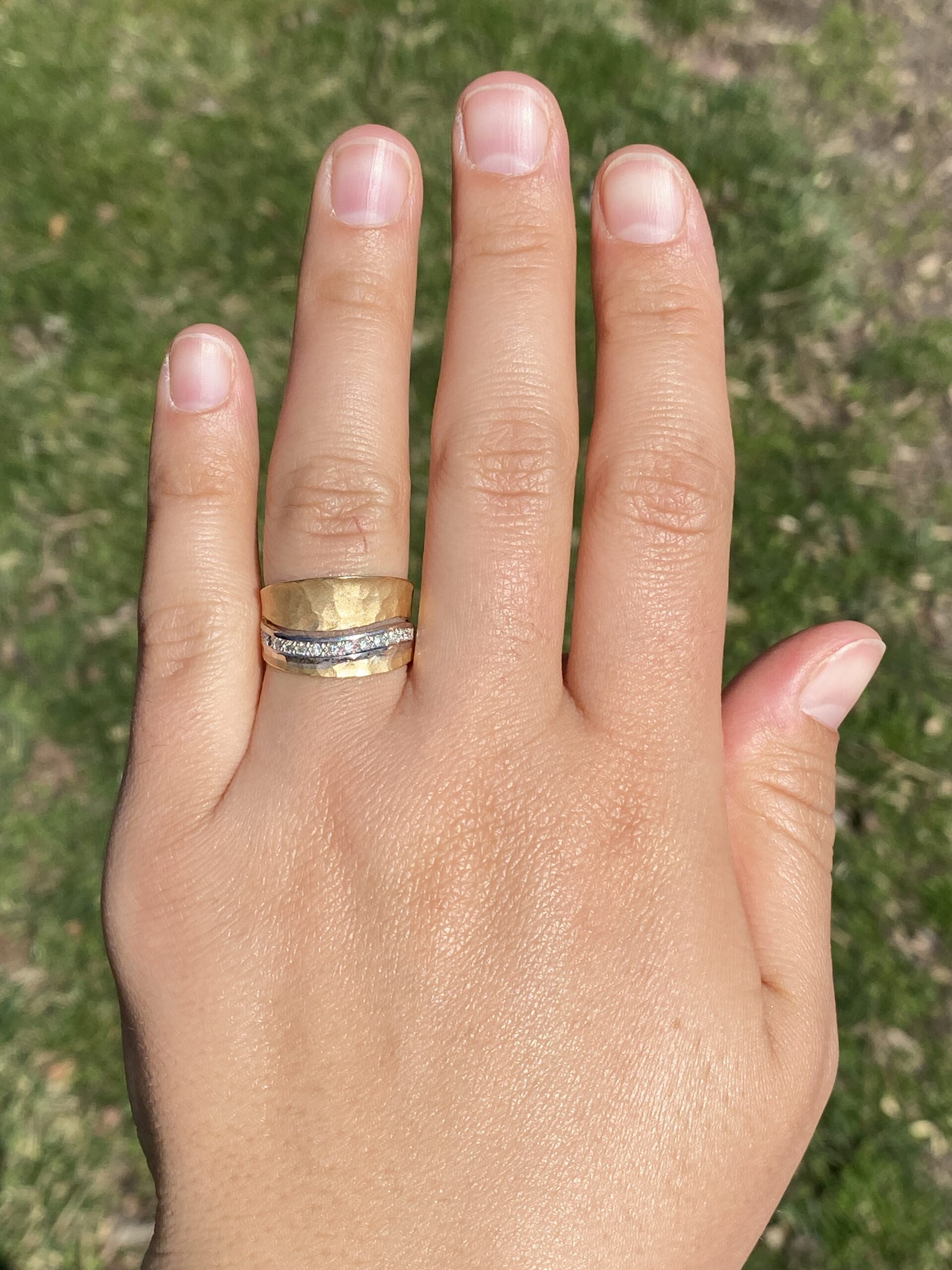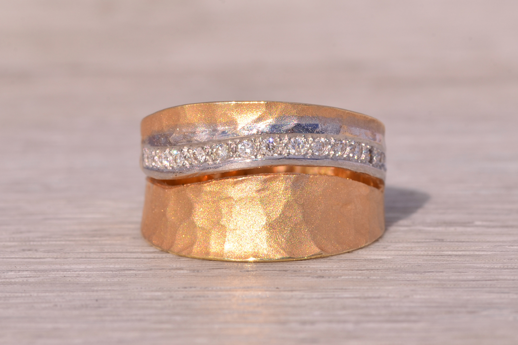 This stunning piece, known as The Hammered Harmony, features a captivating blend of 14 karat yellow and white gold with a unique hammered matte finish. The sleek design showcases a row of sparkling natural diamonds totaling 0.15 carats, set in the white gold band, creating a striking contrast against the warm yellow gold. The combination of textures and metals gives the ring a timeless yet modern aesthetic. The ring is currently a finger size 7 yet can be adjusted to any finger size for an additional charge upon request, ensuring a perfect fit.