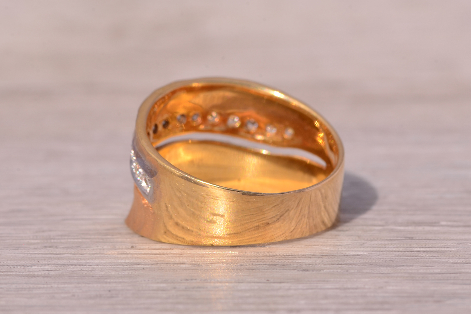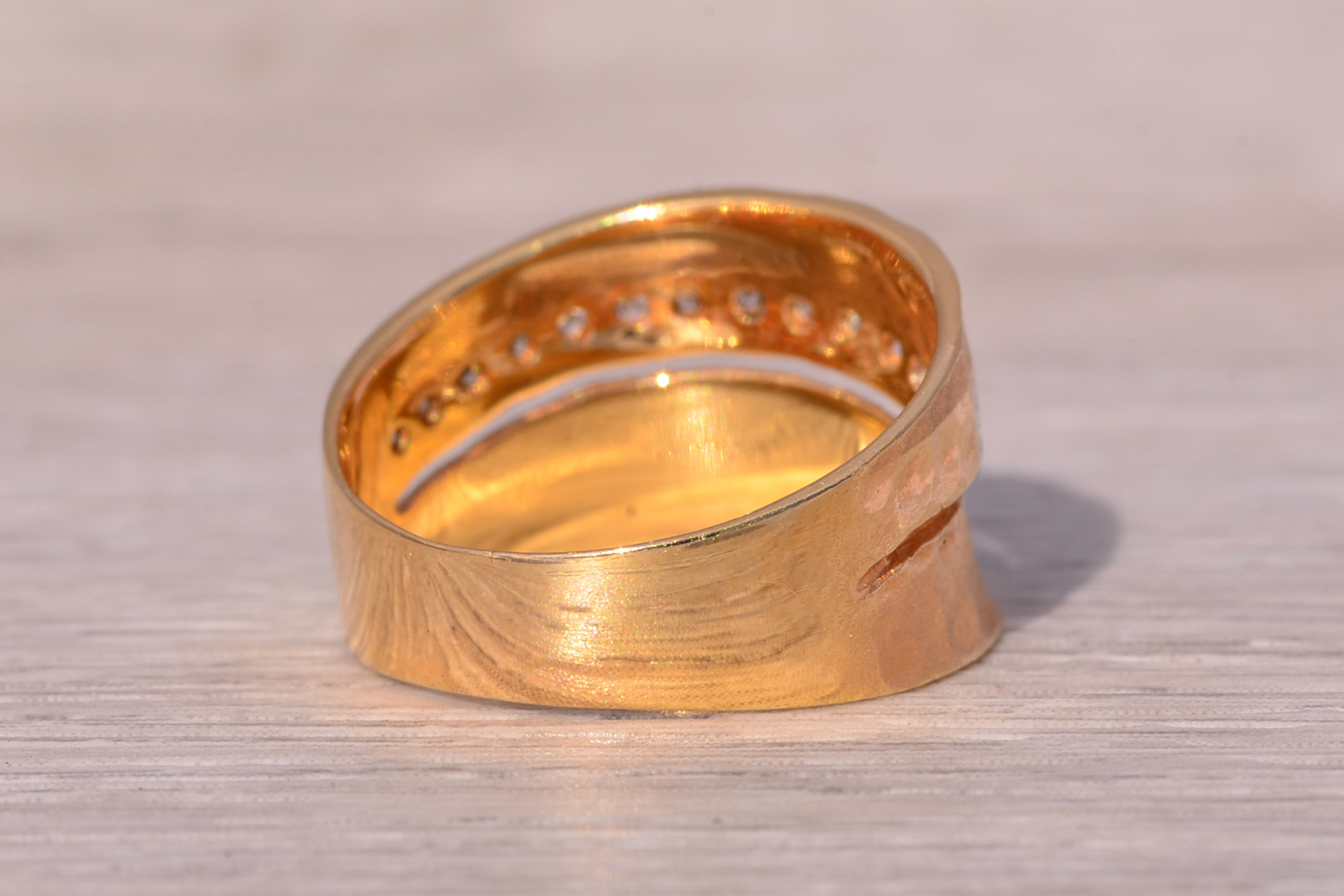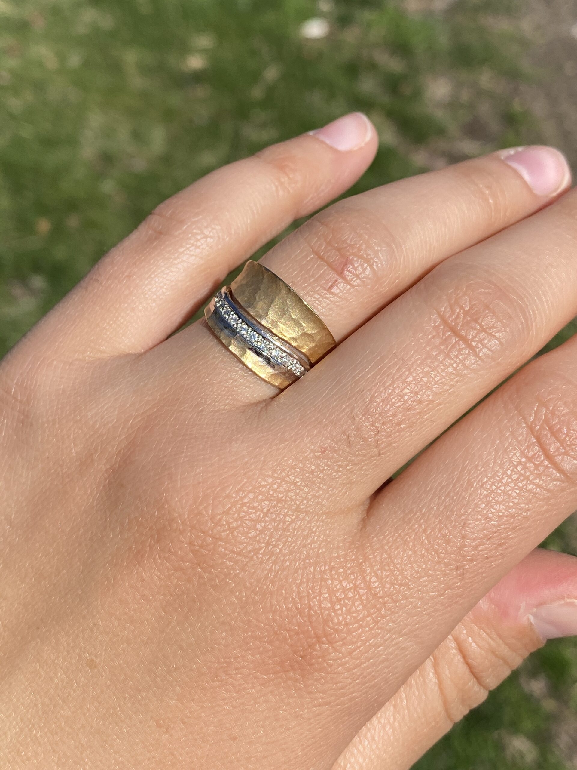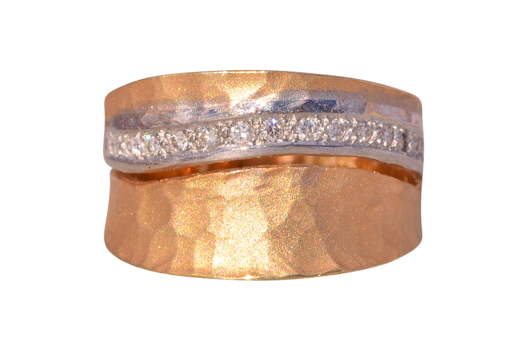 This stunning piece, known as The Hammered Harmony, features a captivating blend of 14 karat yellow and white gold with a unique hammered matte finish. The sleek design showcases a row of sparkling natural diamonds totaling 0.15 carats, set in the white gold band, creating a striking contrast against the warm yellow gold. The combination of textures and metals gives the ring a timeless yet modern aesthetic. The ring is currently a finger size 7 yet can be adjusted to any finger size for an additional charge upon request, ensuring a perfect fit.
